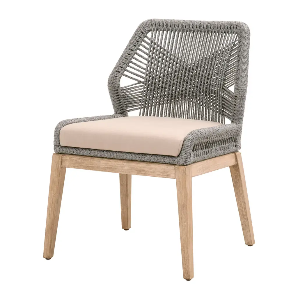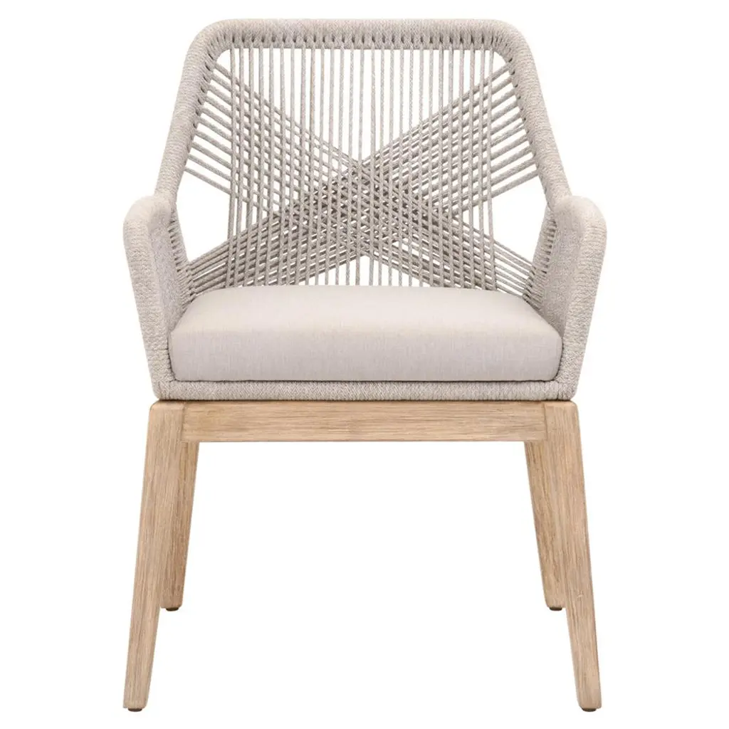 These woven arm chairs will add a touch of coastal style to your kitchen or dining space. Constructed with an Aluminum frame and solid Mahogany Gray Wood legs, these chairs are not only sturdy, but durable. A rich colored rope is tightly woven to create a unique loom design, while the wood legs have a beautiful grey finish. Paired with a fixed seat cushion, these beautiful chairs provide comfort with style and will be the perfect addition to any transitional or traditional dining room. Available in the following combinations Taupe & White Flat Rope, Pumice, Natural Gray Mahogany Platinum Rope, Light Gray, Natural Gray Mahogany FEATURES & BENEFITS New Reinforced Dual Aluminum Frame System Offers Added Strength New Thick, Fixed Seat Cushion Offers Greater Comfort Intricate Rope Weave Design Solid Mahogany Legs KD Construction Sold as a set of two Dimensions: W:23" D:26" H:33" MORE DETAILS Materials: Solid Teak Wood, Aluminum, Polyolefin Rope, 100% Olefin Fabric, Foam Seat Height: 19" Seat Width: 19" Seat Depth: 19.5" Free shipping in the U.S.