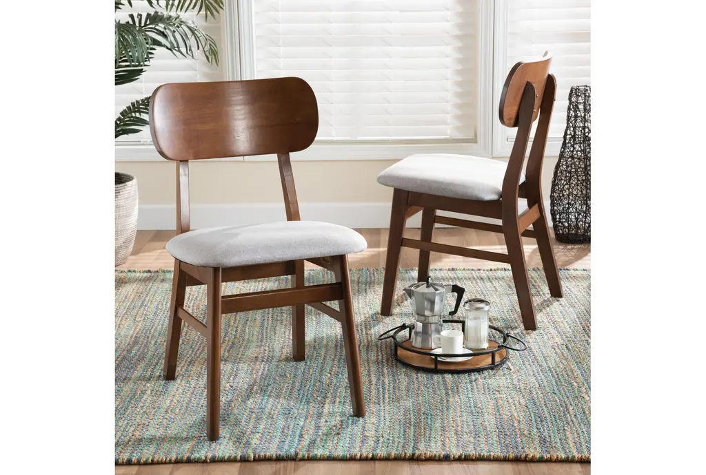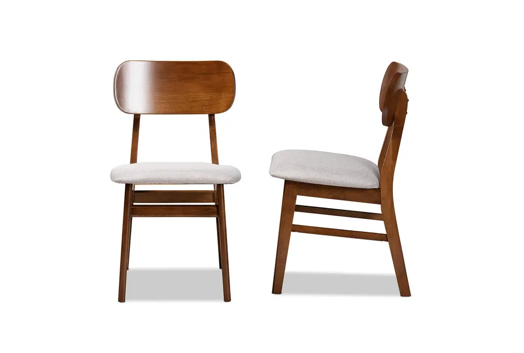 Enhance your dining experience with the Eugene Grey Fabric Upholstered and Walnut Brown Finished Wood Dining Chair Set of 2. These modern chairs feature a sleek design that seamlessly blends with various decor styles, offering both comfort and elegance. The grey fabric upholstery and walnut brown finish create a sophisticated look, perfect for any dining space.