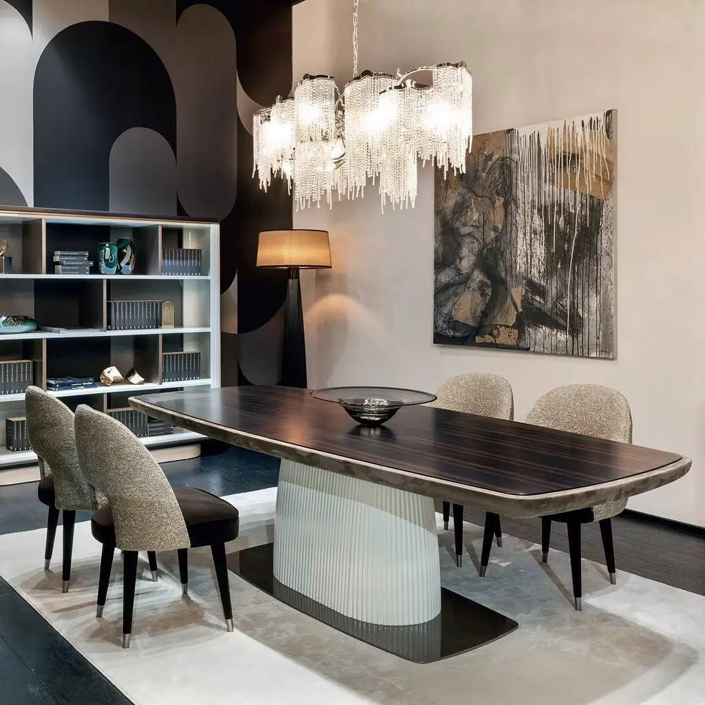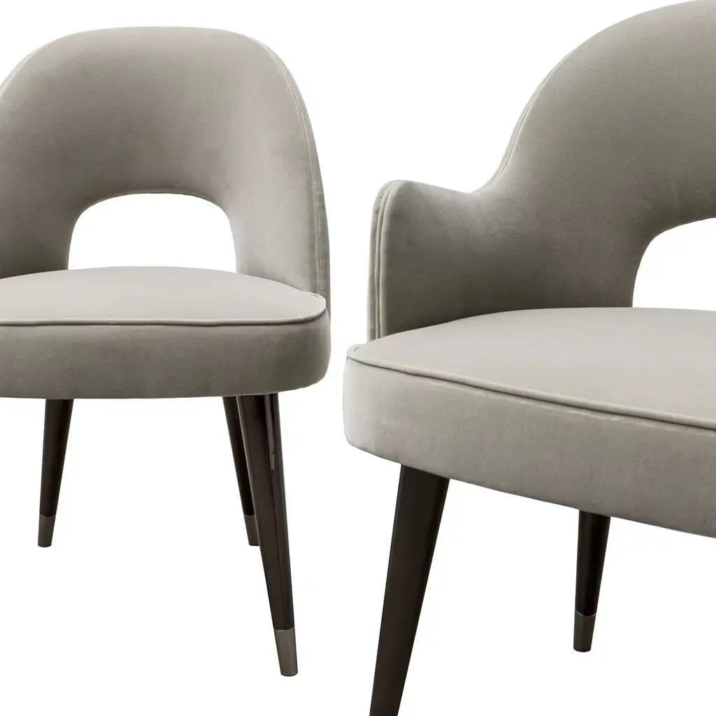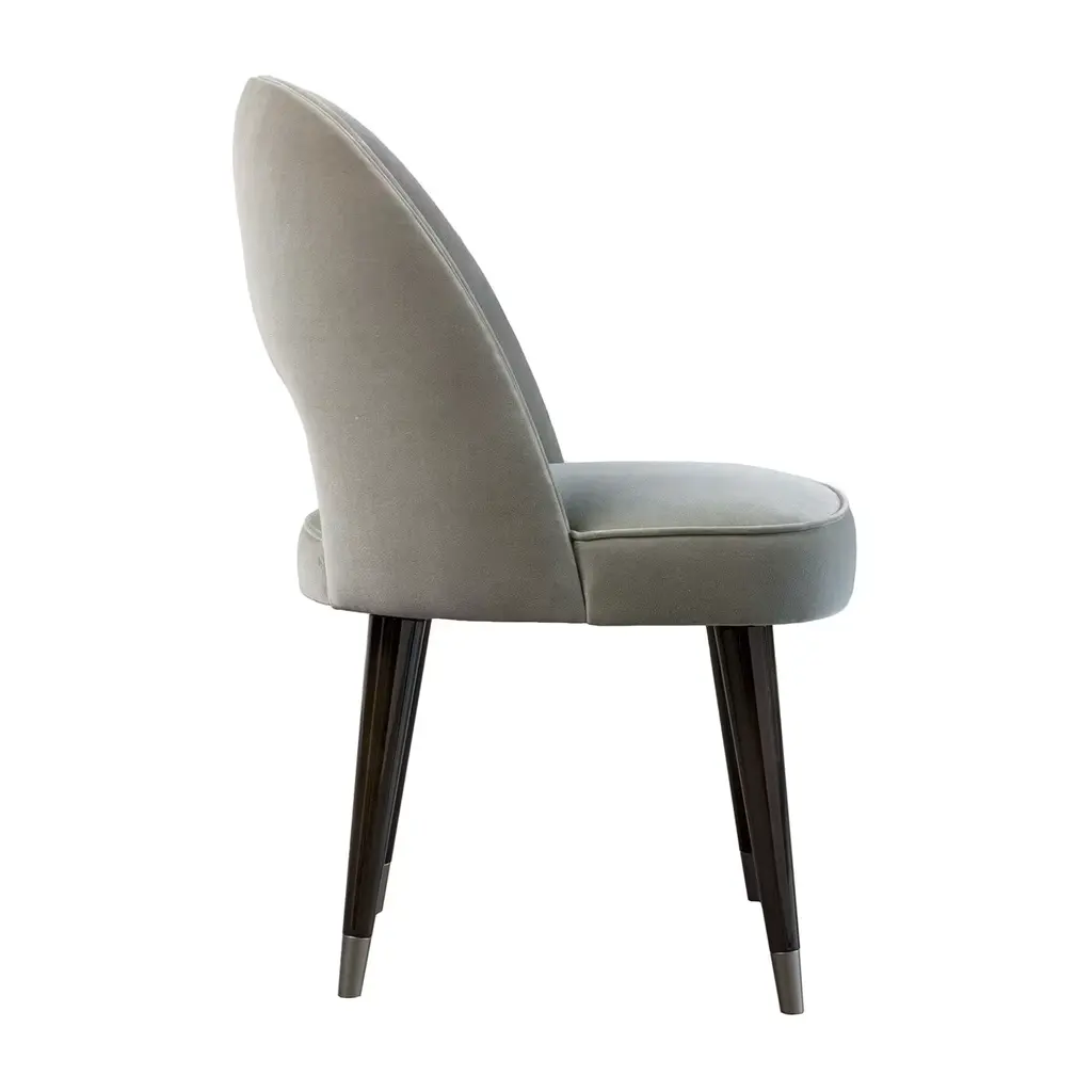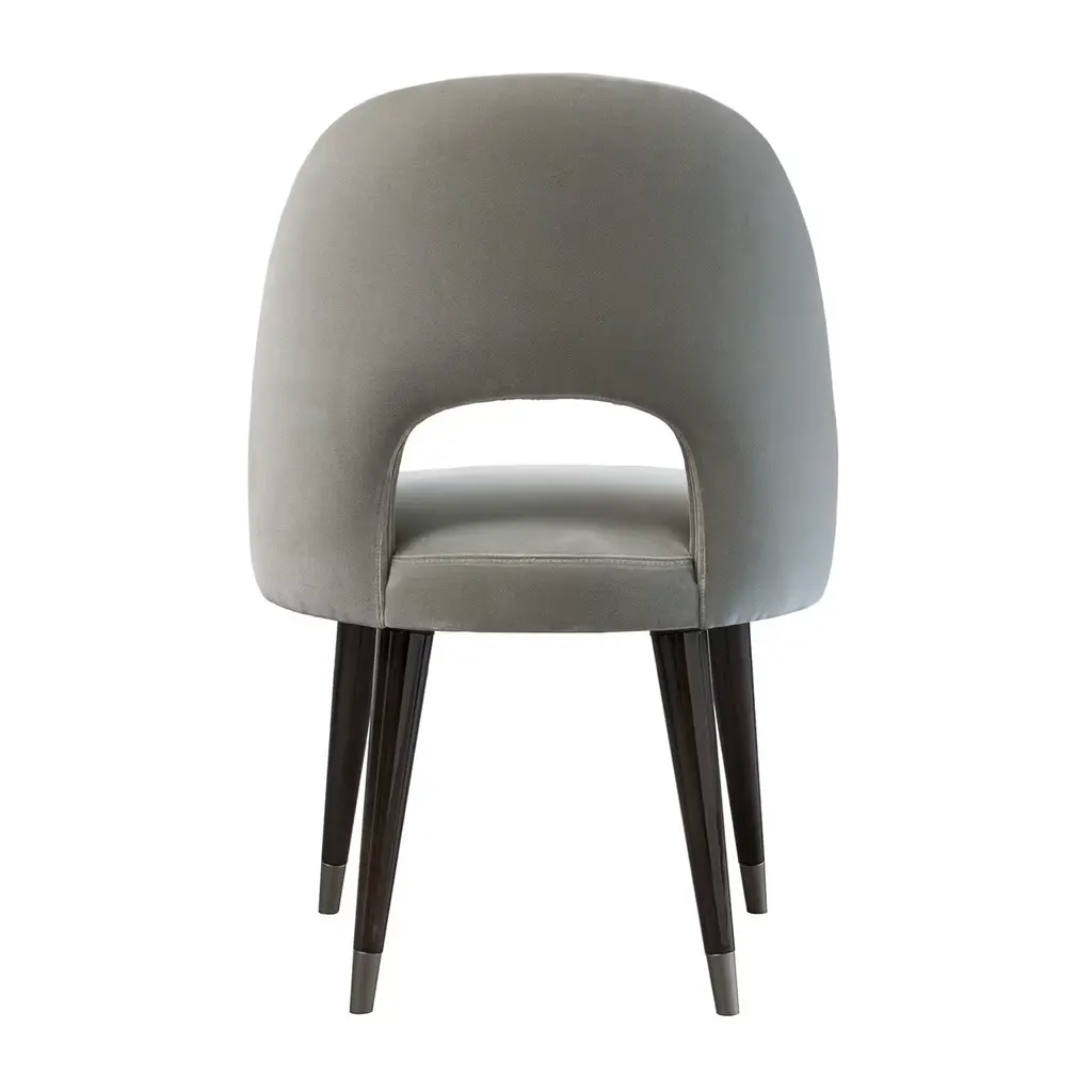 Blending retro and contemporary elements, the Eva Chair is a charming addition to dining rooms, vanities and offices alike. With mid-century modern legs, flared and capped with bronze-colored metal, the chair is padded and upholstered in the fabric of your choosing to match any mood. Also available in an armchair version.