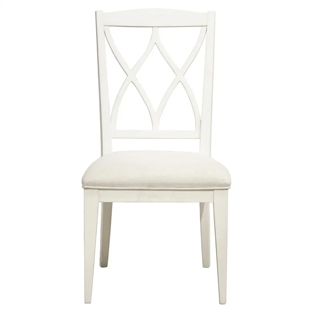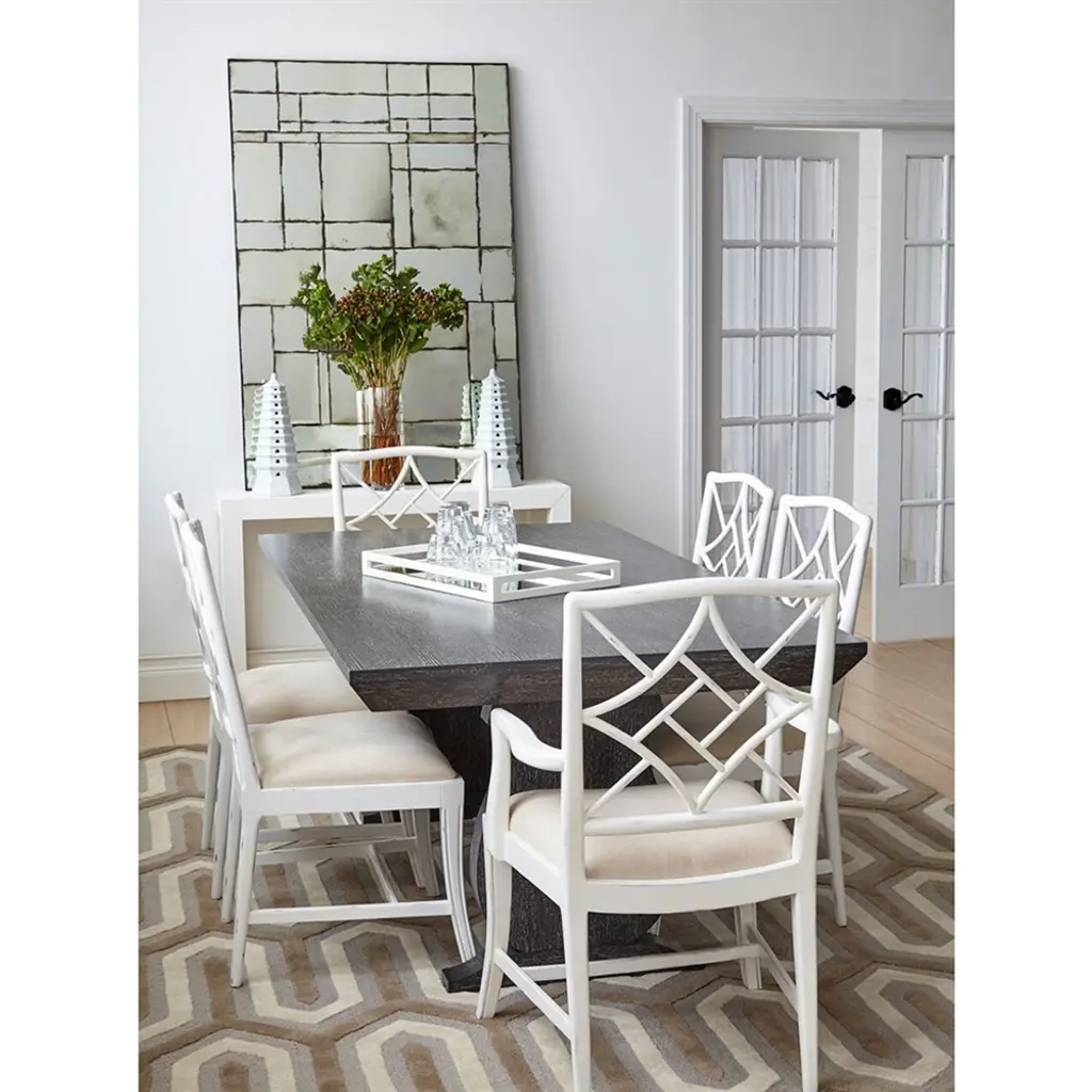 This elegant dining room chair combines Asian influences with classic Regency design. The striking seatback features intricate fretwork that is referential of traditional Chinoiserie detailing. The artfully carved, solid mahogany frame also features delicately fluted tapered legs and a curved seat covered with a plush, ivory, linen drop-in cushion. Antiqued, white, lacquered finishing gives a vintage charm to the chair that harkens back to Old Hollywood glamor and the opulent, global tastes of that bygone era.