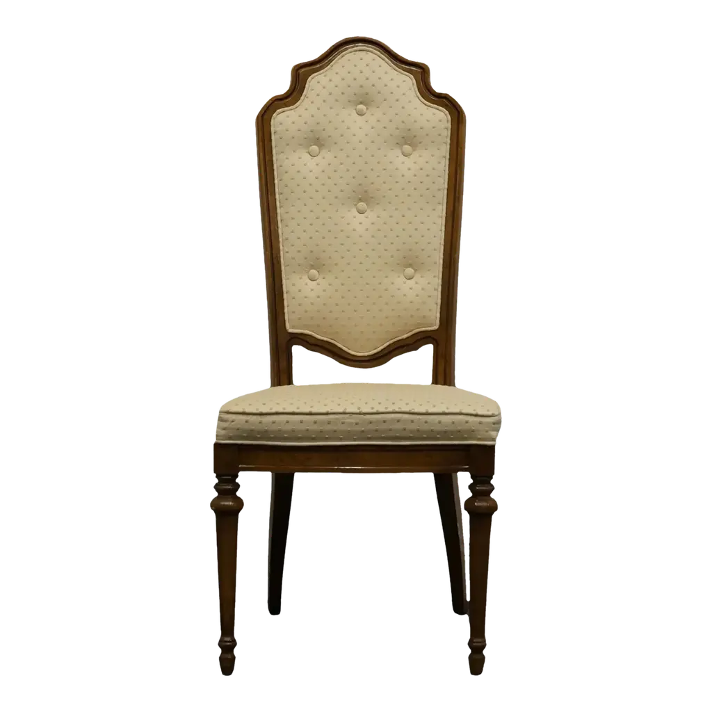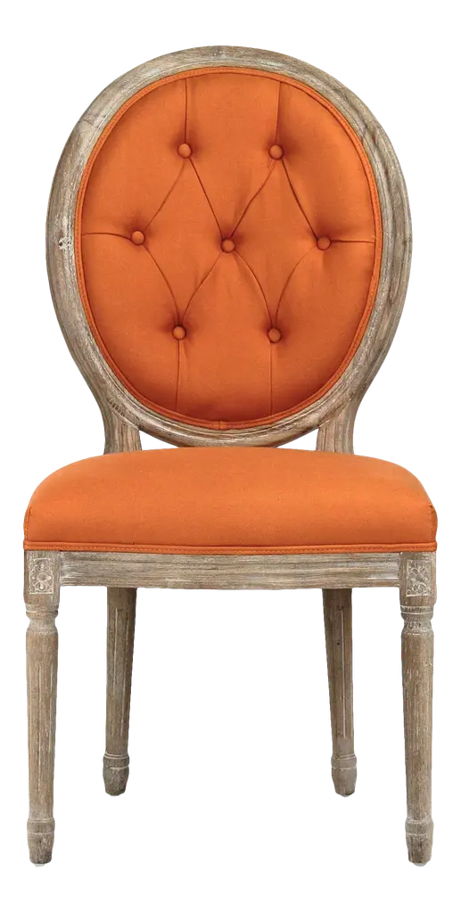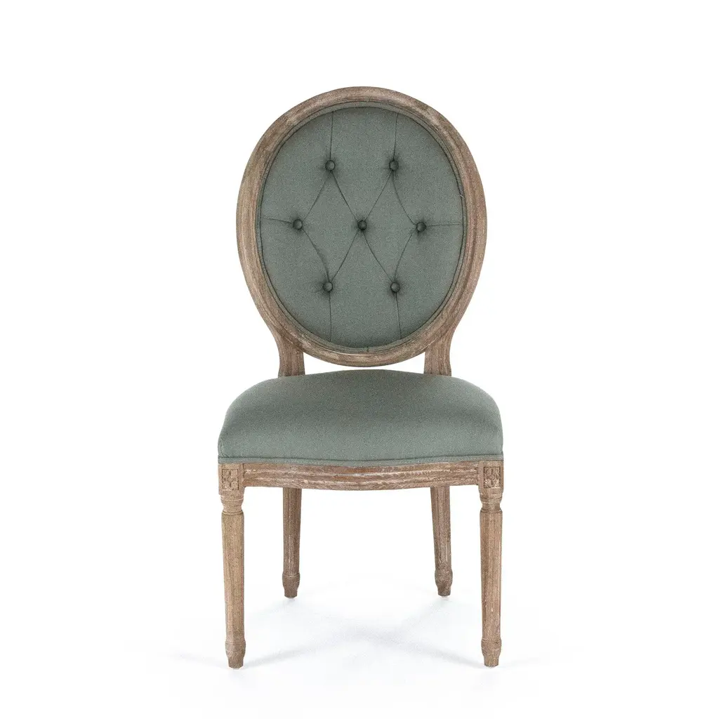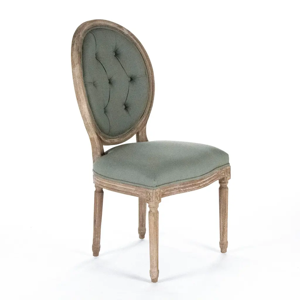 Round tufted back side chair upholstered in sage linen on limed grey oak frame.