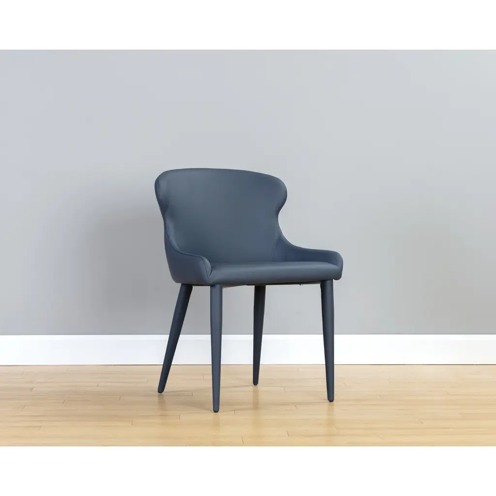 A gorgeous dining chair that features a sleek and minimal profile. Stylishly designed with tone-on-tone colours, this chair is stocked in dillon thunder faux leather and completed with metal upholstered legs. Handle With Care: This design has been crafted with faux leather. Faux leather is manufactured to reflect the natural characteristics of leather as such, colour variations, markings wrinkles, grooves, and light scratches are appreciated characteristics. No two pieces will be alike. Visit our Product Care page for more information on how to ensure the lasting beauty of this piece.