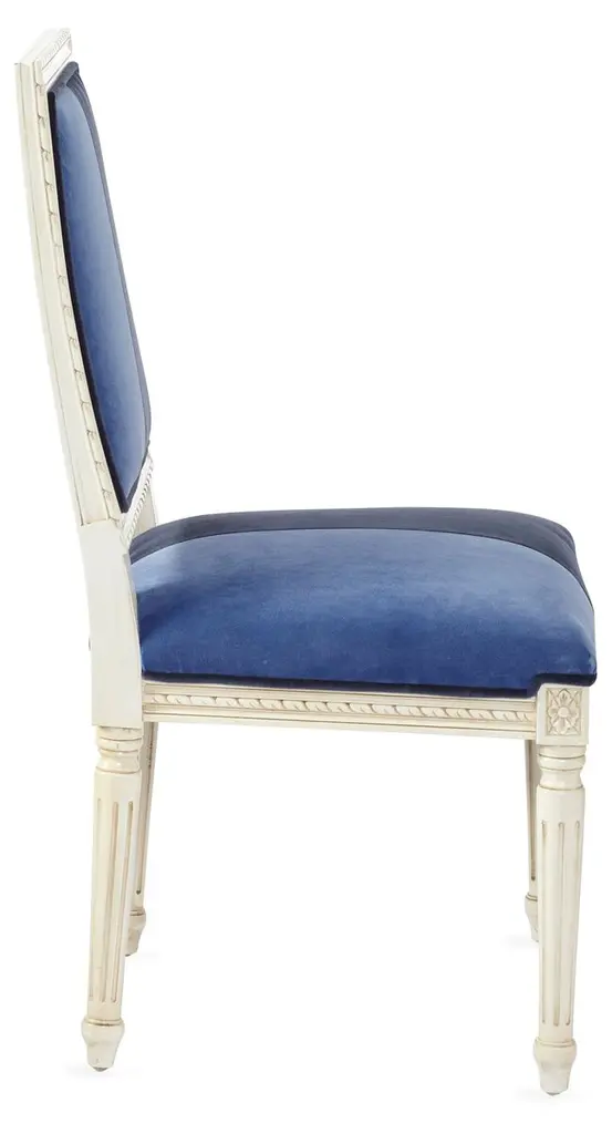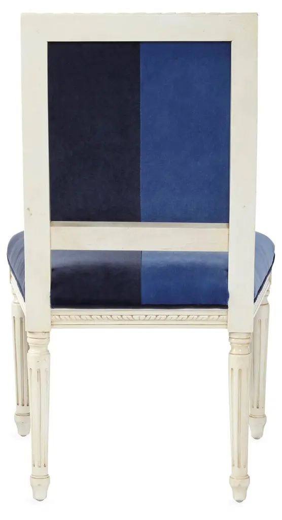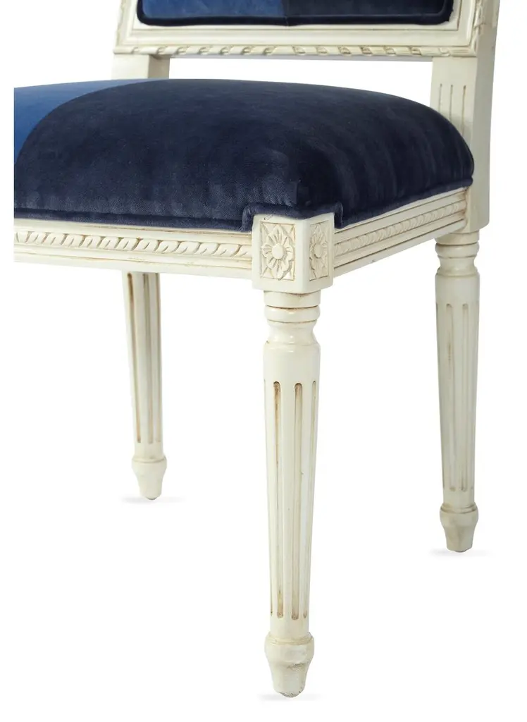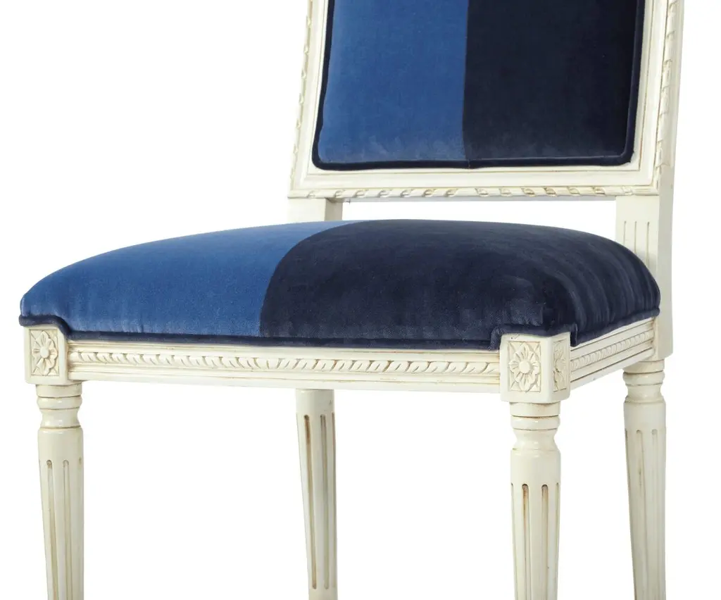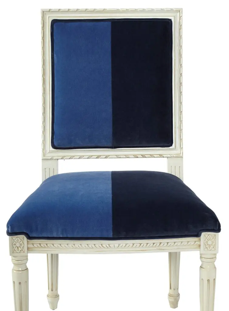 Designed by us and available only at One Kings Lane: This versatile, French-inspired side chair showcases a masterfully carved Indonesian mahogany frame and two-tone blue velvet upholstery for an unexpected finishing touch. A generous fill of foam wrapped in down with a cotton duck core ensures lasting comfort and support. Made in the USA.
