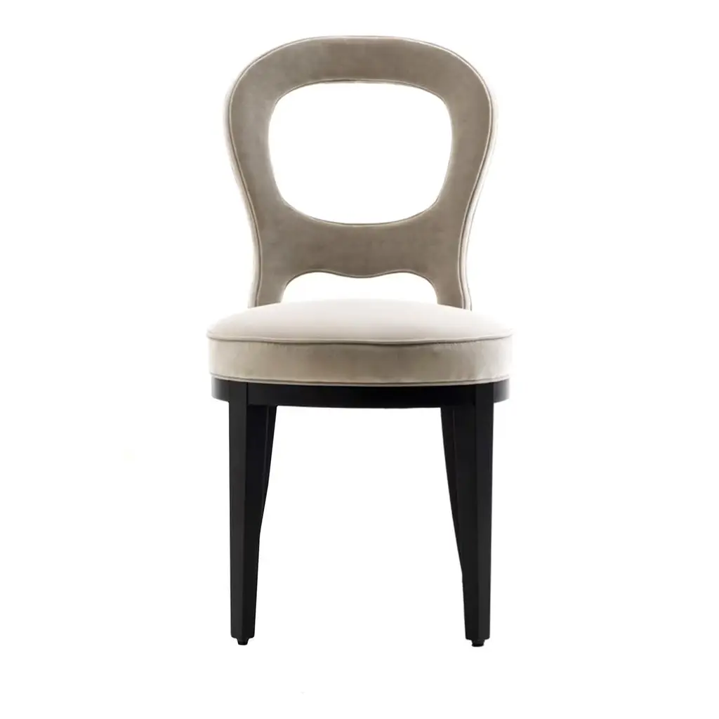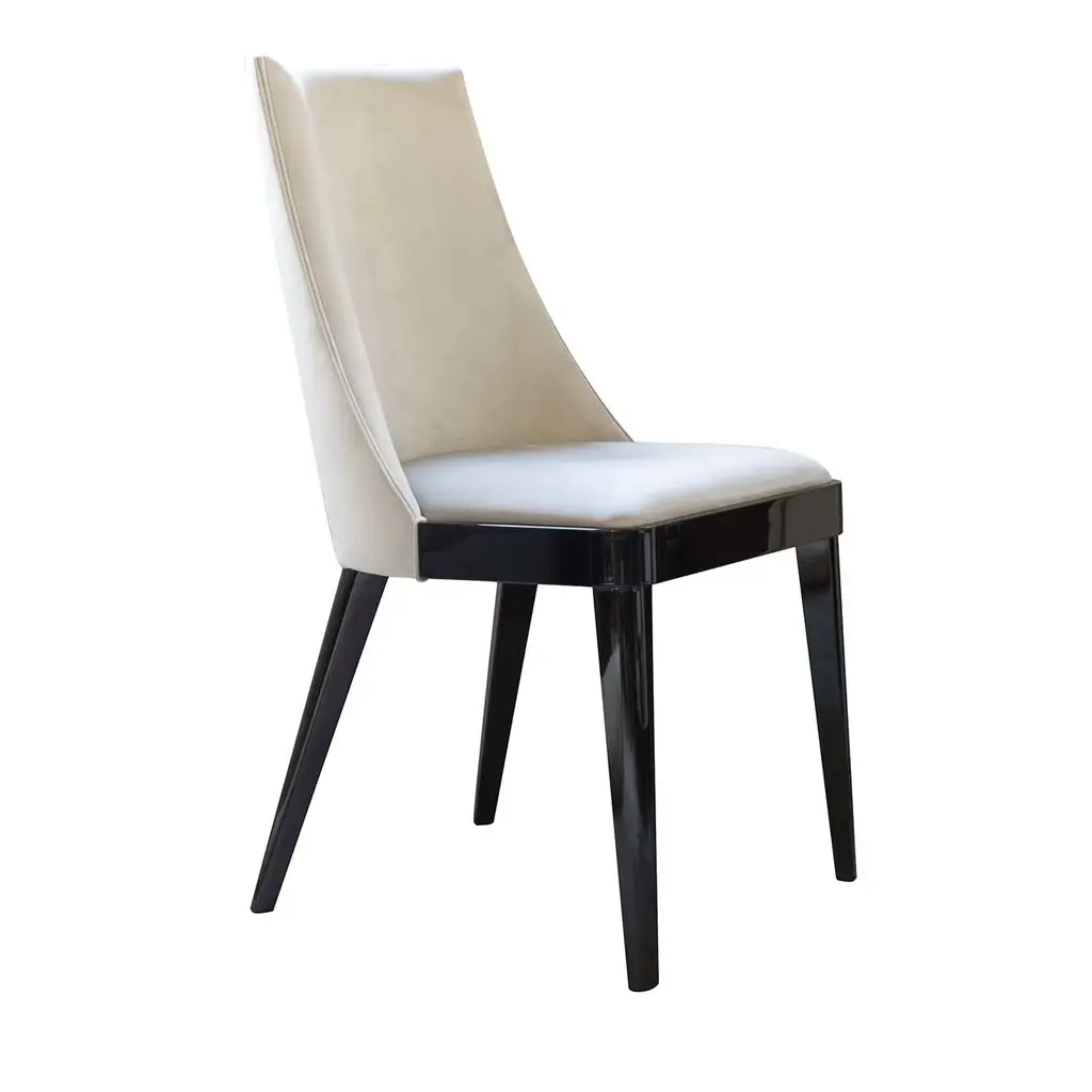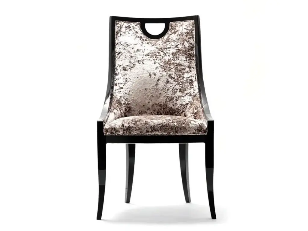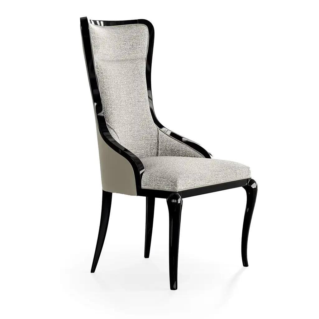 An elegant complement to a dining room or living room decor of modern sophistication, this chair will make for an exquisite head-of-the-table as well as the perfect lieu to enjoy a good book. Handmade of polished black wood, its sinuous and elegant silhouette is enriched with a gorgeous beige patterned fabric upholstery.