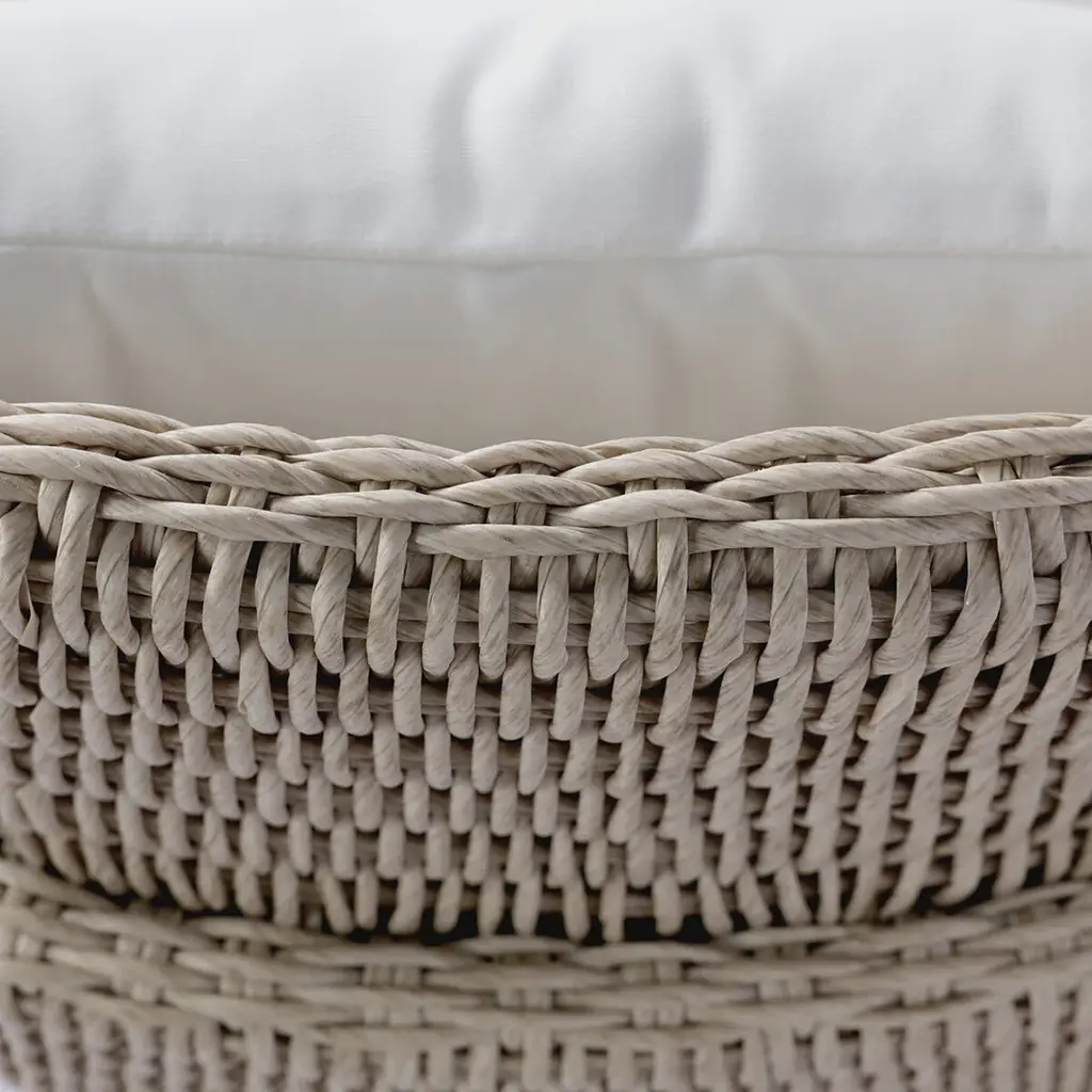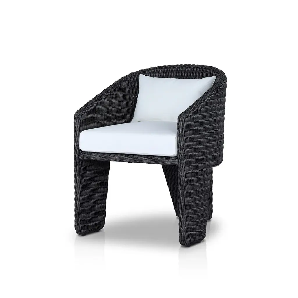 A unique three-leg outdoor dining chair based on the popular indoor silhouette. All-weather wicker framing forms a barrel-shaped back and kick back detail on the leg, accented by a box seat cushion with knife edge back cushion. Covered in 100% olefin, known for its UV-resistant, water-repellent and quick-drying abilities. Cover or store indoors during inclement weather and when not in use. Ships In 10-14 Business Days Ships In 10-14 Business Days All-weather cushion All-weather woven wicker frame This image is for illustrative purposes only. The colors shown are accurate within the constraints of lighting, photography, and the color accuracy of your screen.