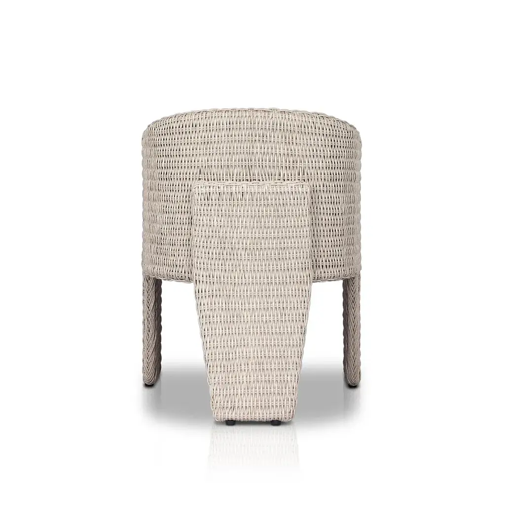 A unique three-leg outdoor dining chair based on the popular indoor silhouette. All-weather wicker framing forms a barrel-shaped back and kick back detail on the leg, accented by a box seat cushion with knife edge back cushion. Covered in 100% olefin, known for its UV-resistant, water-repellent and quick-drying abilities. Cover or store indoors during inclement weather and when not in use. Ships In 10-14 Business Days Ships In 10-14 Business Days All-weather cushion All-weather woven wicker frame This image is for illustrative purposes only. The colors shown are accurate within the constraints of lighting, photography, and the color accuracy of your screen.