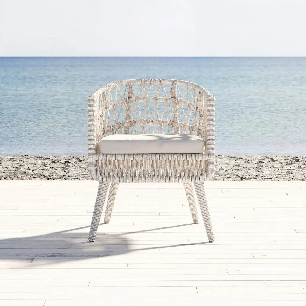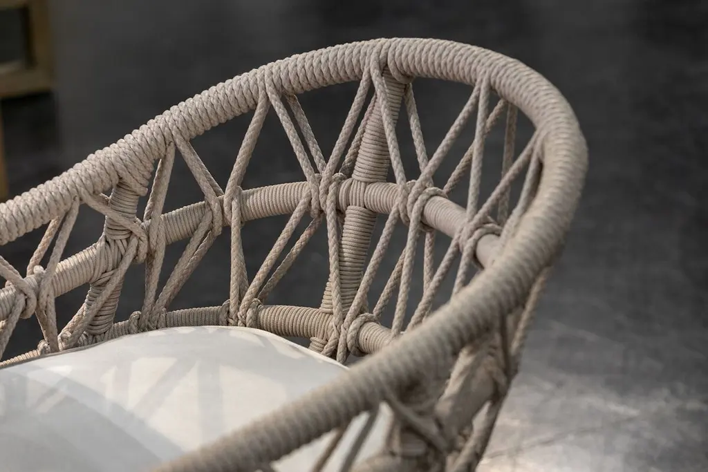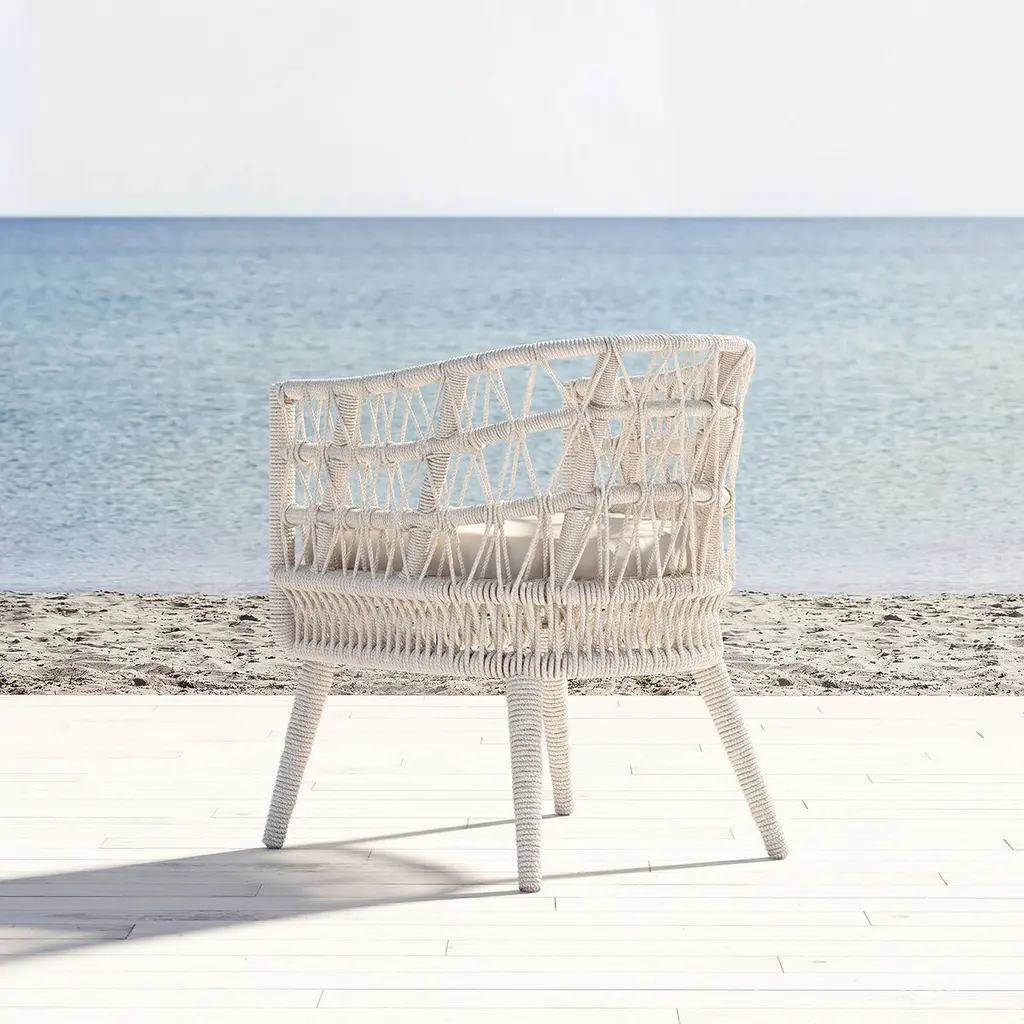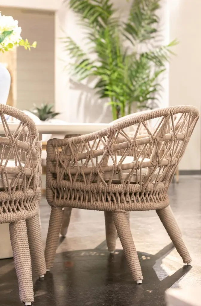 The Farah Rope Dining Chair is the perfect balance of intricate pattern combined with an organic, free-flowing aluminum structure. The macrame-inspired bucket frame features a curved back and sloped arm, expertly wrapped in premium all-weather olefin rope.