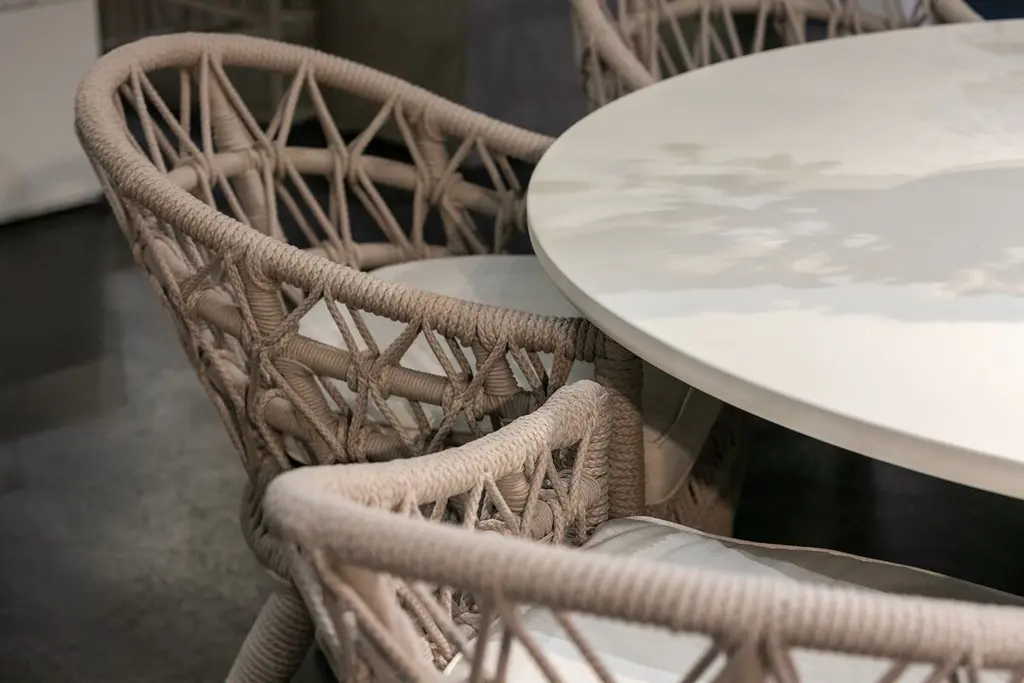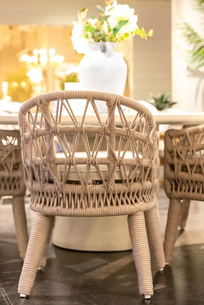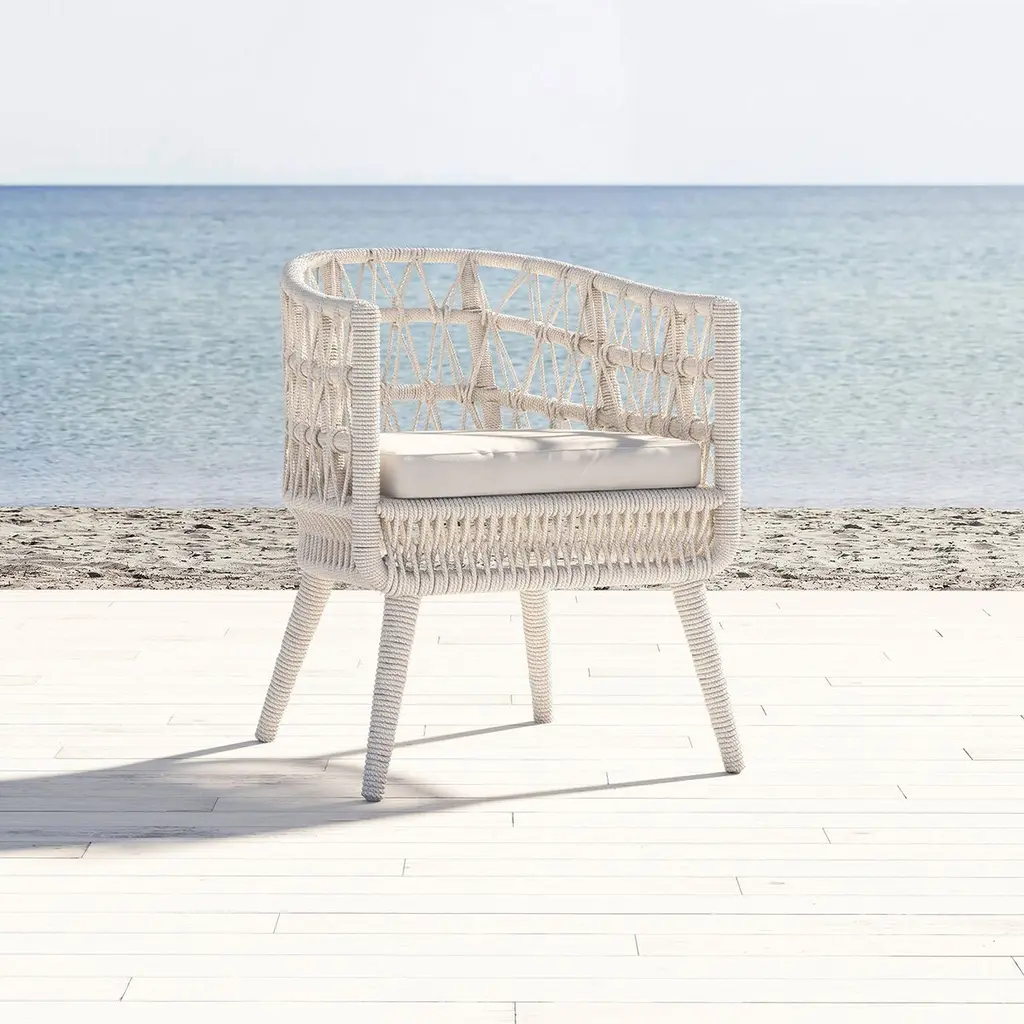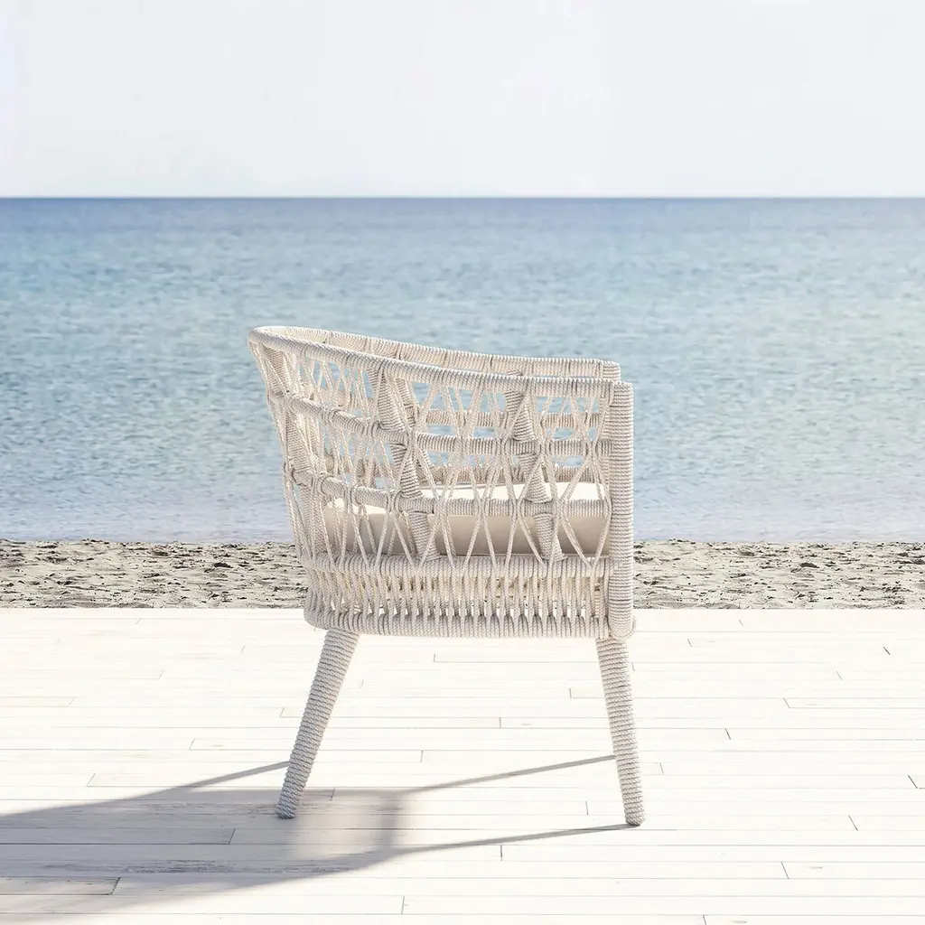 The Farah Rope Dining Chair is the perfect balance of intricate pattern combined with an organic, free-flowing aluminum structure. The macrame-inspired bucket frame features a curved back and sloped arm, expertly wrapped in premium all-weather olefin rope.