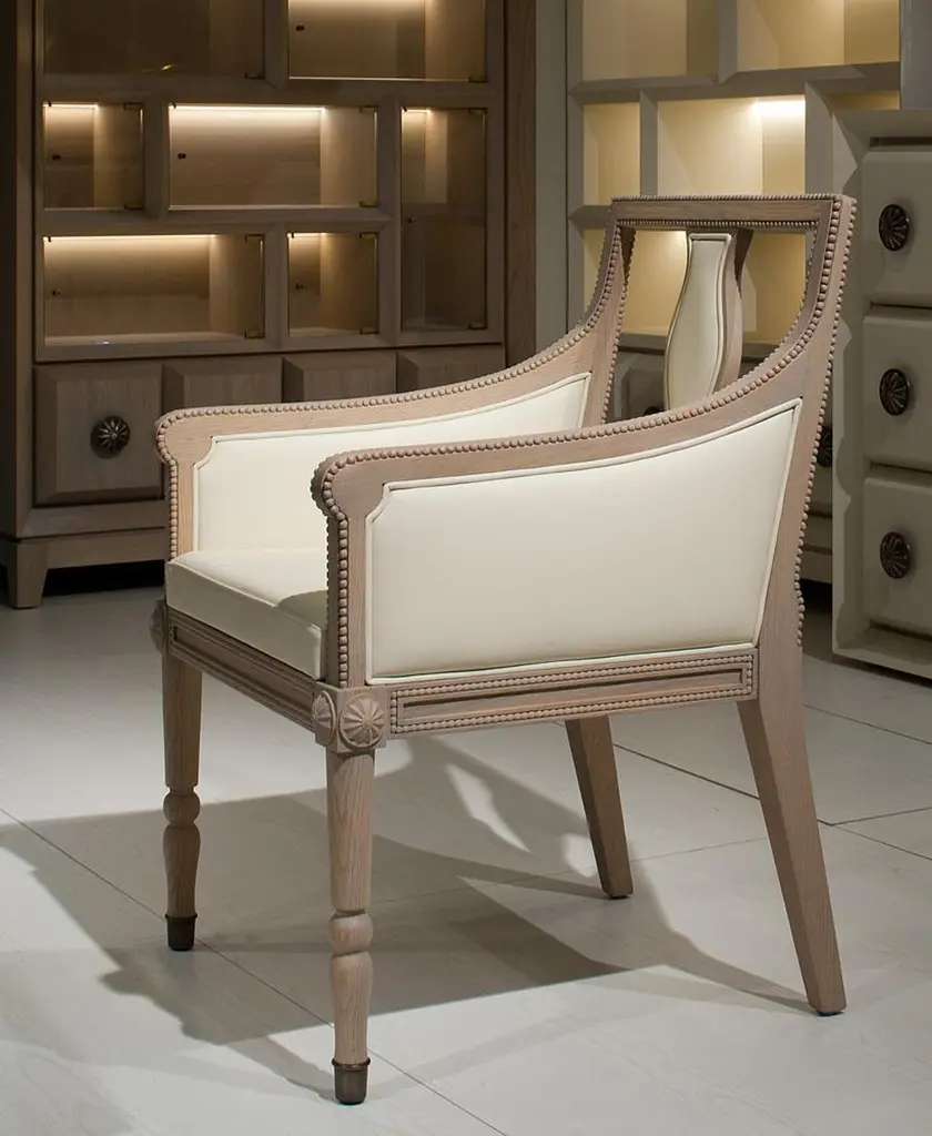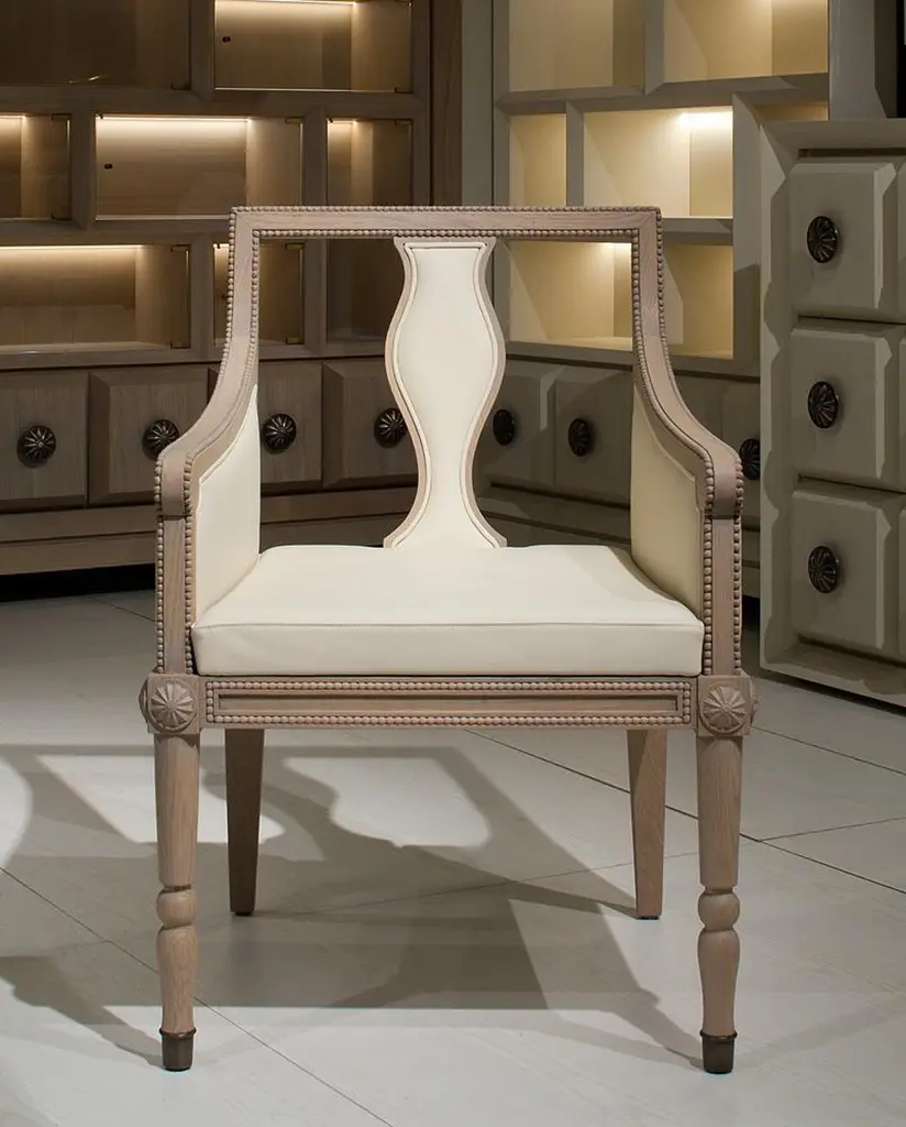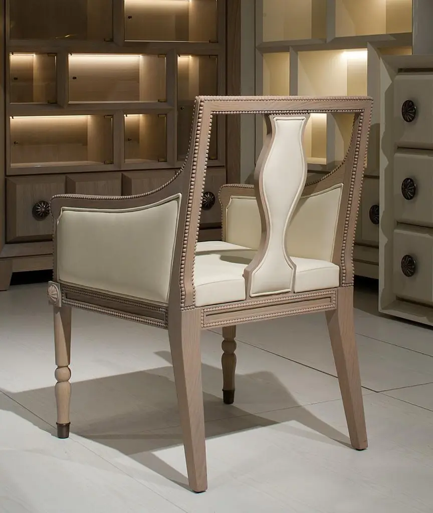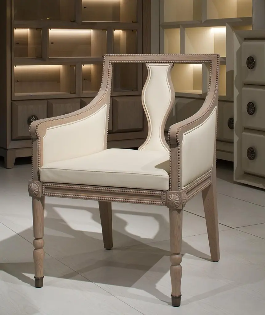 Introducing the exquisite Farmer George dining armchair—a masterpiece born from the collaborative vision of Archer Humphryes Architects for the After Adam collection. Crafted with precision, this small armchair is designed for both dining and lounge areas, reflecting a harmonious blend of Neoclassic inspiration and contemporary finesse. The natural oak backseat features a meticulously carved central shape, adorned with delicate details that pay homage to tradition while embracing a stylized elegance. The Farmer George is not just a piece of furniture; it's an embodiment of sophistication. With a light-colored leather upholstery that complements its wooden frame, brass-tipped front legs, and a flawless natural oak finish, this chair is the epitome of timeless charm—perfect for elevating any space, whether classic or contemporary.