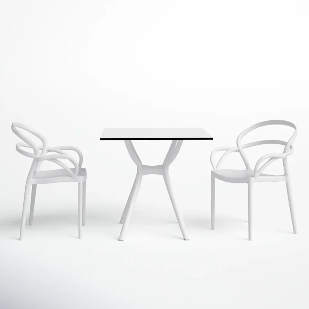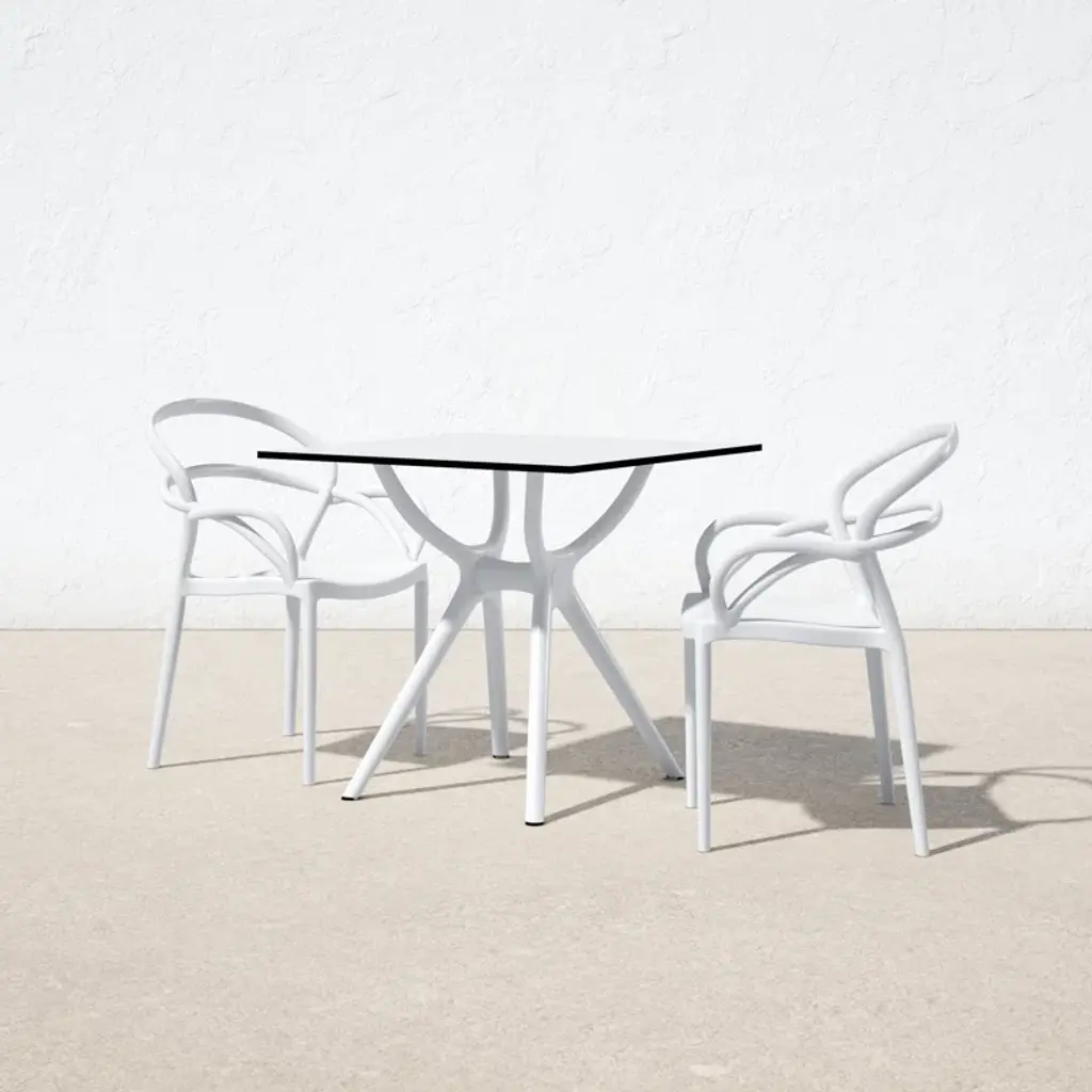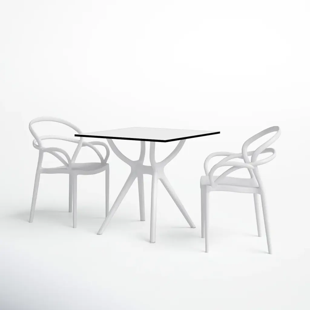 Maximize your outdoor space with this 3-piece patio dining set that draws on bold, flowing silhouettes and resilient materials. Each piece is crafted from marine-grade resin, so they stand up to weather, water, and UV-light. The table has a clean-lined silhouette with a square surface that's set on a trestle base with U-shaped supports. The chairs feature a sleek design with looping elements that form the arms and back. This set includes two chairs and a table, and requires partial assembly.