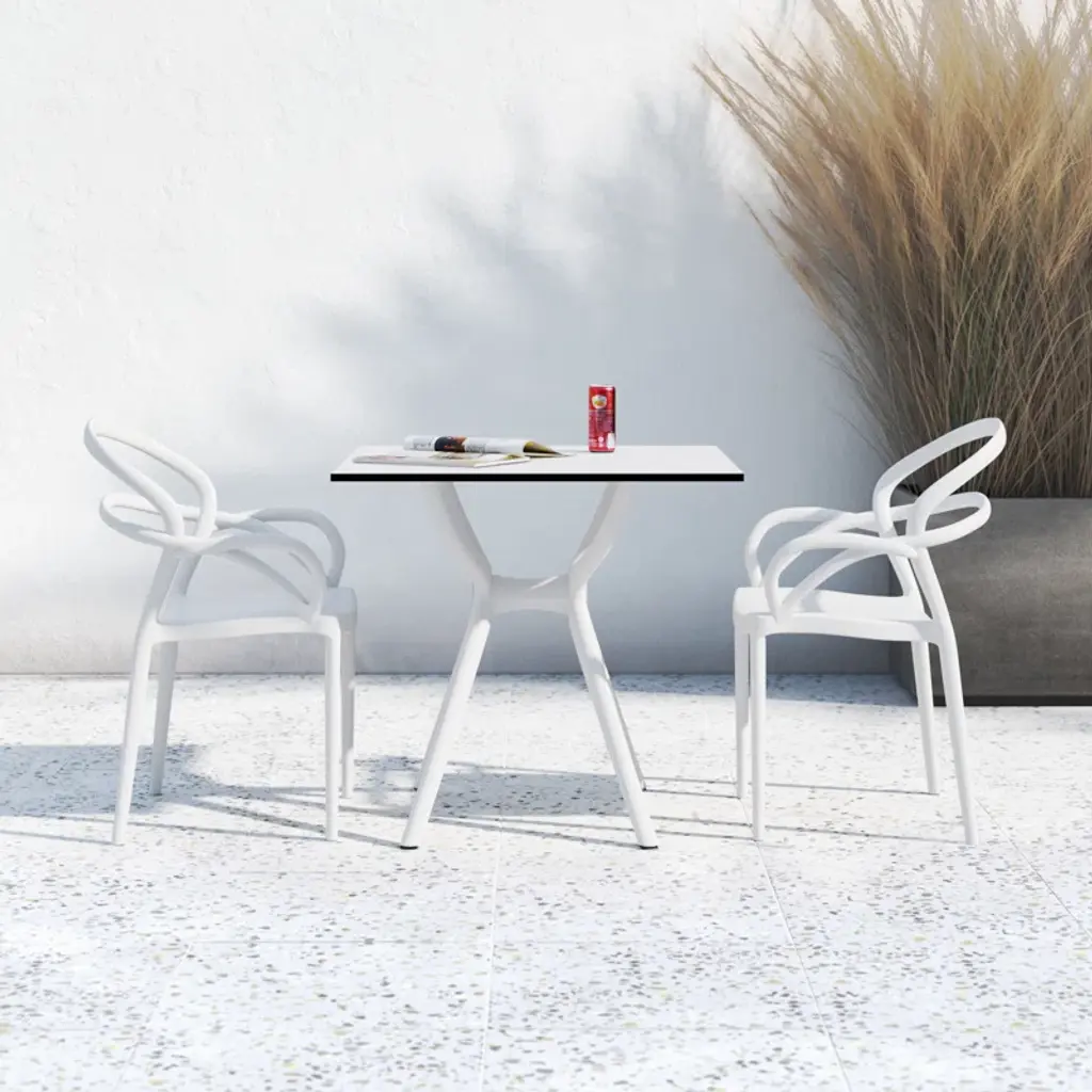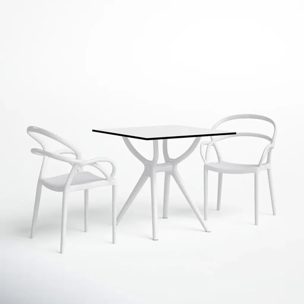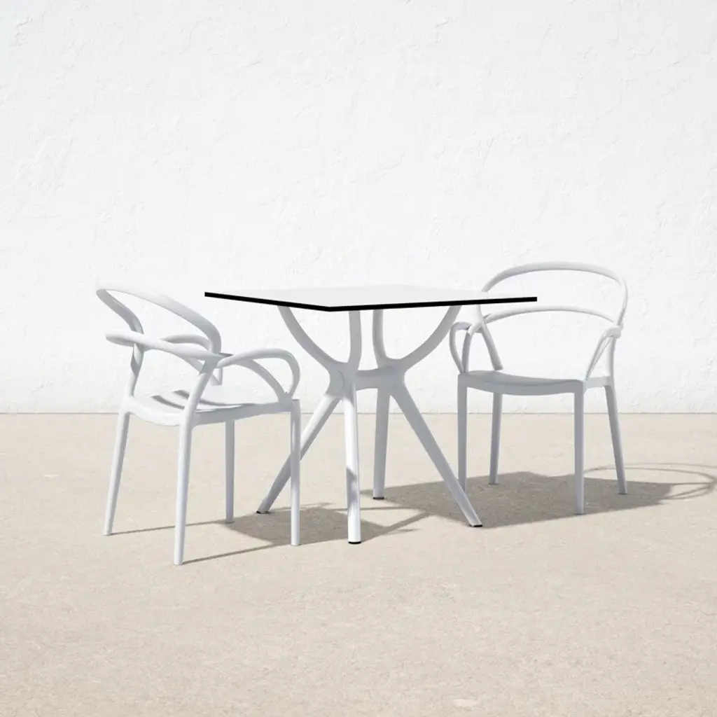 Maximize your outdoor space with this 3-piece patio dining set that draws on bold, flowing silhouettes and resilient materials. Each piece is crafted from marine-grade resin, so they stand up to weather, water, and UV-light. The table has a clean-lined silhouette with a square surface that's set on a trestle base with U-shaped supports. The chairs feature a sleek design with looping elements that form the arms and back. This set includes two chairs and a table, and requires partial assembly.
