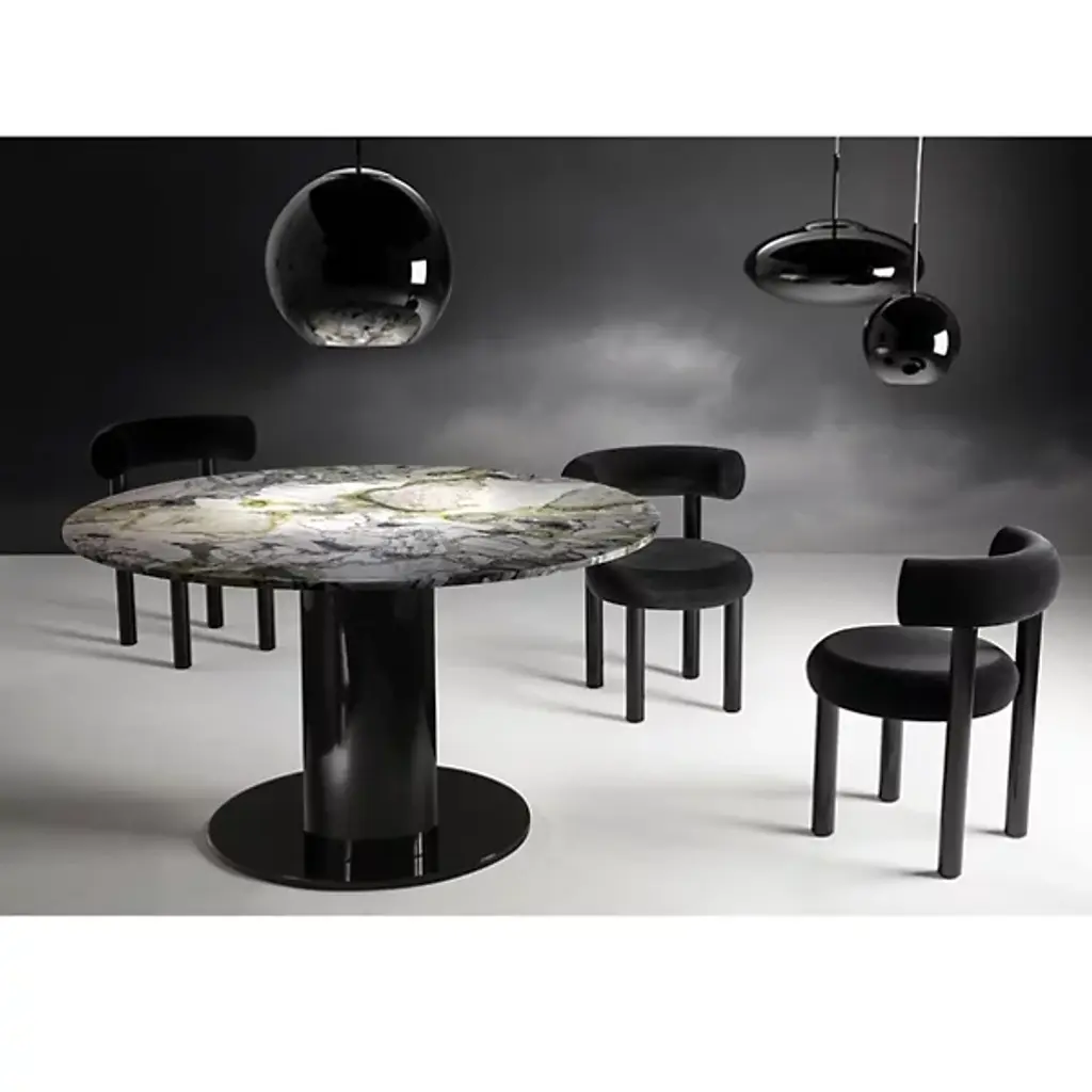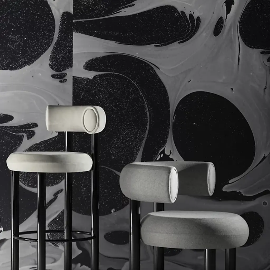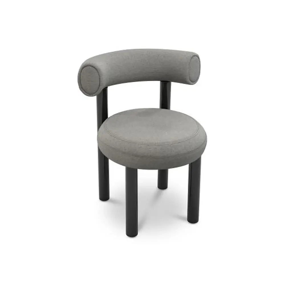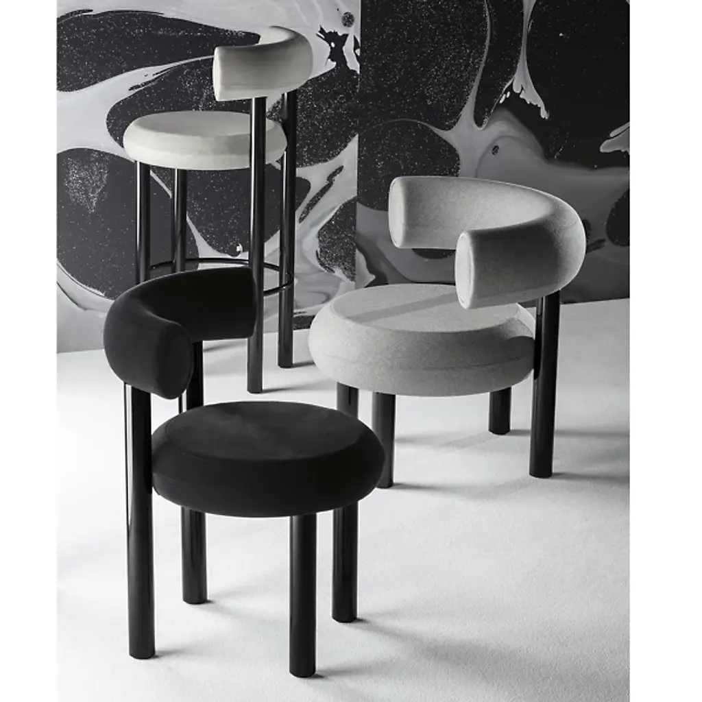 Make a soft and stylish addition to your inside spaces with the fabulous, flexible design of the Fat Dining Chair from Tom Dixon. Made in Europe and hand-finished by artisans, it relies on four columnar metal legs to support a soft puck seat with a beveled edge, while a curving backrest caps off the carefully engineered comfort. The matte material stretched over foam upholstery contrasts well with the glossy finish of the metal support structure, creating an enduring elegance.