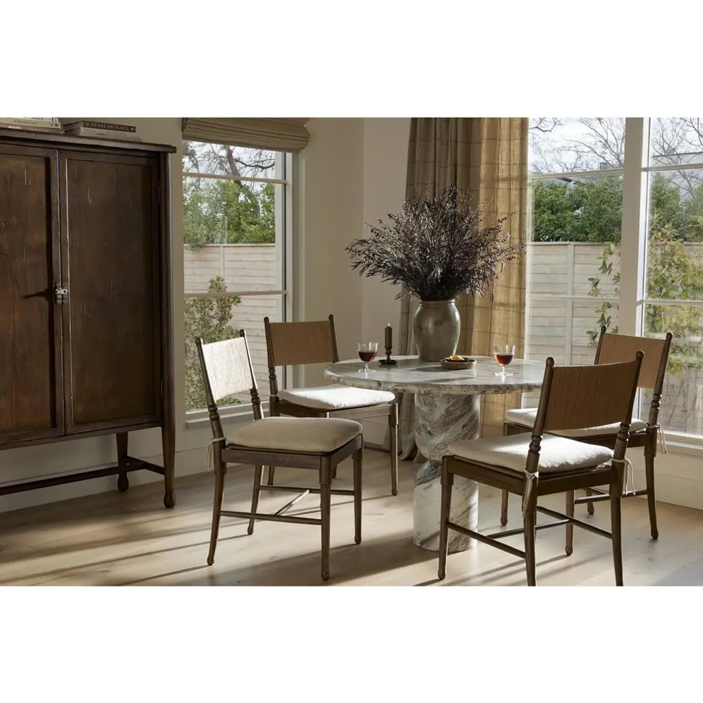 A design collaboration by Amber Lewis and Four Hands. Classic meets current. Simplified turn shaping meets subtly curved legs to elevate a clean, traditional frame of walnut-finished solid ash, with a textural back of soft paper cord. Pairs with a neutral linen seat cushion.