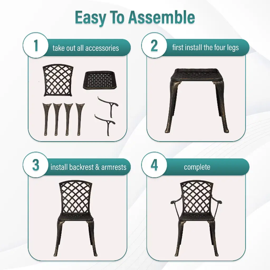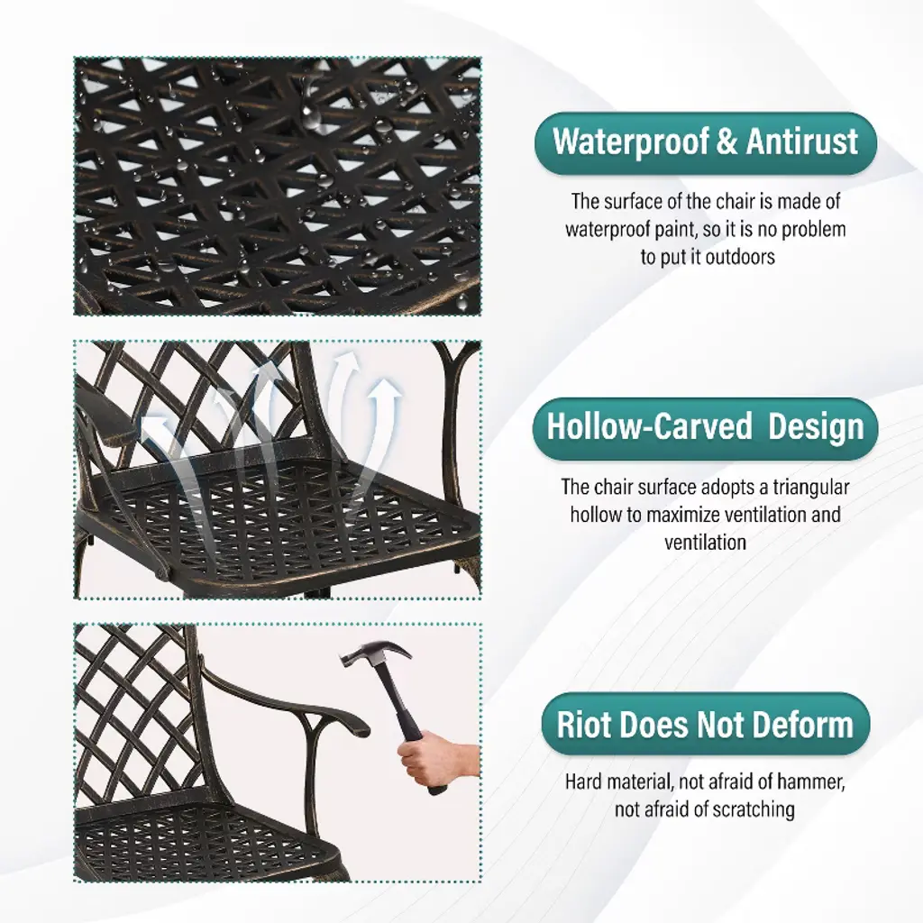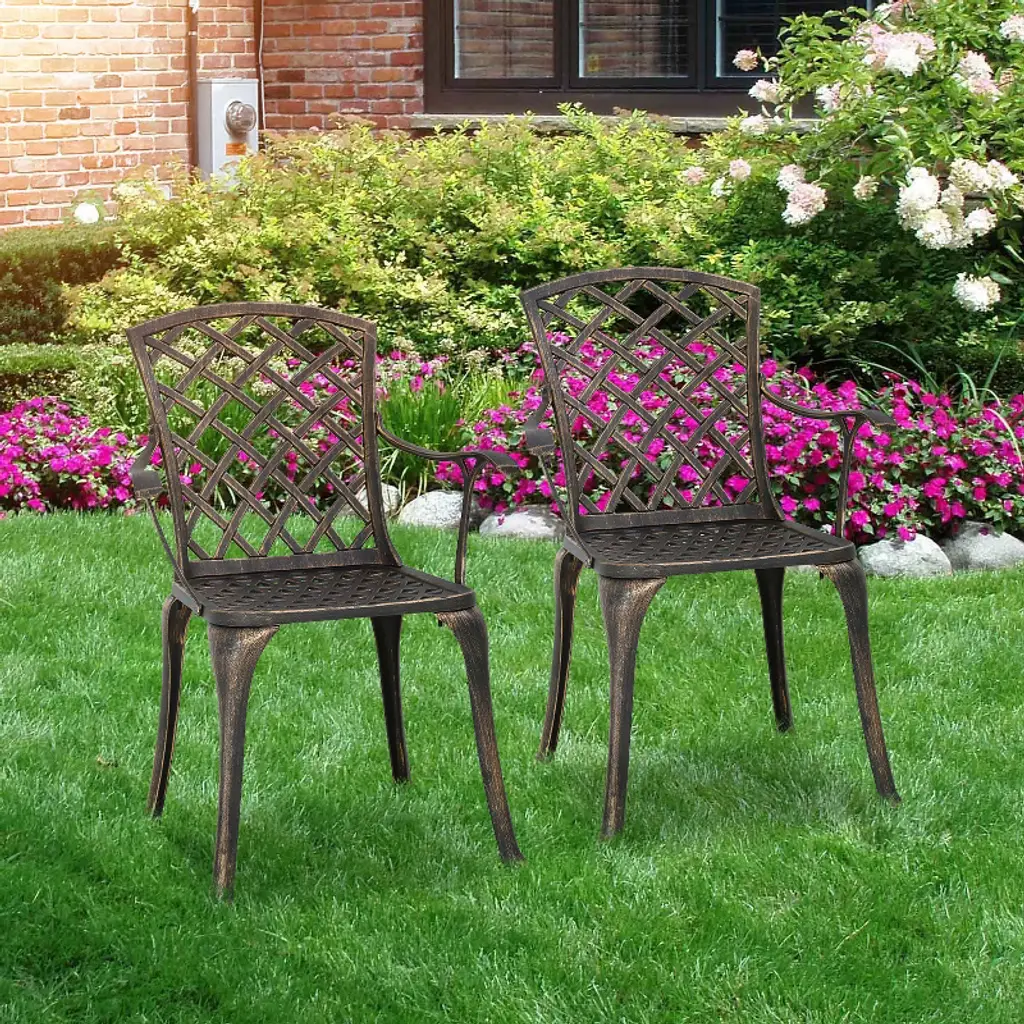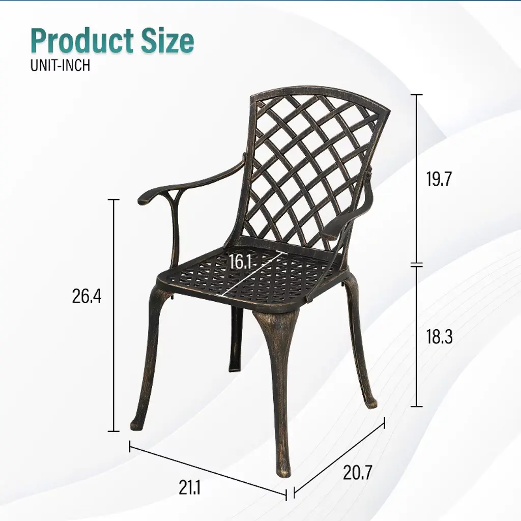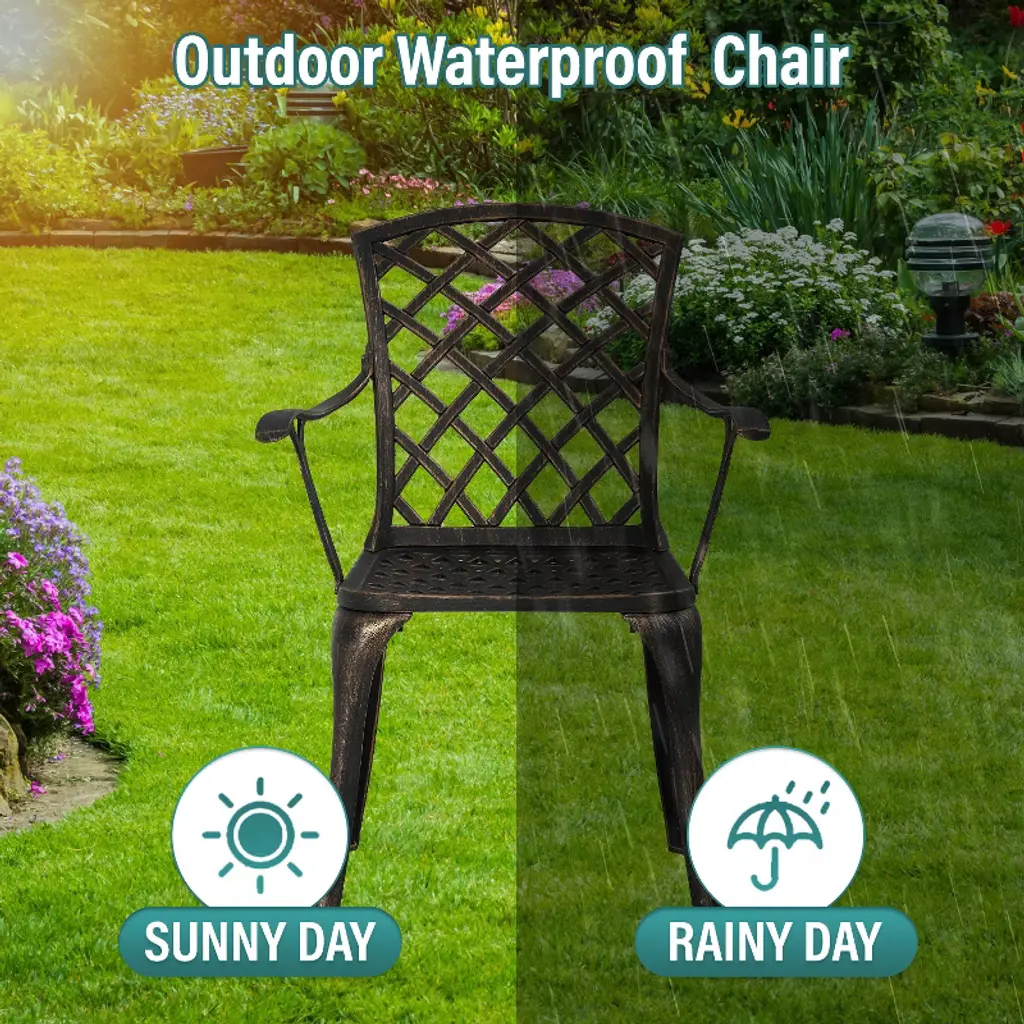FDW Outdoor Chairs are ideal for giving your patio or yard a dash of sophistication. These chairs are strong and aesthetically pleasing, made of wrought iron with a gorgeous bronze finish. Intricate lattice work lends a distinctive touch, and cozy seating guarantees enjoyment and relaxation. These chairs are a great complement to any outdoor area, whether they are being used for dining outdoors or just relaxing.