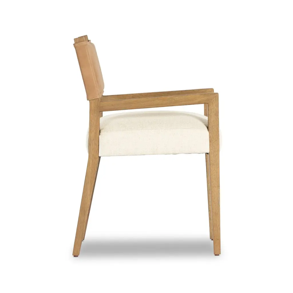 Upgrade your dining experience with the stylish Ferris Dining Armchair from Four Hands. Made with a combination of top-grain leather and high-performance fabric, this armchair is designed to withstand spills, stains, and wear. The black parawood frame adds a modern touch, making it the perfect addition to the head of your table. Enjoy long-lasting comfort and unmatched durability with this mixed material armchair. Highlights