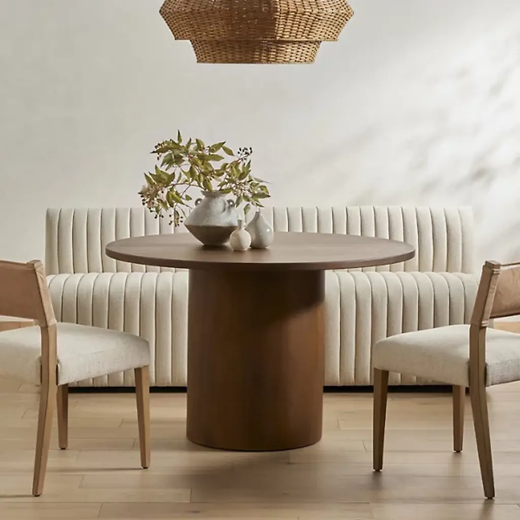 The Ferris Dining Chair, Set of 2 from Four Hands is a gorgeous example of mixed-material construction. A memorable addition to living and dining spaces, enhancing its surroundings with clean contemporary lines. Supported by a sturdy frame made of solid parawood, its soft seat contrasts well with the banded leather back, creating a sense of openness and flexibility suitable for various arrangements. The back is luxurious top-grain leather, while the seat itself is sheathed in high-quality fabric able to withstand daily use and spills alike for an enduring dining experience.