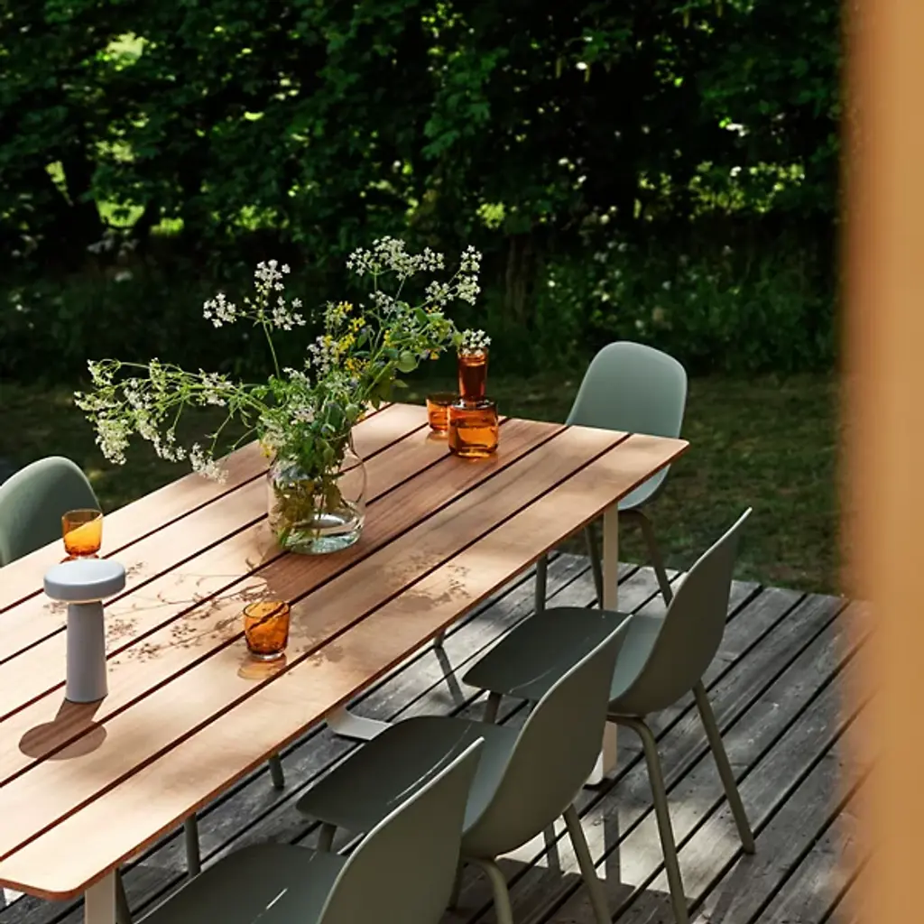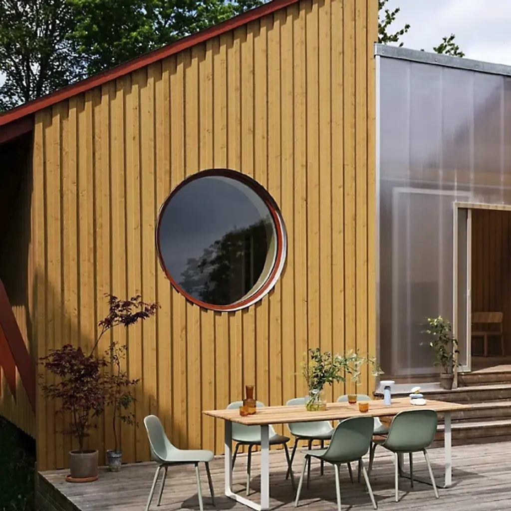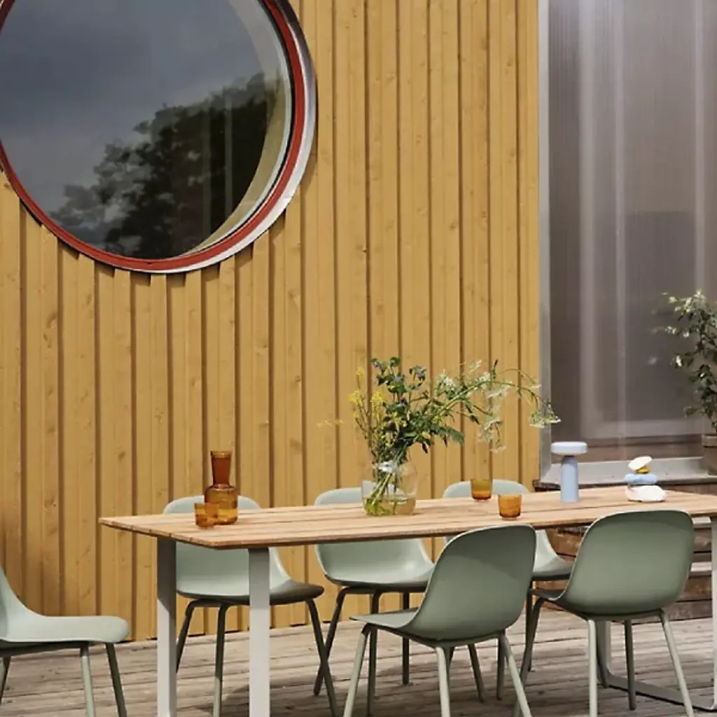 The Fiber Outdoor Side Chair by Muuto is designed for ultimate comfort, with curves that embrace the body. Crafted with sustainability in mind, its shell is made from 100 percent recycled plastics and up to 25 percent FSC-certified wood fibers. The traditional Scandinavian oak lacquer finish on both the shell and wood base ensures water and fungi resistance, as well as exceptional strength for longevity. Versatile, comfortable, and stylish, this armchair is perfect for any outdoor space.