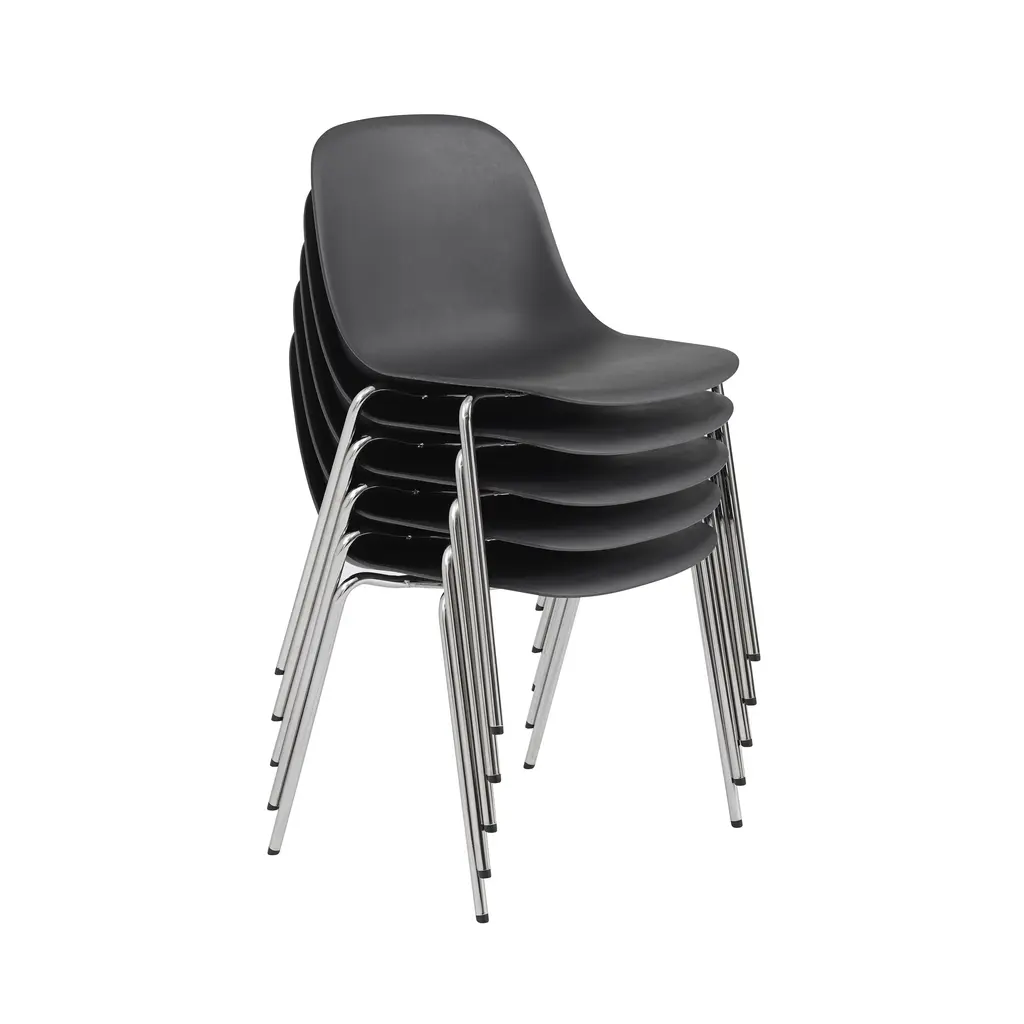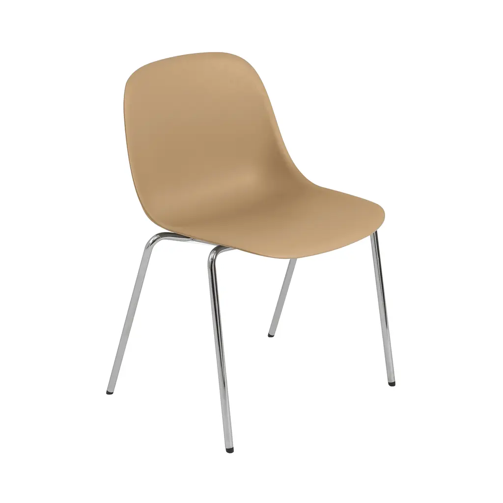 Fiber brings a new perspective to the iconic Scandi shell chair through its innovative composite of recycled plastic (min. 80% recycled) and FSC-certified wood fibers. The natural fibers blend into the surface for a matte finish and add a soft, inviting touch to its friendly, embracing curves that provide extensive comfort. Side chair with chrome legs and glides stackable up to 15 units.