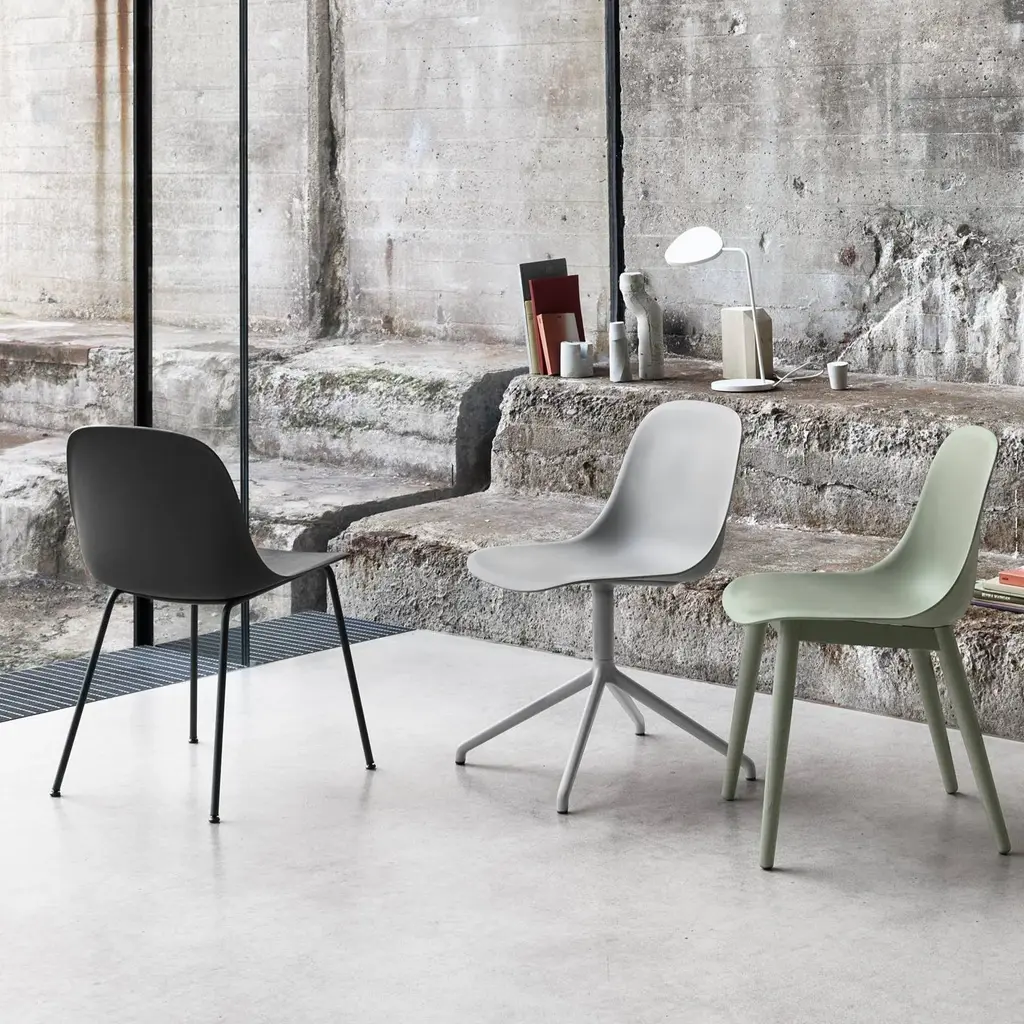 With its well-considered comfort and lightweight profile, Fiber's side chair from Danish designers Iskos-Berlin readily partners with a desk or dining table. Produced from an innovative plastic material that includes 25 percent wood fibers, the molded seat has a textured, matte surface and soft inviting touch. Available in a range of characteristically Nordic shades, the chair seat and matching tube base in powder-coated steel also take up little space in limited environs.