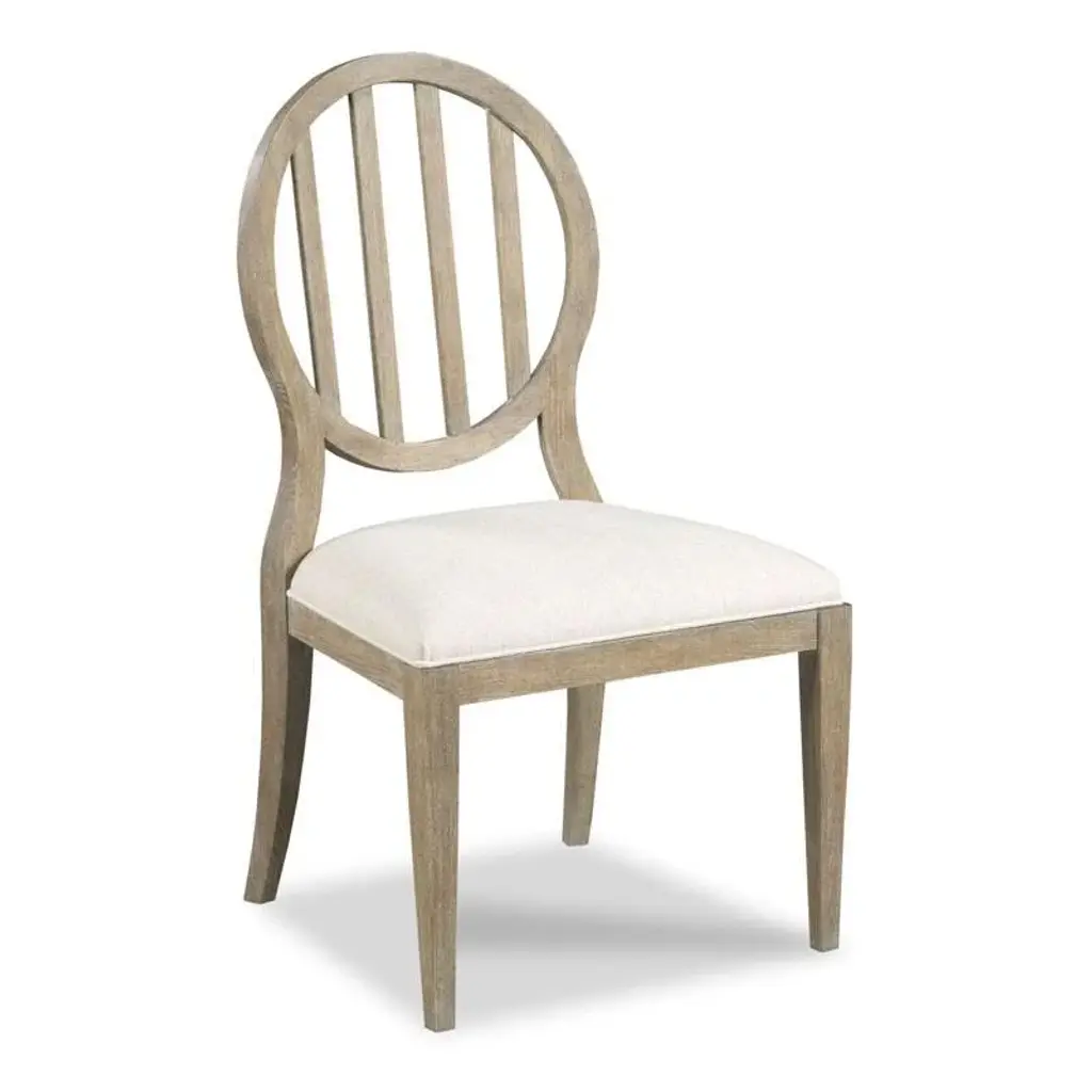 A graceful oval back is accented with a colonnade of shaped slats above an upholstered seat raised by gradual tapering legs. Crafted from hardwood solids.