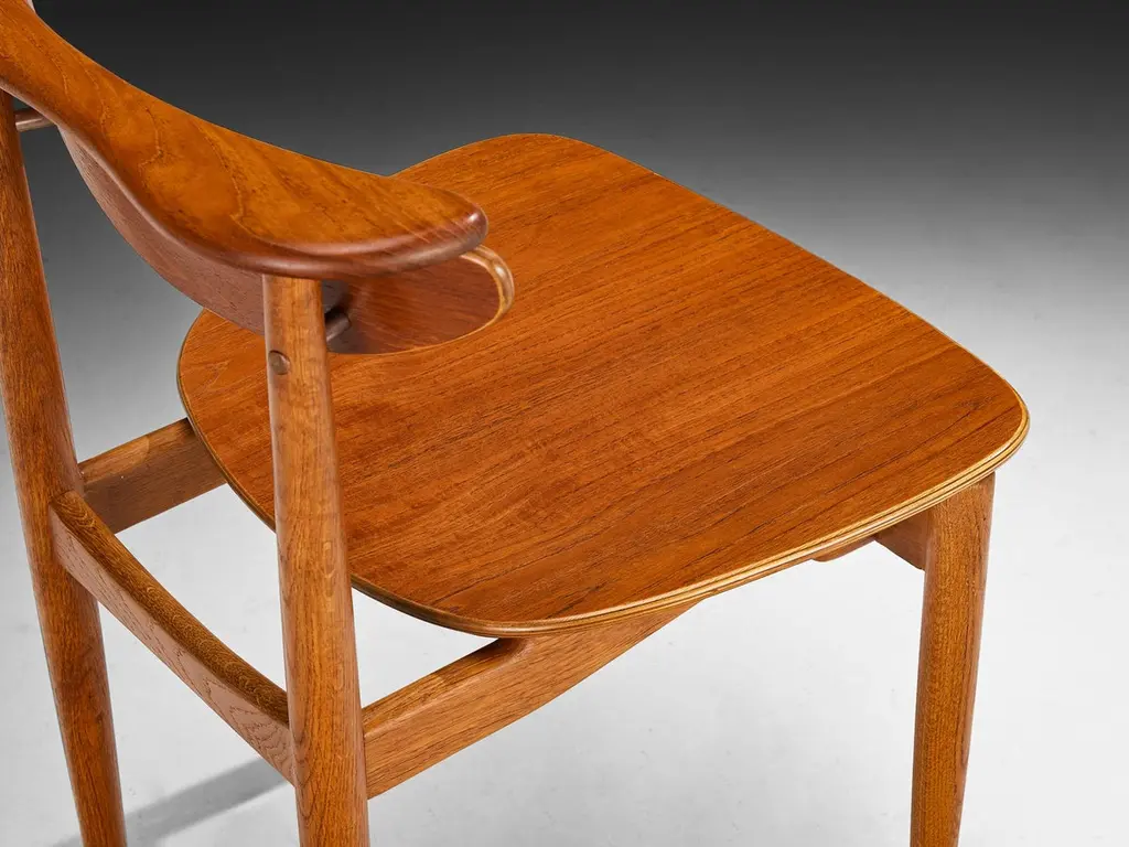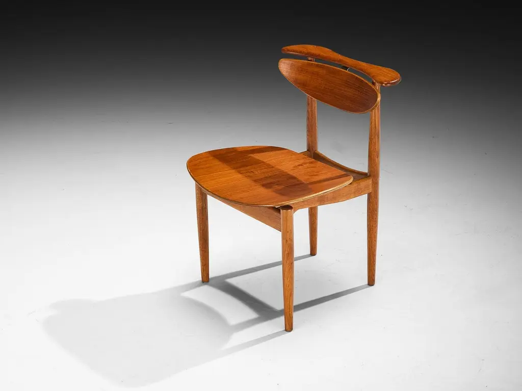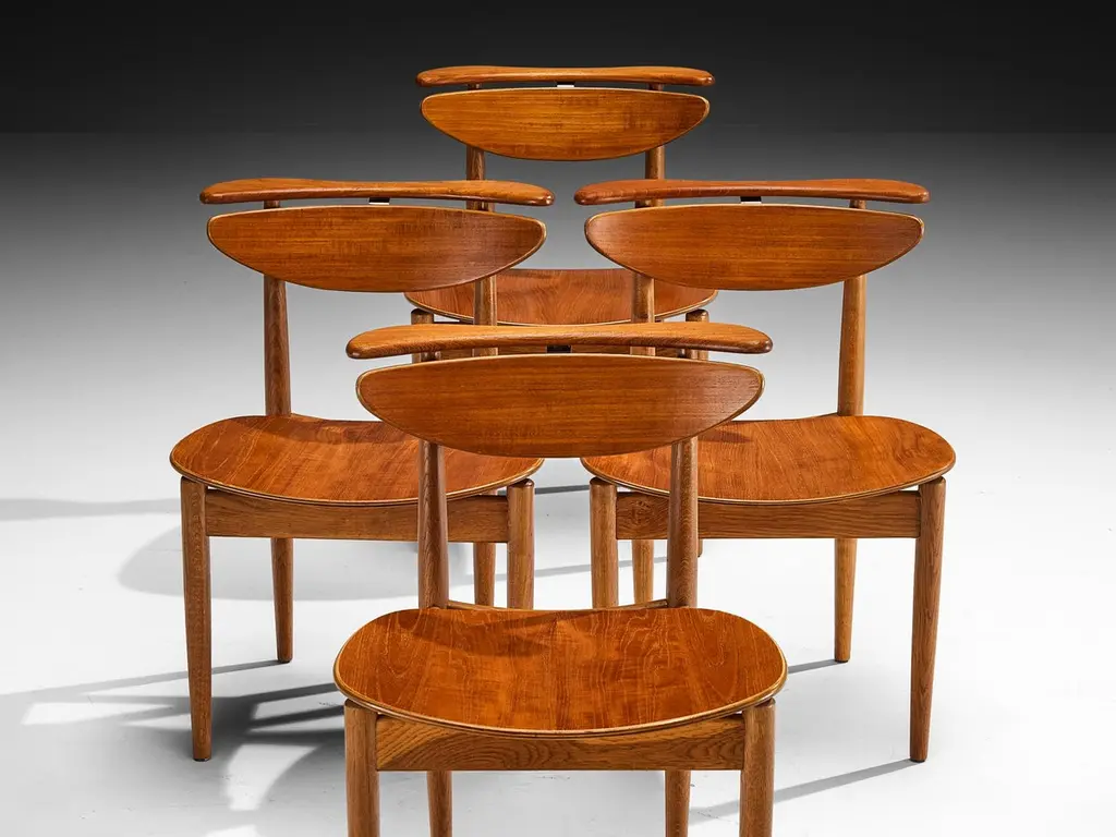 Finn Juhl for Bovirke, 'Reading' dining chairs, oak, teak, metal, Denmark, 1953In 1953, Finn Juhl designed this 'Reading Chair' for Bovirke. The chair is organically shaped featuring curvaceous forms and round finishes. The backrest is in great harmony with the seat as both elements are based on a concave shape. The sleek legs contribute to the chair's minimalist and light-weight appearance. Besides its aesthetic appeal, functionality also plays a key role in this design as it allows you to take two seating positions. The backrest is equipped with an additional slat that can be used as a rest for your arms while sitting backwards. A well thought-out design that ensures great comfort when sitting both forwards or backwards. Finn Juhl used natural, honest materials such as oak for the legs and teak for the overall parts. Finn Juhl (1912-1989), born in Denmark, planned on becoming an art historian when he was young. His father decided it would be a better career move if he went to become an architect. After graduating in architecture, Juhl worked for ten years with Vilhelm Lauritzen. At the age of 33, Juhl opened his own furniture design practice. In the 1940s he designed a number of creations that regenerated Danish furniture design and broke with the established furniture tradition. Juhl is now known as the one of the most important pioneers of Danish design. He was in fact the first Danish furniture designer to gain widespread international recognition. His work was vital to spreading the “Danish Modern” concept around the world. His designs are known for being exquisitely elegant, refined up until the smallest detail and extremely well executed.The listed price is per item.