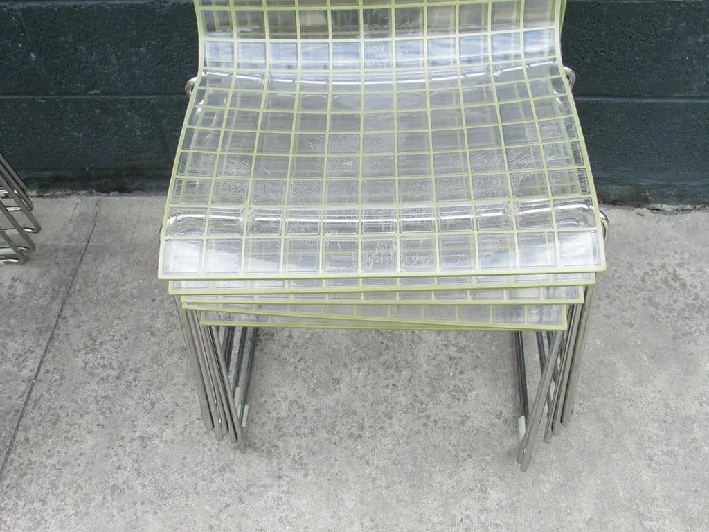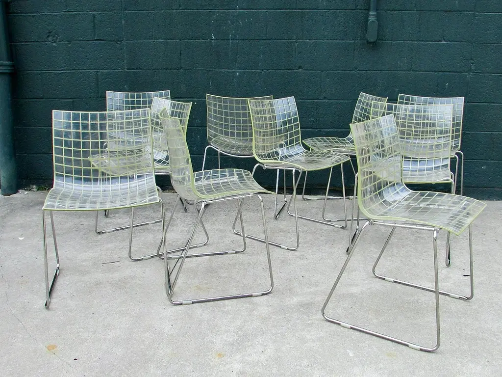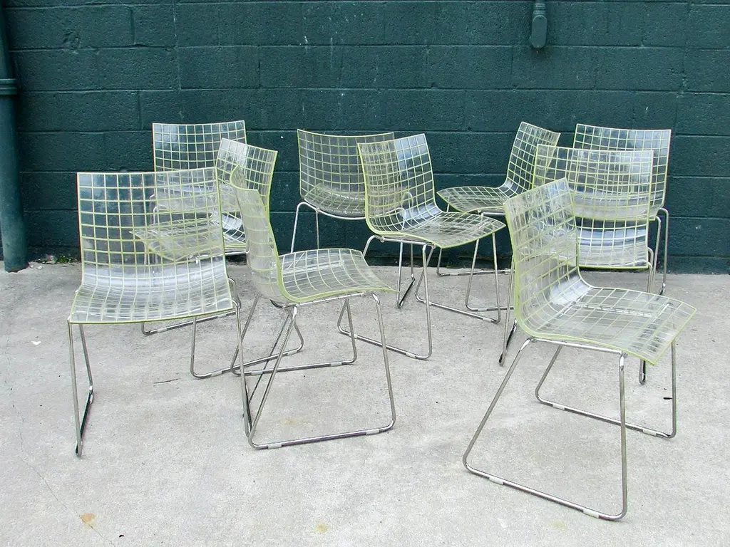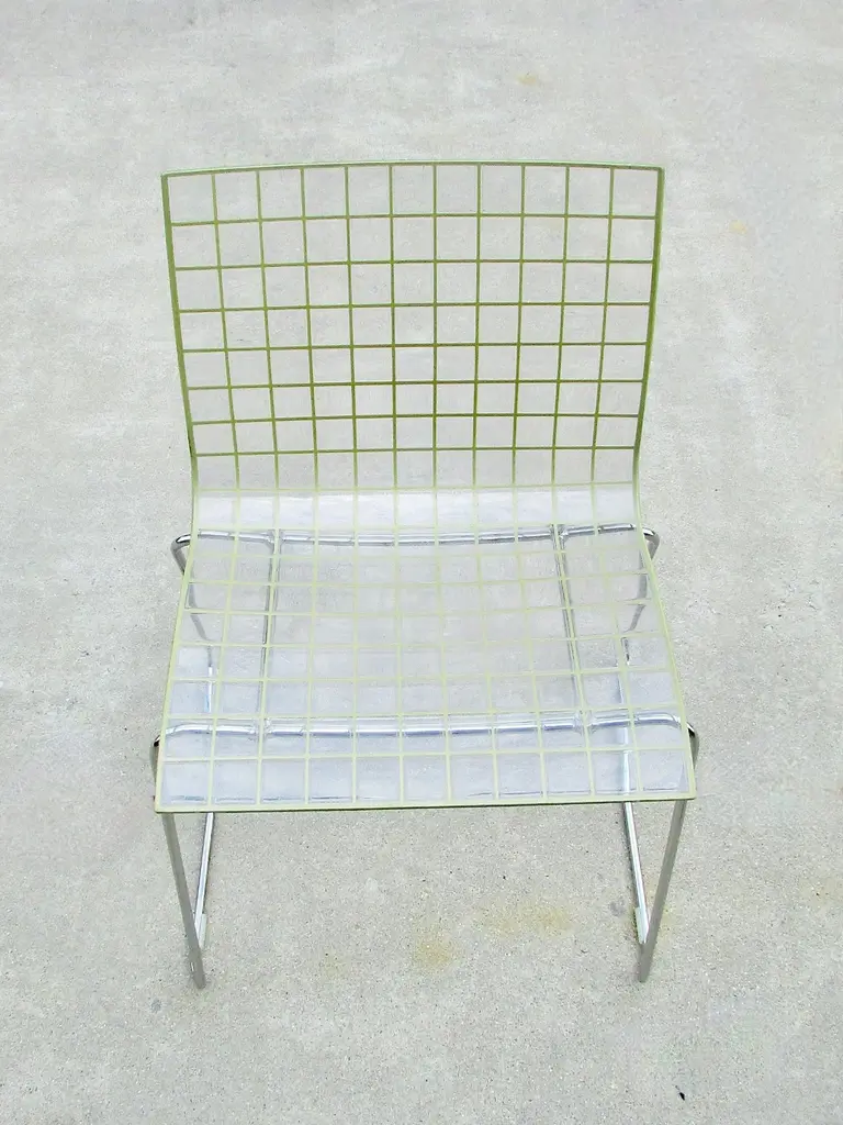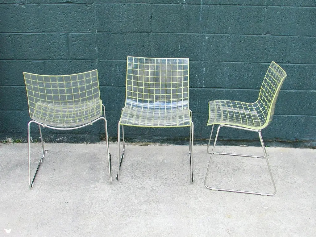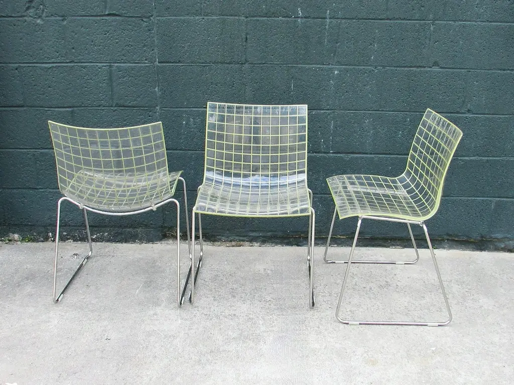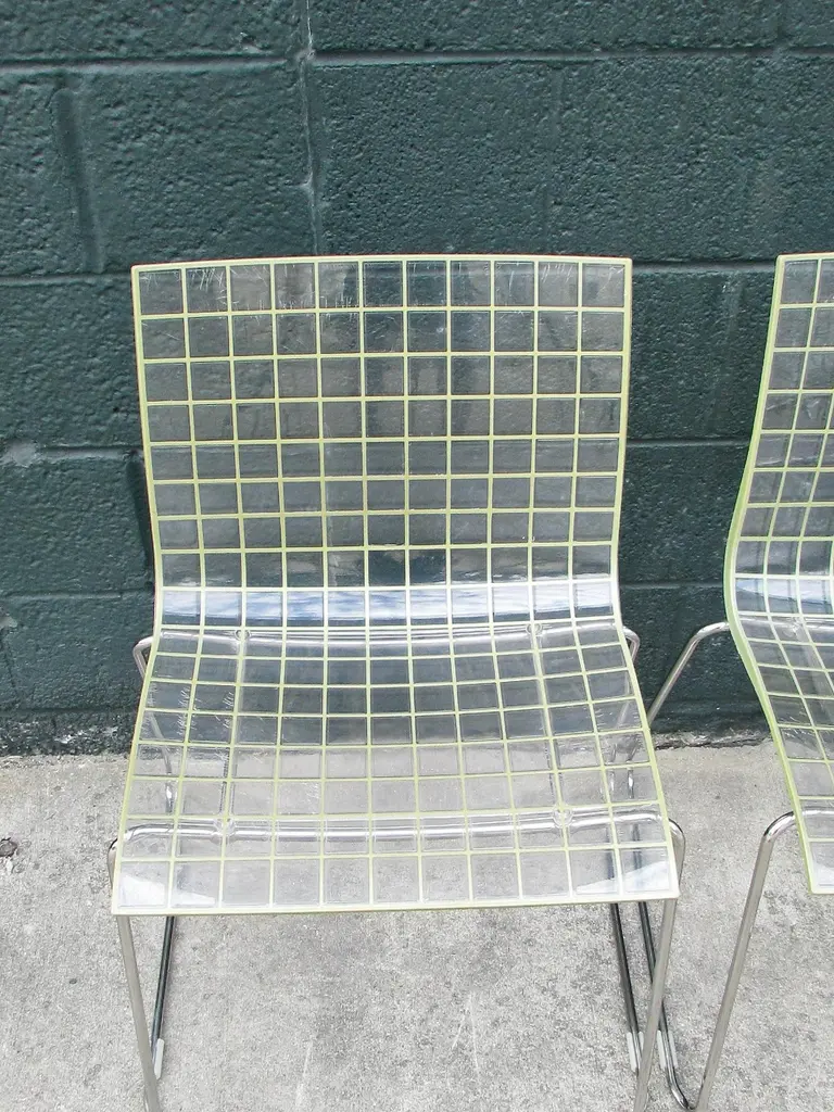 Sold by the pair five pairs are available "X3" chairs by Marco Maran for dining room or office. Manufactured by Max Design in Italy . I believe distributed by Knoll but not sure of that . Bent clear poly carbonate acrylic with a green tone grid pattern supported on chrome frames . Lucite acrylic seats do show crackling but structurally sound . Very light and comfortable. Chairs stack for ease of transporting and/or storing.