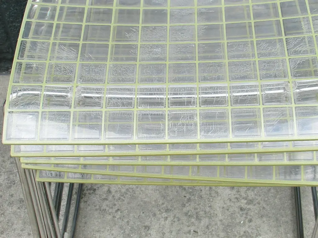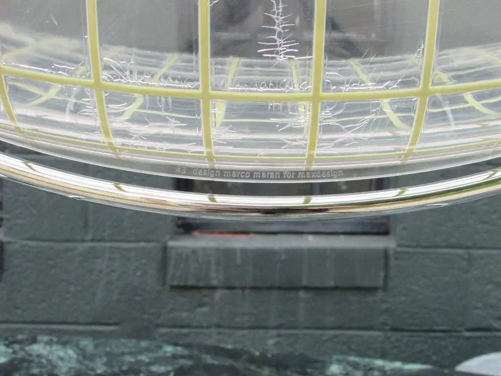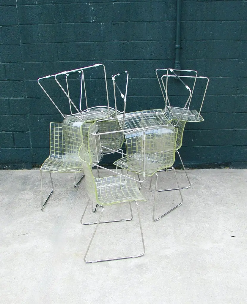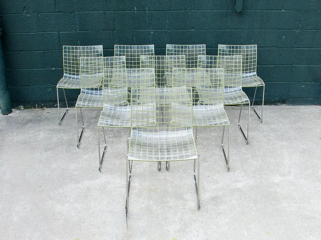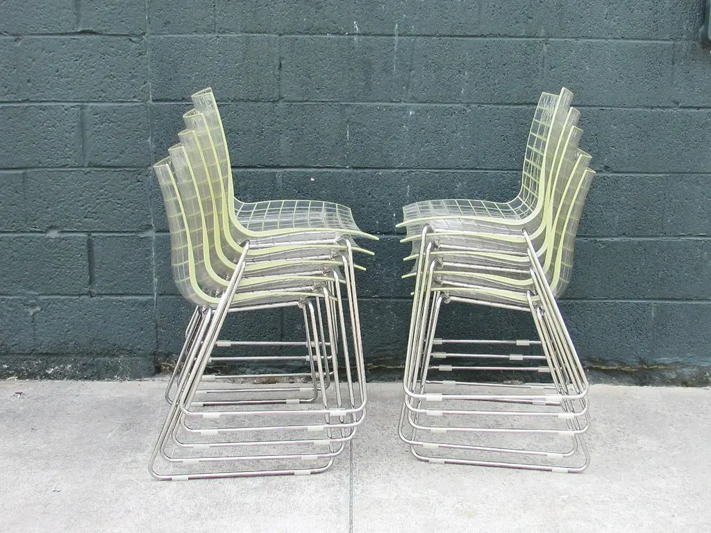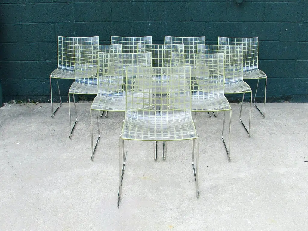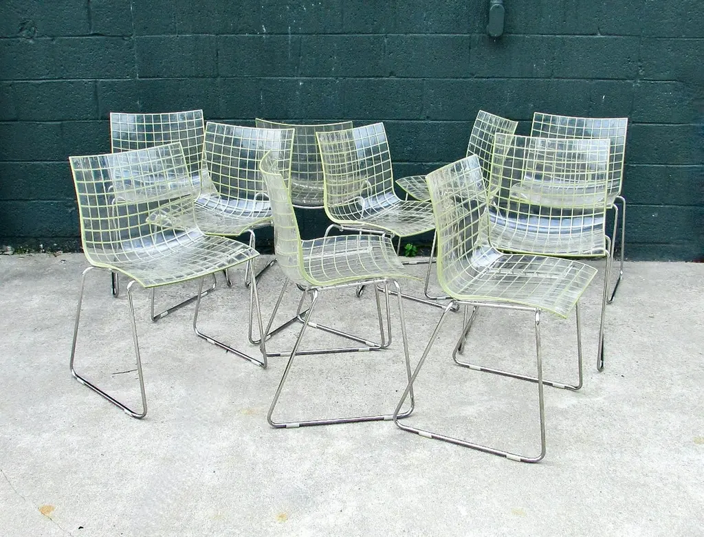 Sold by the pair five pairs are available "X3" chairs by Marco Maran for dining room or office. Manufactured by Max Design in Italy . I believe distributed by Knoll but not sure of that . Bent clear poly carbonate acrylic with a green tone grid pattern supported on chrome frames . Lucite acrylic seats do show crackling but structurally sound . Very light and comfortable. Chairs stack for ease of transporting and/or storing.