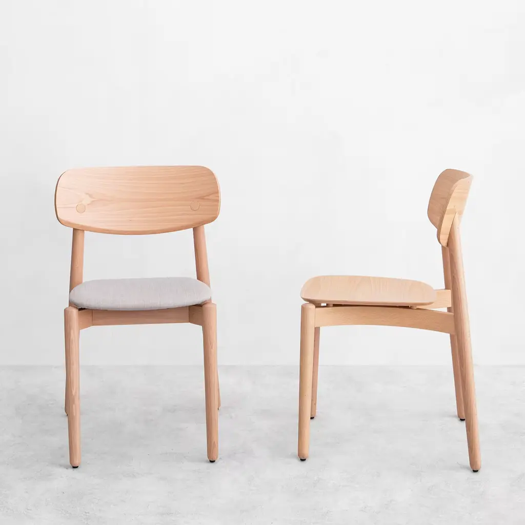 Versatile for diverse settings, from minimalist kitchens to modern dining areas, the Fizz chair by Lorenz+Kaz blends practicality and simplicity. Crafted from solid beech with a curved plywood seat and backrest, its ergonomic design offers exceptional comfort. The chair's stackable feature allows five chairs to fit in the space of one, embodying a perfect fusion of functionality and style. Available in various wood finishes and fabric options to be explored with the Concierge.