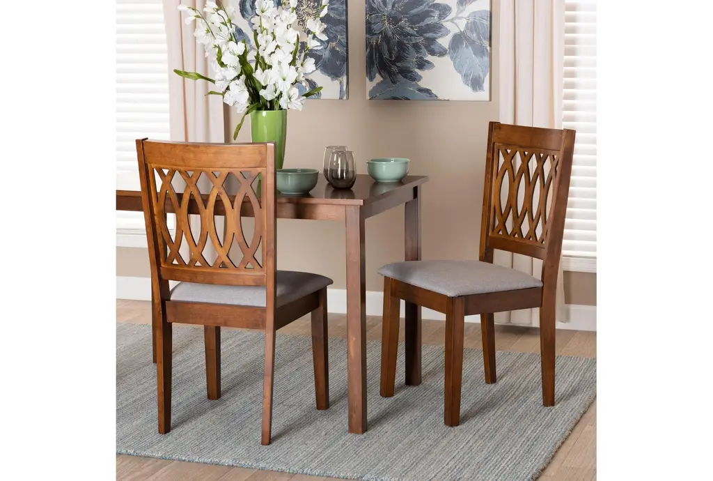 The Florencia Modern Grey Upholstered & Walnut Brown Wood Dining Chair Set of 2 brings a sophisticated touch to any dining room or kitchen. With a timeless mid-century modern style, these armless chairs combine comfort and aesthetics seamlessly. The grey fabric cushion and walnut brown wood create a striking contrast, perfect for enhancing your dining experience.