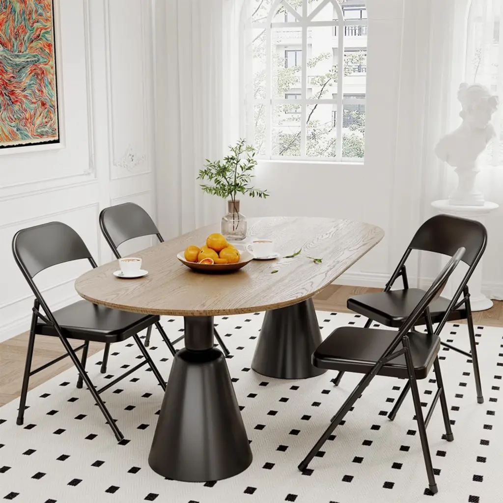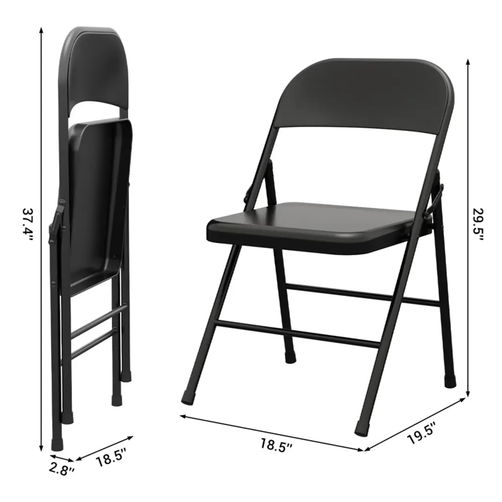 Folding Chairs Set of 6 - Metal Chairs, Hold Up to 350 Pounds, Foldable for Outside & Indoor Use Experience the perfect blend of convenience, durability, and style with this set of 6 metal folding chairs. Designed to meet your versatile seating needs, these chairs are portable and easy to carry, making them ideal for parties, camping trips, travel, and everyday use. Convenient and Easy to Store: These chairs feature a collapsible design that ensures effortless storage and transport. Whether you're hosting an event or going on an outdoor adventure, these foldable chairs provide quick and practical seating solutions. Stable and Durable Construction: Built with a sturdy triangular metal frame, these chairs offer excellent stability and support, holding up to 350 pounds. Equipped with rubber foot pads, they prevent slipping and protect your floors from scratches, ensuring safe and secure use indoors or outdoors. Easy to Clean: The smooth metal surface allows for effortless cleaning after use. Perfect for dining tables or outdoor settings, these chairs maintain their sleek appearance even after extended use. Practical Fashion: Combining industrial style with functionality, these metal chairs feature a comfortable design and a robust all-steel frame. Their stylish look complements a variety of settings, from casual gatherings to more formal occasions. Product Size and Package: Each chair measures 18.5 x 19.5 x 29.5 inches, designed to comfortably accommodate adults. The set includes 6 folding chairs, allowing you to mix and match seating arrangements based on your specific needs. Upgrade your seating options with this reliable, stylish, and easy-to-store folding chair set, perfect for both indoor and outdoor use.