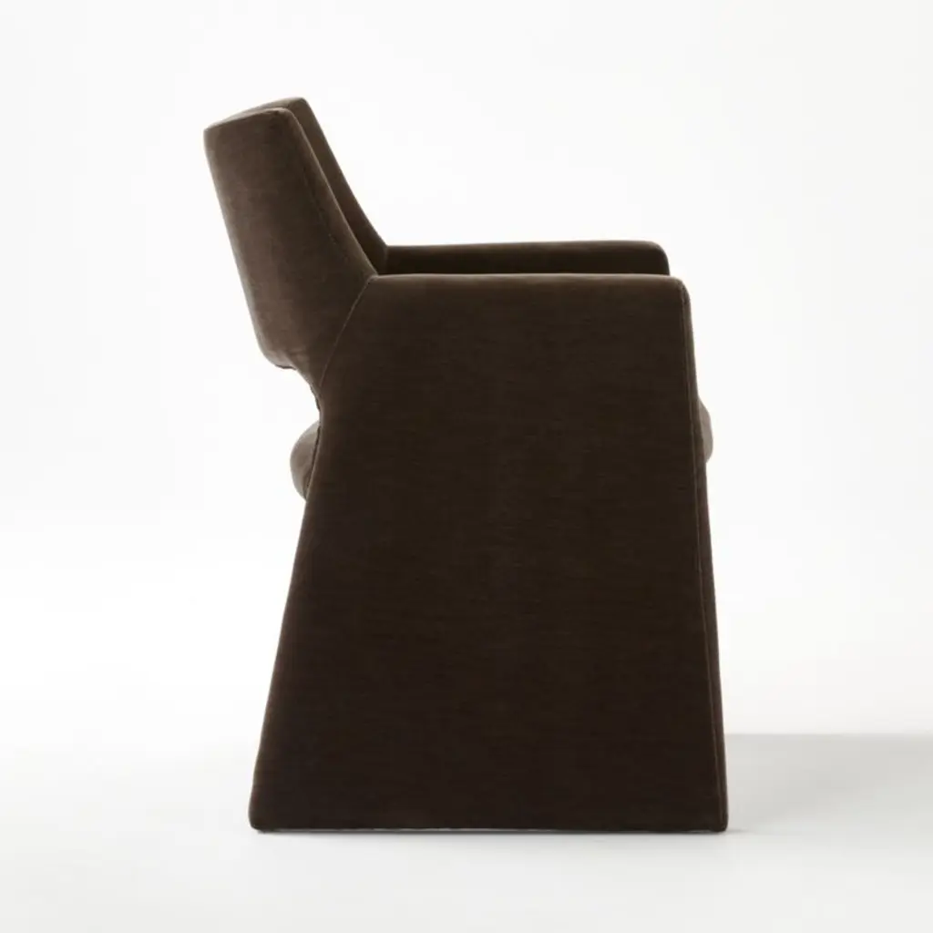 Textured velvet in a rich mink brown hue is framed up in an architecturally inspired dining chair worthy of a Parisian loft. Designed by Caleb Zipperer, arms and legs flow together as one and give base to a super-plush seat deep enough to pass as a comfy accent chair. CB2 exclusive.