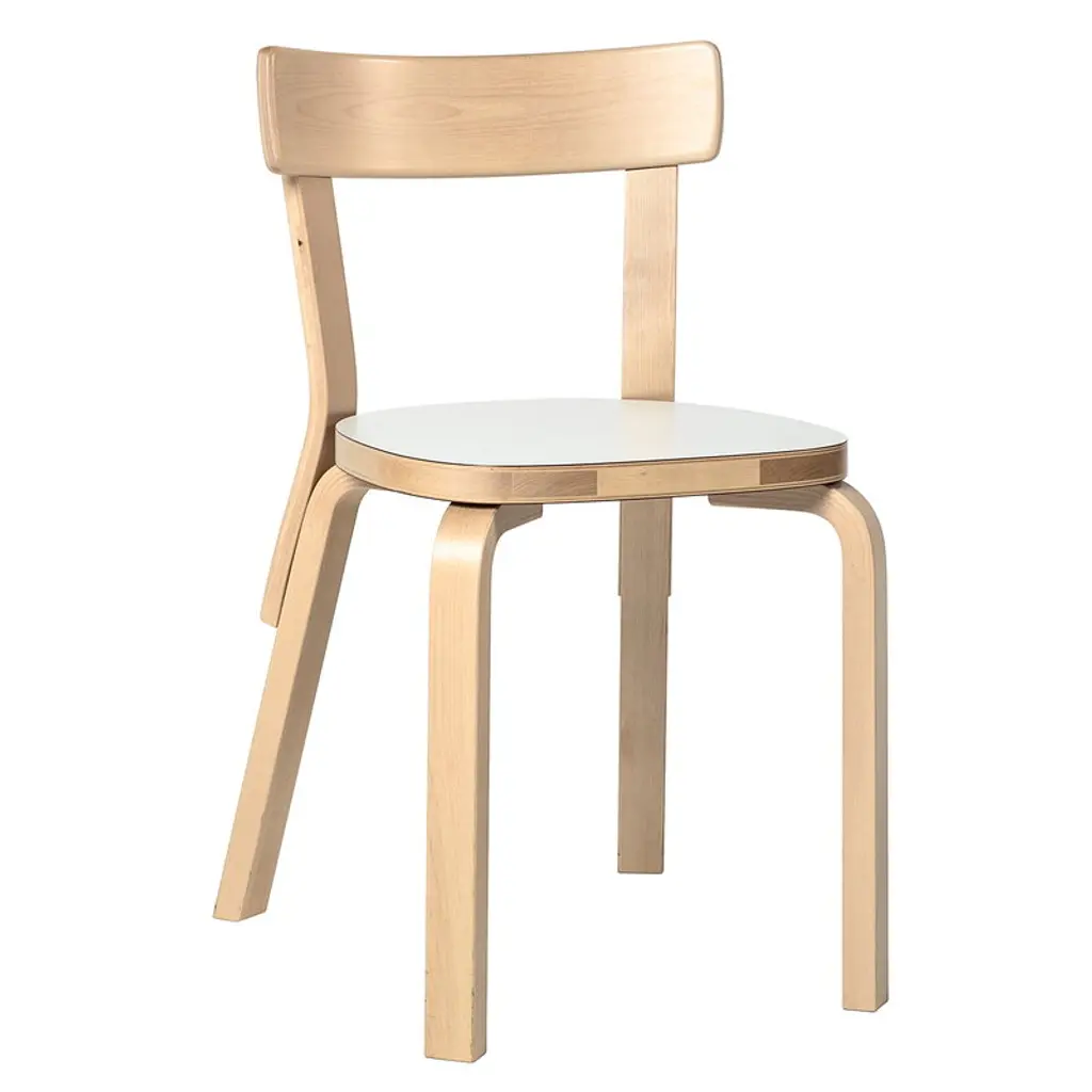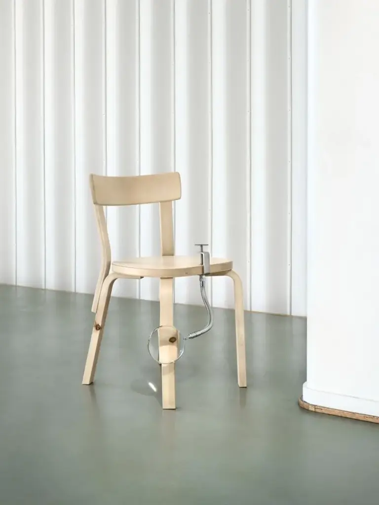 Chair 69 is one of Artek’s most popular chairs, a universal wooden chair in the tradition of classic kitchen and café chairs. With a broad seat and supportive backrest, Chair 69 exudes durability and stability while retaining an elegance of line. Available in a variety of colours and finishes.Reintroduced in 2024 by Formafantasma in an unprecedented wild birch variant. The Forest Collection is part of an ongoing collaboration between Artek and Formafantasma, an Italian design studio that investigates how environmental, political and social forces influence design today. With the launch of the 'wild birch' variants of the Stool 60 and E60 originally launched in 2023 - they will be updated to become even wilder. While the Stools currently only show natural marks on the legs, all Stool 60 and E60 in 'wild birch' will in future also feature insect marks and small knots on their upper surfaces, as well as a matt finish. The update will apply to all 'wild birch' variants of the Stool 60 and E60 produced from 25 April 2024 onwards.