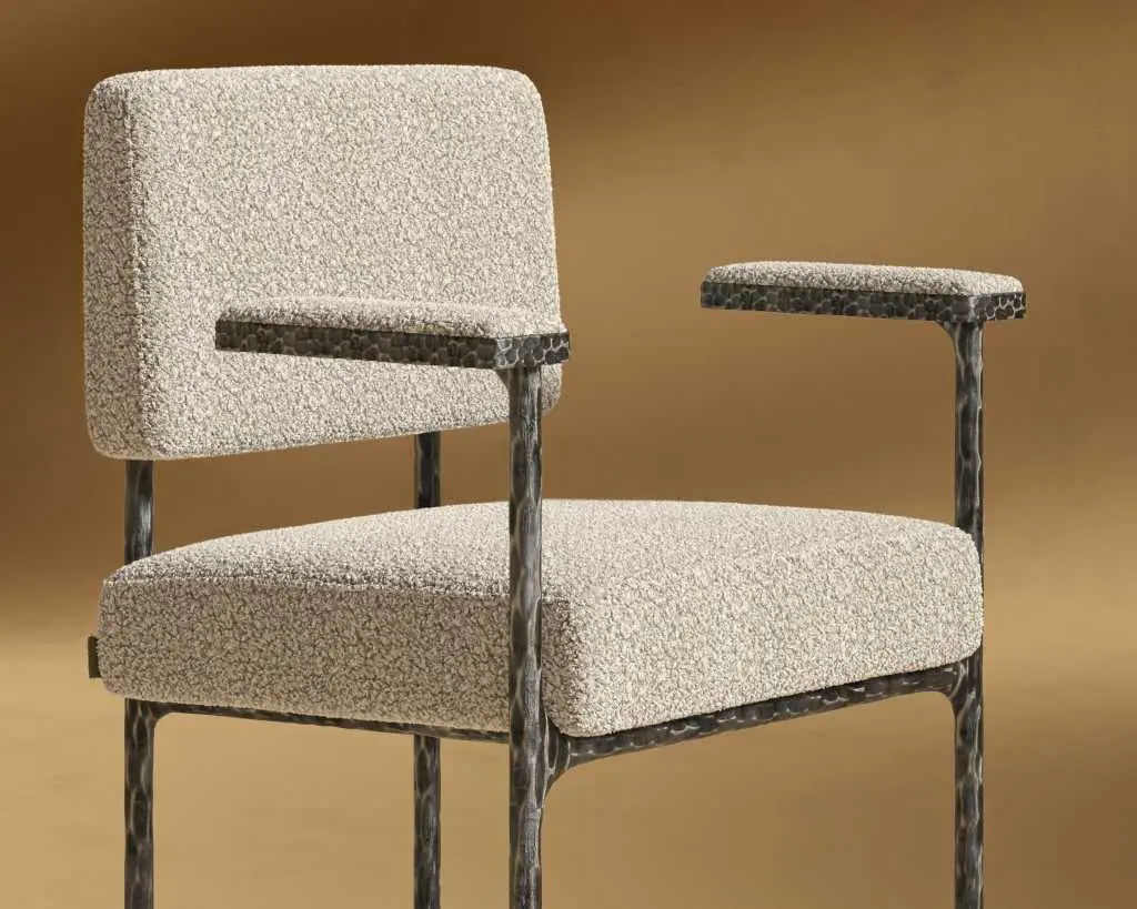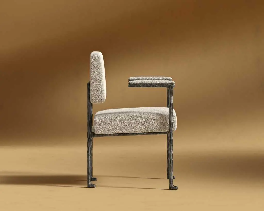 The Forja Dining Chair redefines everyday seating with sculptural presence and tactile warmth. Its hammered patina chocolate frame anchors the design with artisanal character, while soft upholstery in rich tones invites effortless comfort. With removable covers for ease of care, Forja is both functional and refined—a versatile companion for casual gatherings or elevated dining.