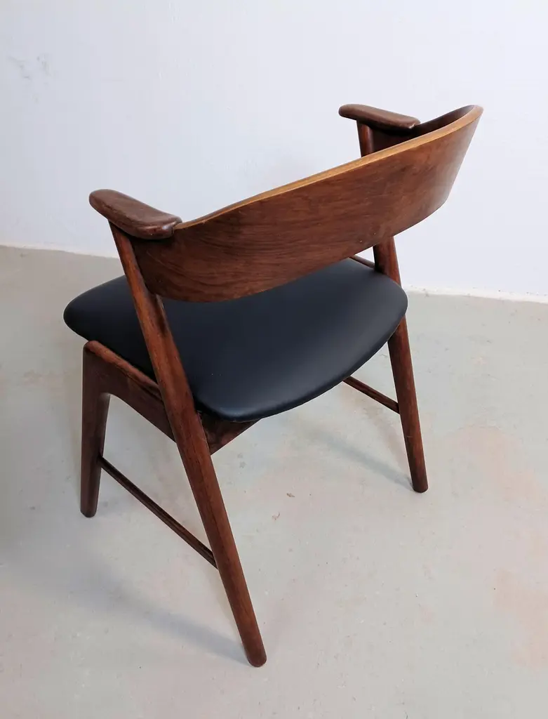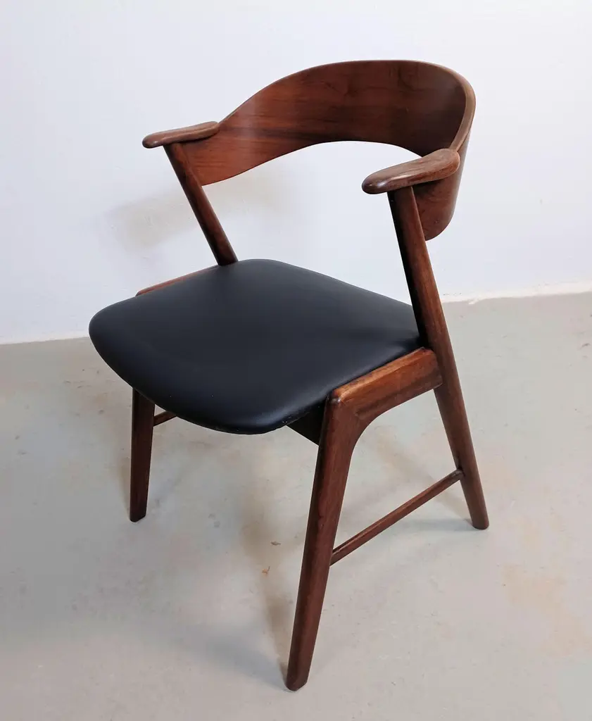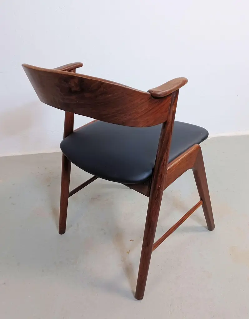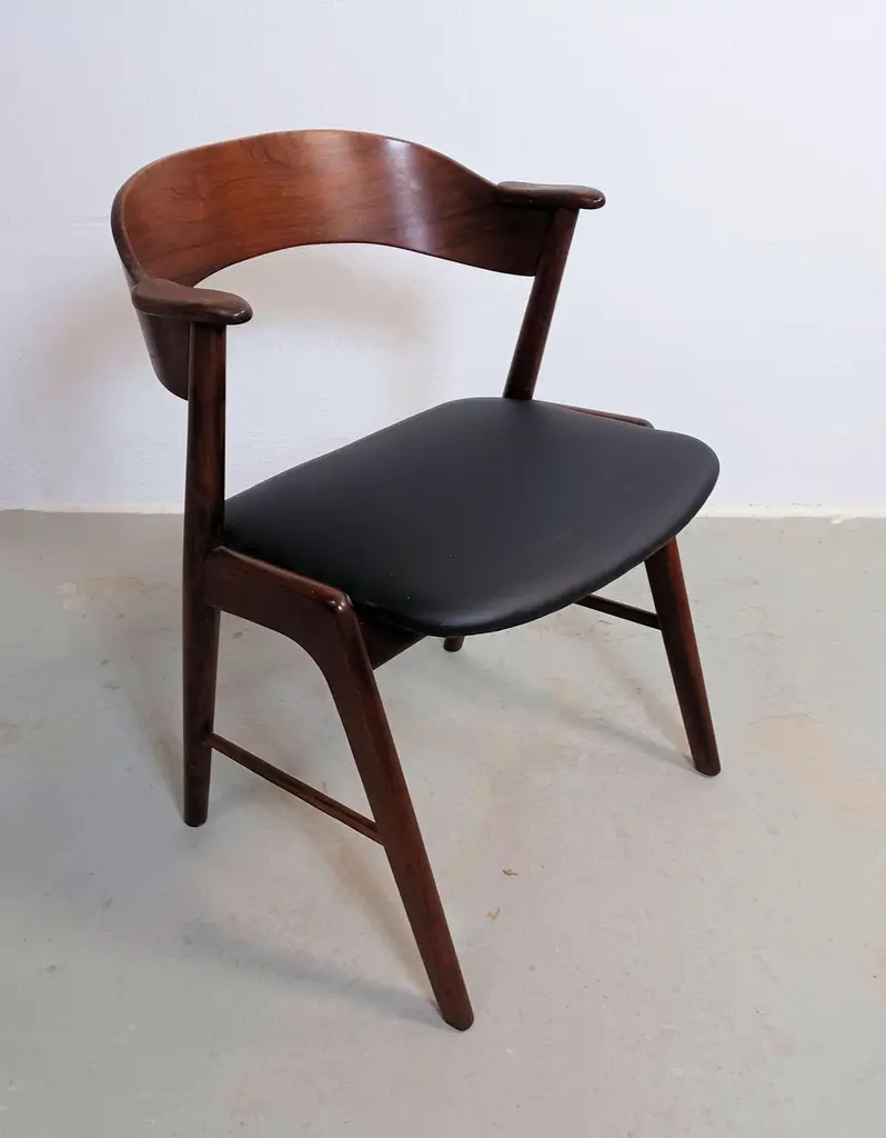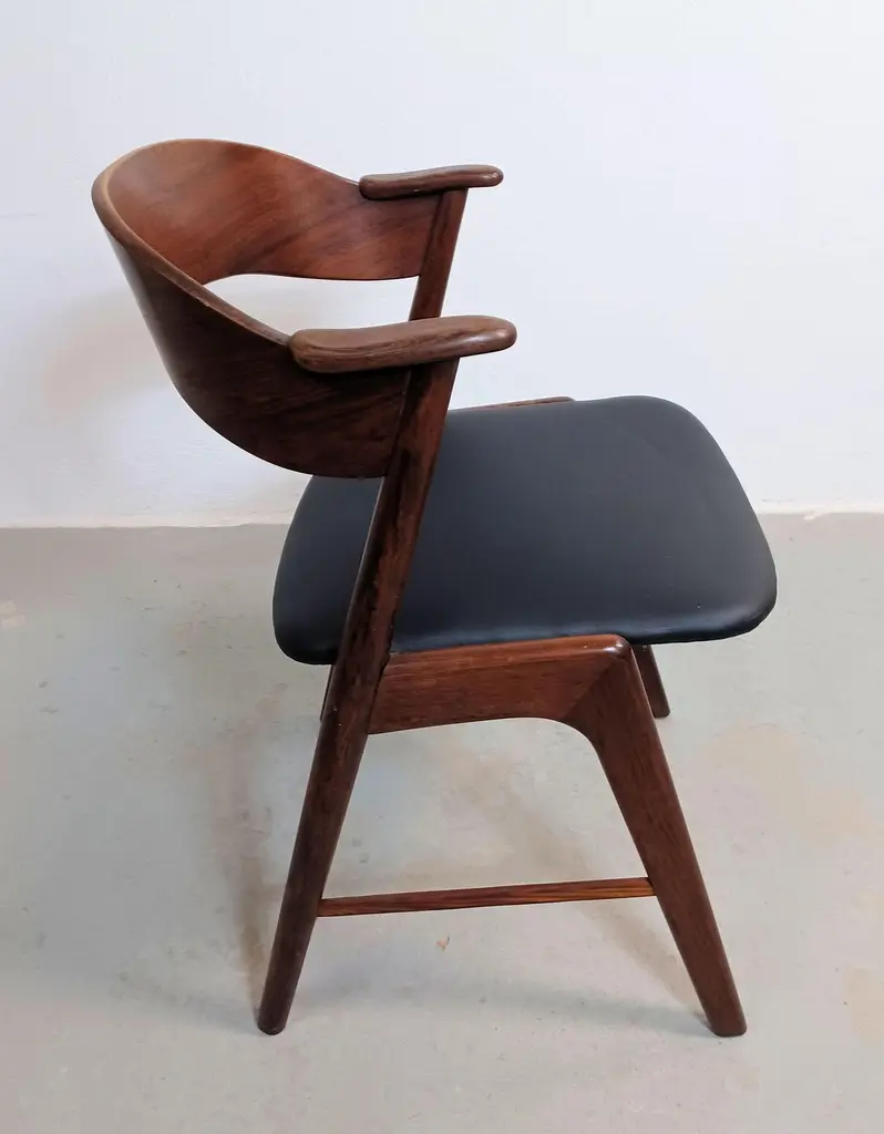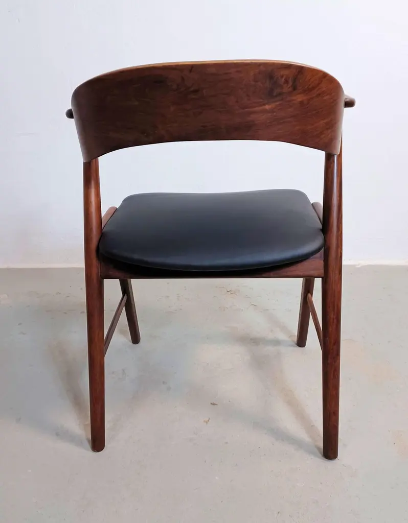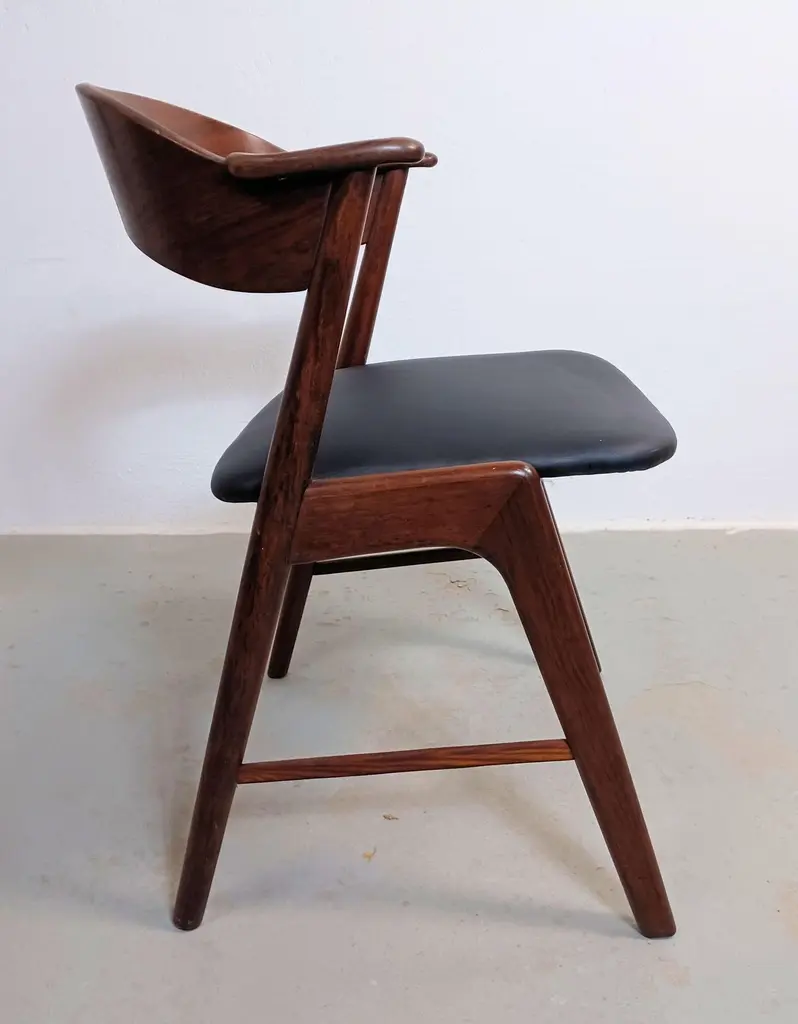 Four rosewood dining chairs in excellent condition with customizable upholstery allowing you to get the color and material of upholstery you wish for.The set of dining chairs in rosewood feature curved backrests and elegant frames were manufactored by Korup Stolefabrik and are commonly known as model 32 and by many attributed to Kai Kristiansen - though he himself denied having designed it.The well designed and crafted chairs have beeen fully restored by our experienced cabinetmakers - all joints have been checked, fully separated and reglued underpressure if any indication of movement in the joints, other needed repairs made, sanded by hand 2 - 3 times and refinished with wax twice to ensure that they are in very good condition with only minor signs of age and use. Seats will be reupholstered without additional cost in fabric or leather of your choice from a wide list of fabrics from "Kvadrat" / "Romo" fabrics or leathers from "Sorensen Leather" / "Camo Leather".We are shipping our pieces to most of the world at cost efficient shipping costs - so feel free to ask for a shipping quote for your destination.