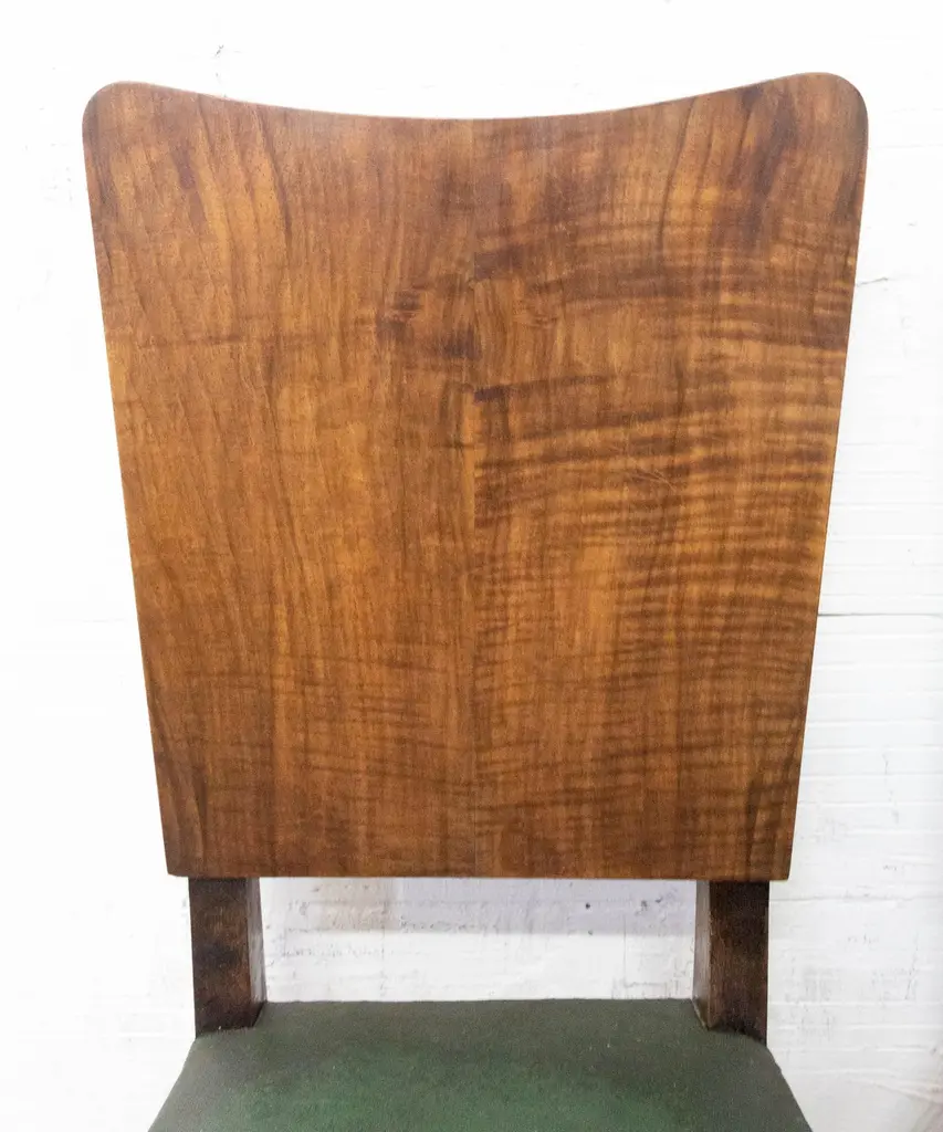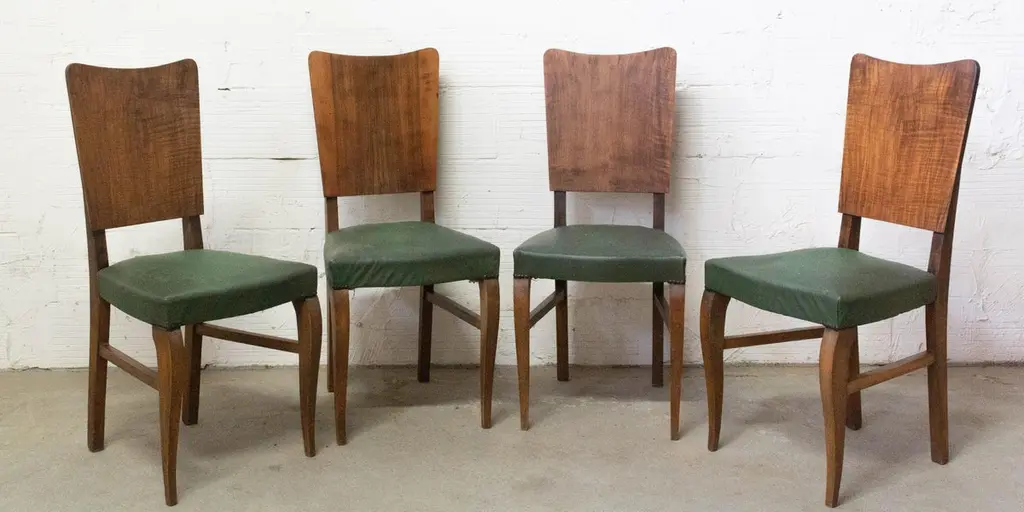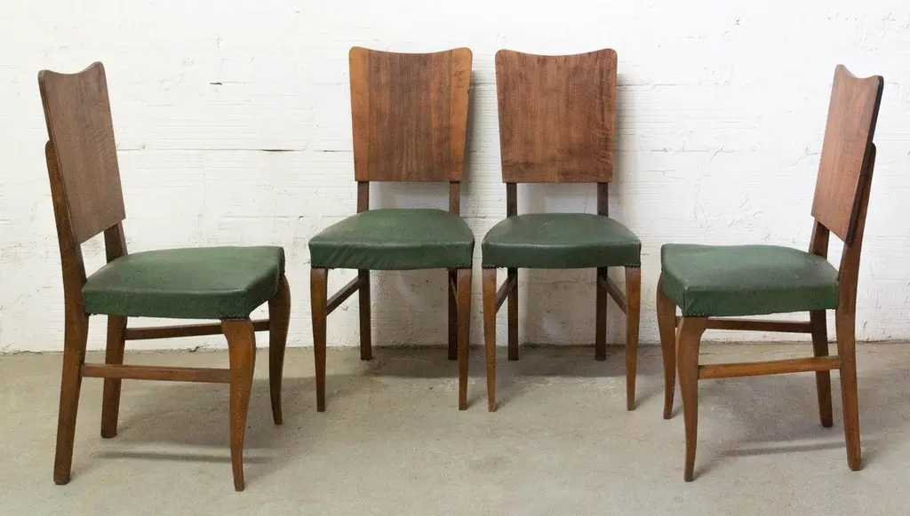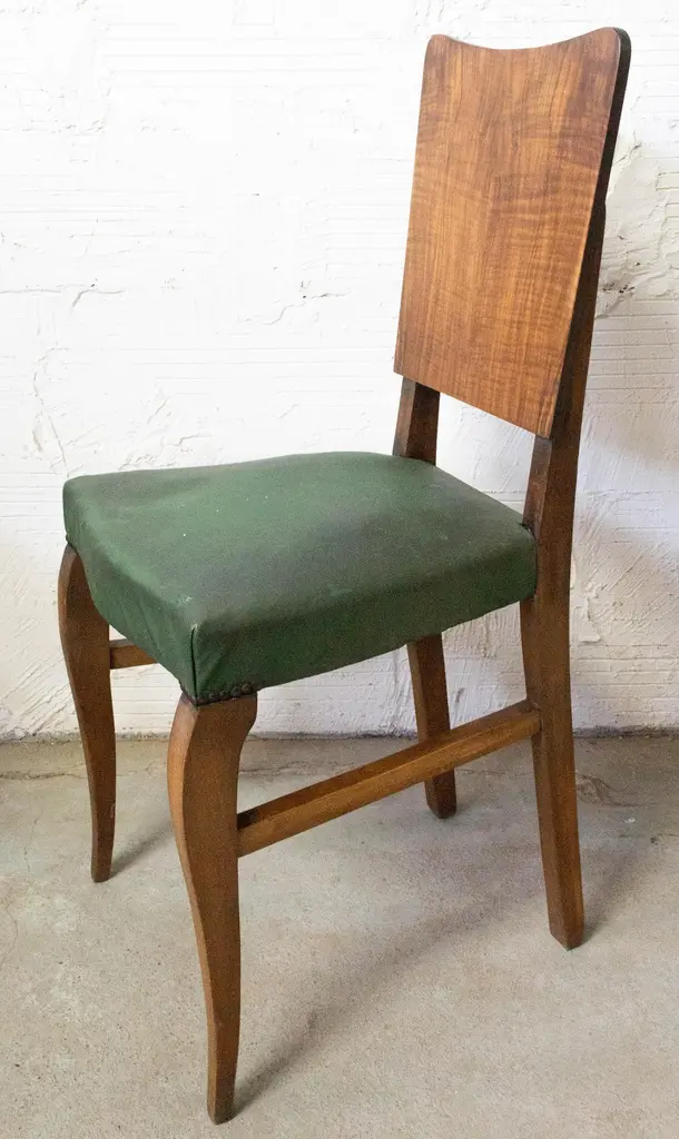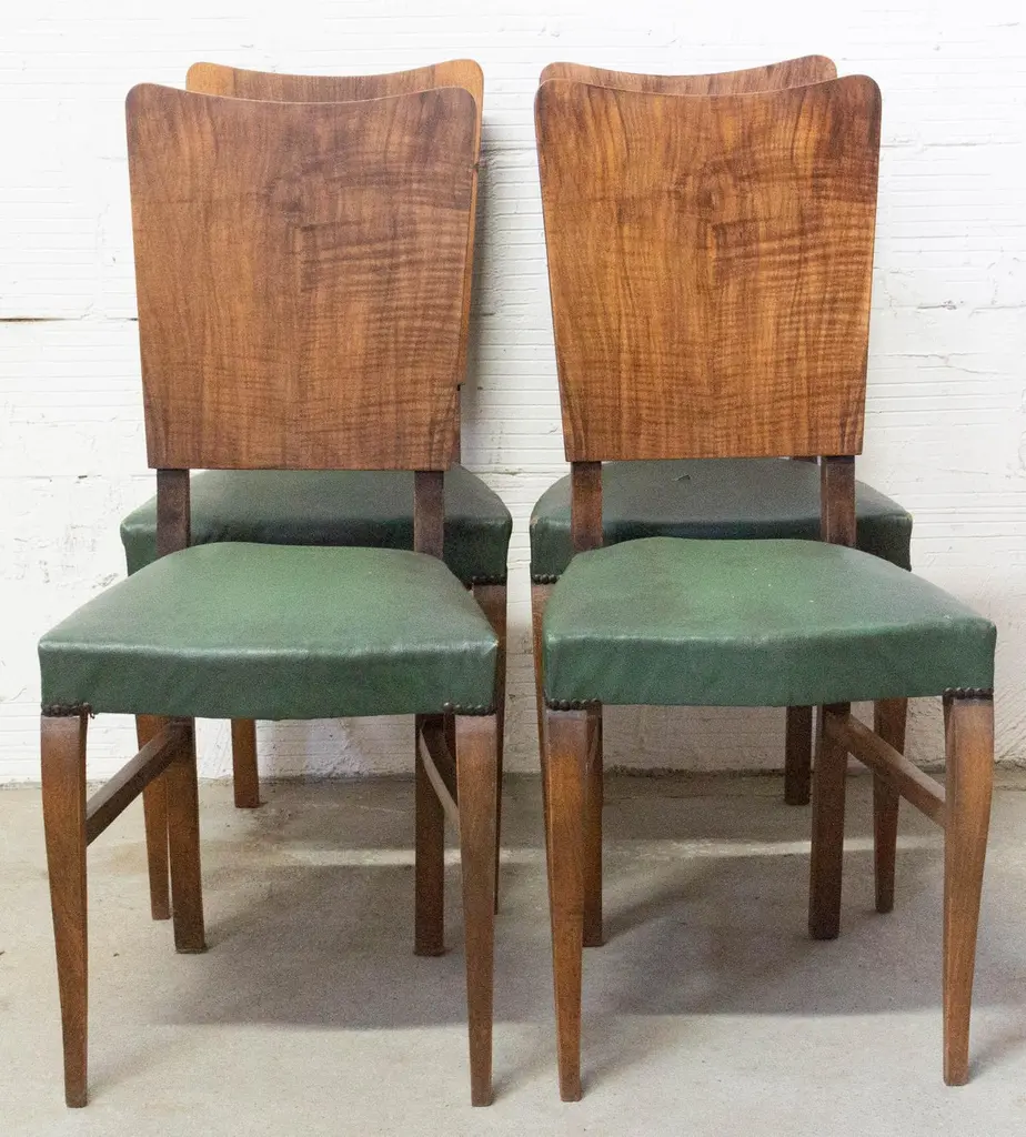 Four French dining chairs, midcenturyBeech, walnut veneerOriginal vintage condition to be re-upholsteredSound and solid.Shipping: 2 packs, L 43/P57/H101 kg 12.2 kg each.