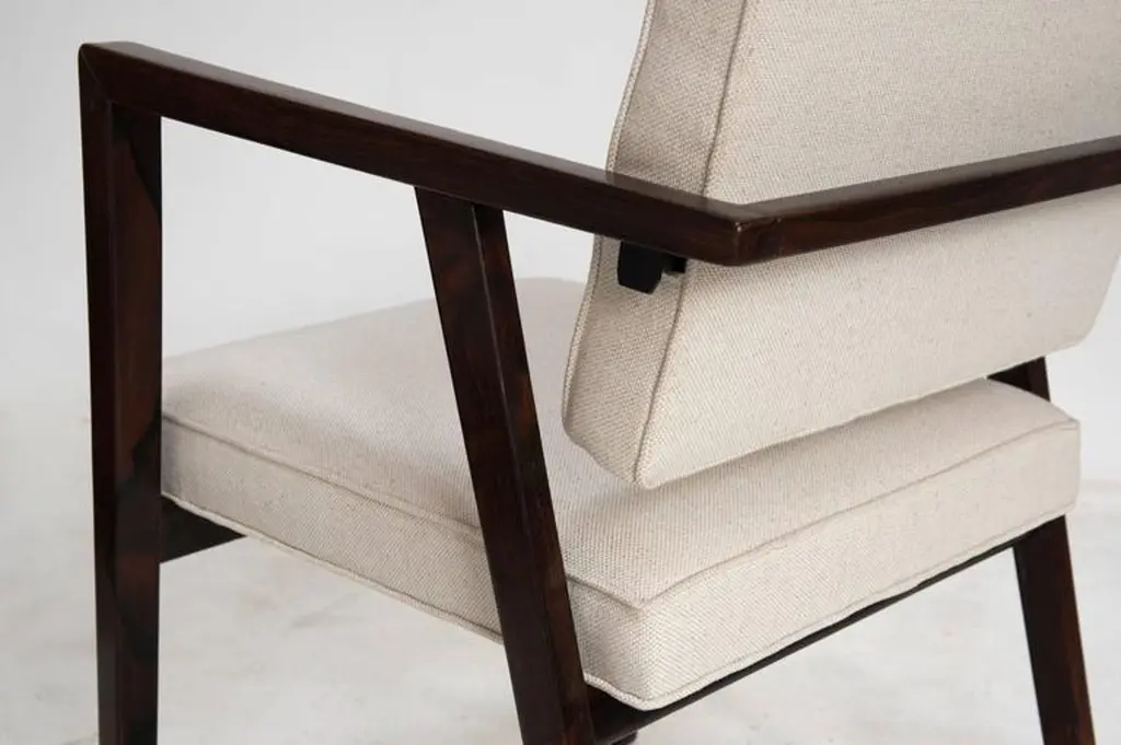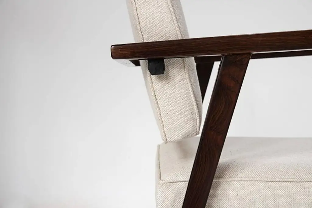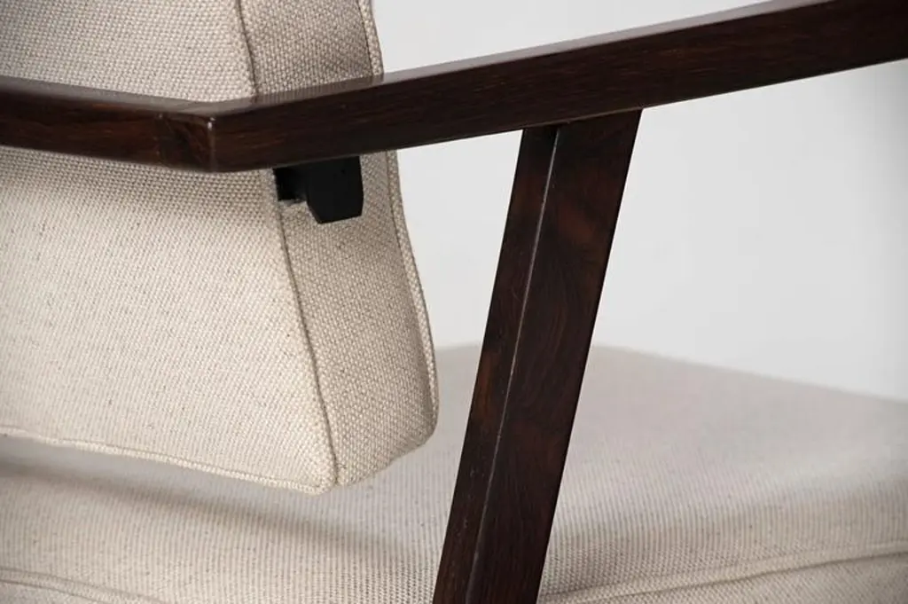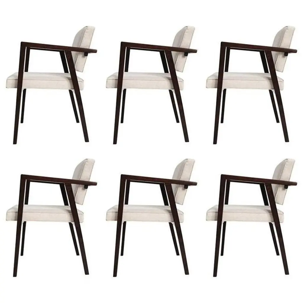 Franco Albini (1905-1977)Six dining chairs with arms (Price per chair) Manufactured by Forma BrazilBrazil, 1950sSolid jacaranda wood and fabricMeasurements58 cm x 55 cm x 77 H cm22.83 in x 21.65 in x 30.31 H inDetails:This model is a variant of model produced by Knoll. Carlos Hauner and Martin Eisler, owners of Forma Brasil at the time, bought the rights to produce some of the pieces from the catalogue of Knoll, among others these chairs by Franco Albini.