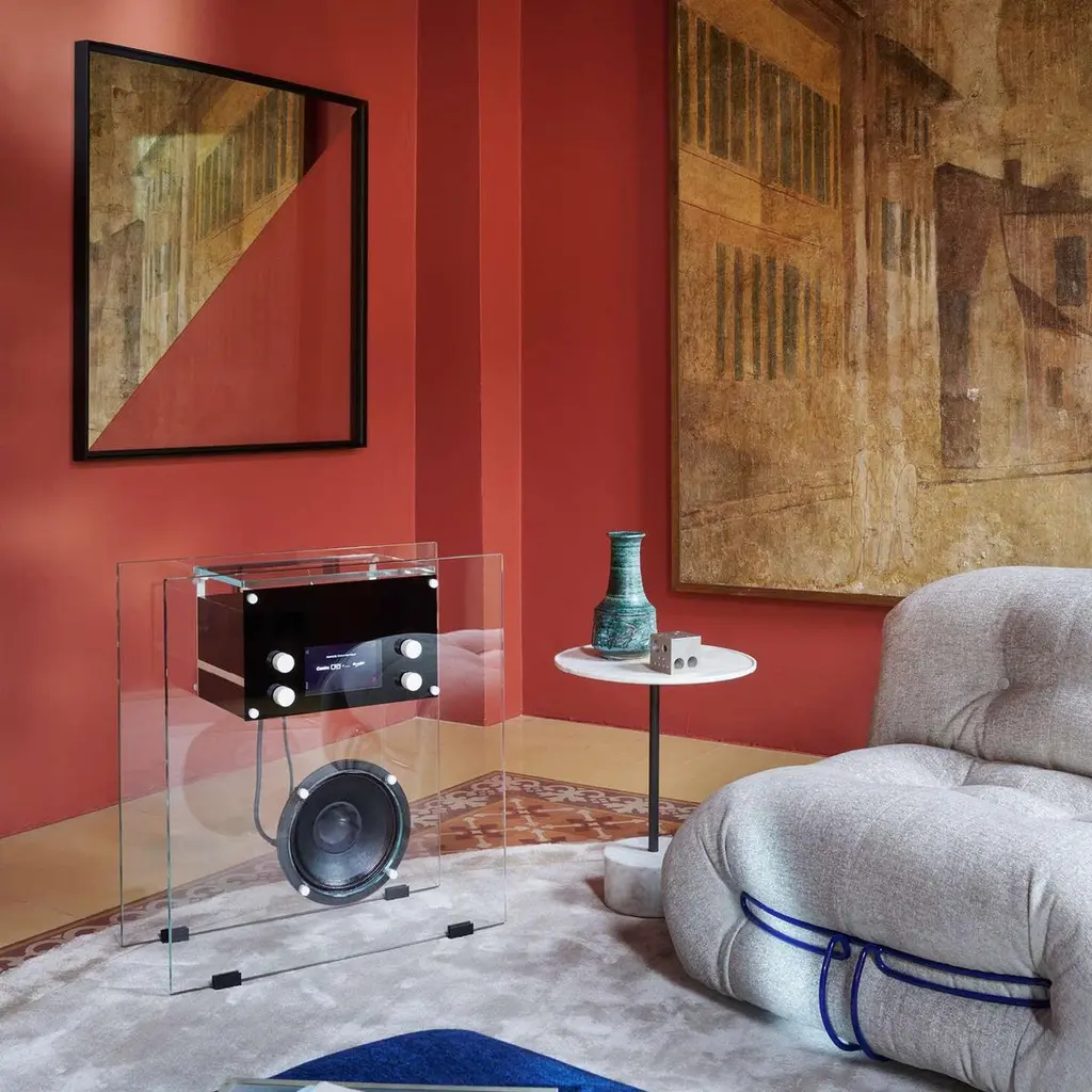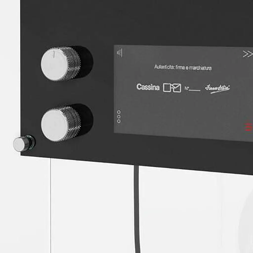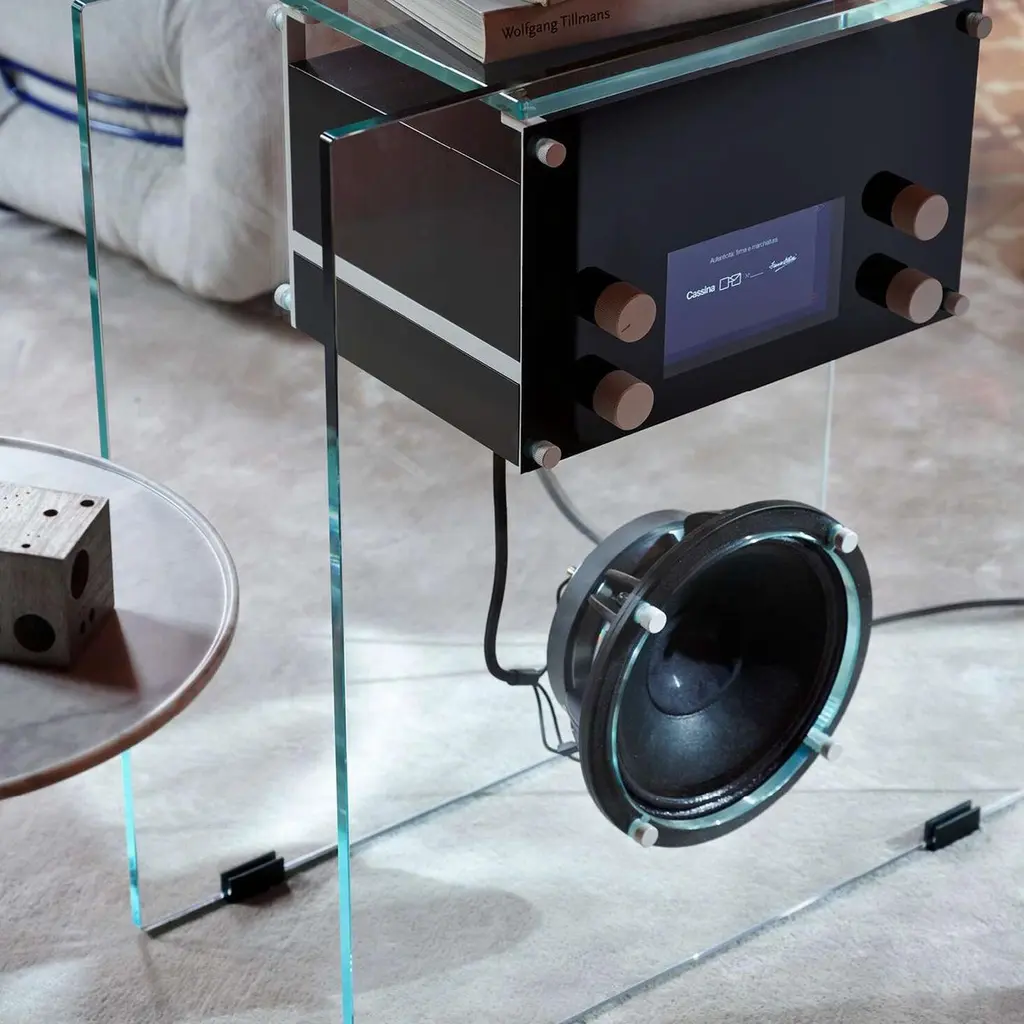 Radio in Cristallo station by Franco Albini in 1938. Relaunched in 2021.Manufactured by Cassina in Italy.Radio in Cristallo goes straight to the heart of the project that Franco Albini created as a prototype-model in 1938 for his home. He took apart and reassembled a radio in a wood cabinet received as a wedding gift, exposing the electric components by pressing them between two sheets of tempered glass. A tribute to lightness, a step that catapults the designer in the direction of bold modernity that, by demonstrating progress, narrates its value. In concert with Fondazione Franco Albini, Cassina has optimized the design the architect entered into a competition by the Swiss company Wohnbedarf in 1940, keeping the same size while adding new Bluetooth technology and an optional subwoofer that, connected to Wi-Fi, creates a more enveloping atmosphere. Radio in Cristallo will also be offered in a special limited edition of only five pieces. The Radio in Cristallo L.E., with a numbered metal plate on the side of the structure, will feature white knobs and an electronic circuit board with all hand-soldered circuits.A radio at the forefront of modern Italian design, developed from a canny intuition to put the electrical components in plain view, thereby exposing the public to the technology, demonstrating how it works.With the Radio Cristallo of 1938, created by reassembling a wedding gift, Franco Albini expresses his enthusiasm for progress, transforming technology into a design piece that narrates the radio itself, thanks to the thin, transparent glass sheets that surround the radio itself.This design accessory gets a contemporary technology upgrade with incorporated Bluetooth and an optional subwoofer to connect to WiFi ? for an even more encompassing ambiance. In the super-limited edition of just five pieces, the Radio in Cristallo L.E. has an electronic circuit board and hand-soldered circuits.About the designer:Minimal in form from concept to design, Albini’s furniture emerged from a traditional Italian craftsmanship practice. Using artisanal materials such as woven cane for the design of some of his most seminal works, such as the Margherita and Gala chairs, Albini applied a modern aesthetic to the design and construction of his products. Trained under the apprenticeship of famed Italian furniture designer Gio Ponti, Albini got his start with the design of a radio encased in glass revealing the inner mechanisms of the device. His later works developed from this tension between usability and style, and including products such as the Fiorenza, Luisa and Rocking chaise. Albini was also a celebrated architect working on important architectural projects in Italy such as the Rome Rinascente building and Milan subway stations.About the manufacturer:In a continuing dialogue between past, present, and future, Cassina has created the I Maestri collection, revisiting furnishing designs by the 20th century’s best-known architects, including Le Corbusier, Pierre Jeanneret, Charlotte Perriand, Charles Rennie Mackintosh, Gerrit Thomas Rietveld, Franco Albini, Frank Lloyd Wright and Marco Zanuso. While the designs and functional concepts have been precisely preserved, the models have been manufactured using evolved technology. This is also the company that has manufactured iconic pieces of contemporary design from the 1950s to the present day, ideated by some of the most important international designers. Today Cassina continues to look to the future of design with audacious, passionate curiosity and an open, holistic approach. It affirms its exclusive ability to furnish a home’s living and dining spaces completely and iconically with The Cassina Perspective: a concept, a philosophy, an informed, futuristic thought. A detailed, expansive horizon of combinations; when placed together, the products have an innovative soul and the modern icons create authentic, welcoming, personal atmospheres involved in a conversation dominated by a code of design excellence, formal sensitive awareness, solidity and cultural authority.
