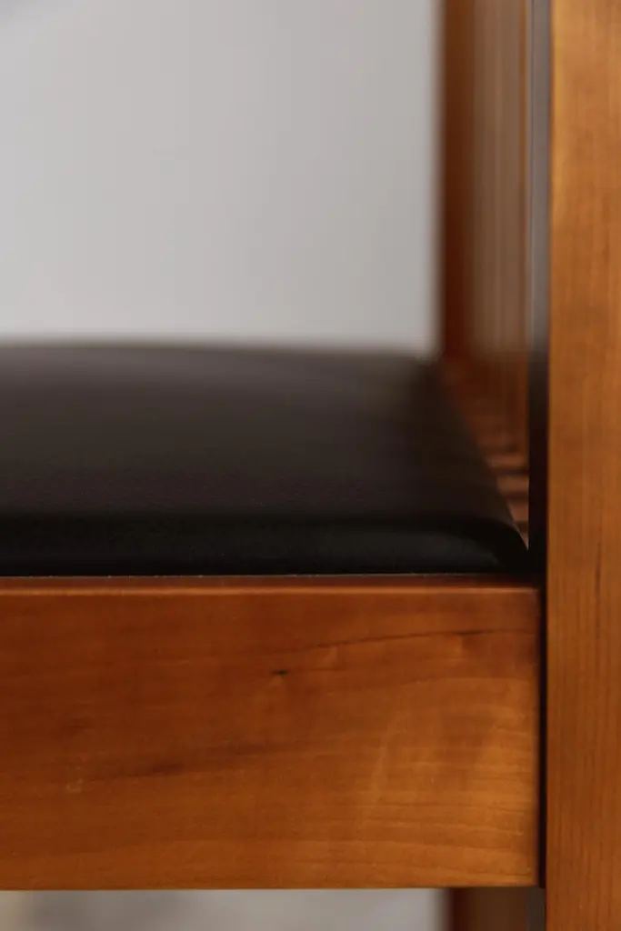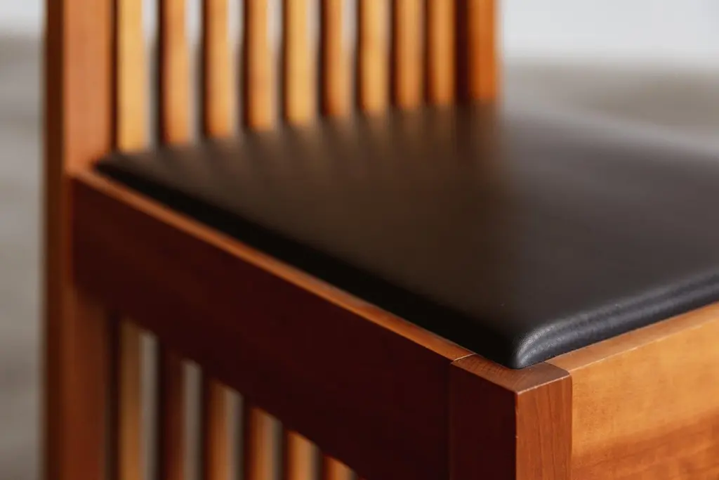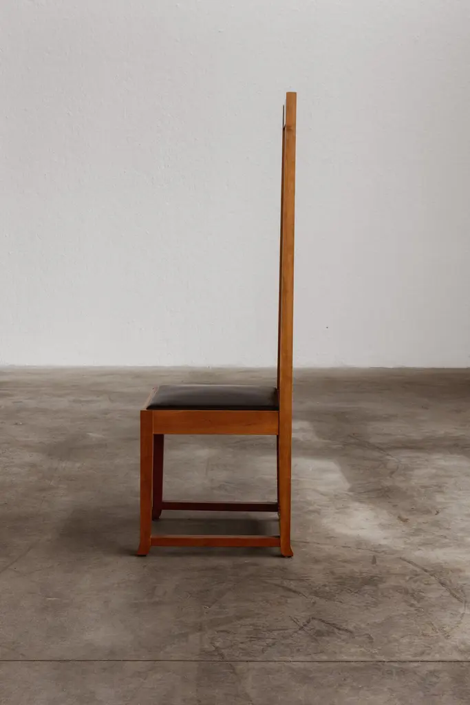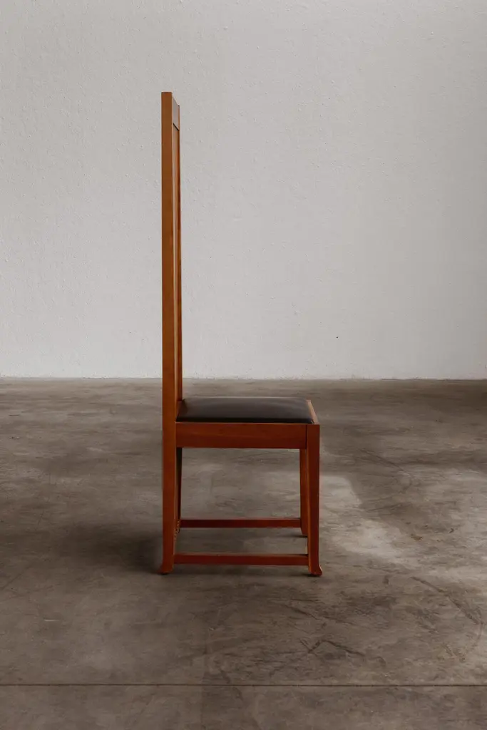 Frank Lloyd Wright "Robie" chair for Cassina, black leather and cherry, Italy, 1986. This chair's rigorous design exemplifies Frank Lloyd Wright's design ethos. It's recognizable in the tall back, strong uprights and the use of wood, typical of the furniture designed for his prairie houses. Created for the dining room of Frederick C. Robie's house in 1908, Wright aimed to define and create a more intimate area around the dining table. Frank Lloyd Wright (1867-1959) developed a cohesive vision of architecture and design. His visionary creations showcase natural materials in their original state, fostering an eco-friendly design. He emphasized craftsmanship while embracing technology’s ability to make design accessible to all. Apart from his revolutionary buildings, he created furnishings and other custom elements.Our atelier carefully checked the chairs. All the signs and imperfections on the surface are natural leather features, enhancing the material's natural beauty.