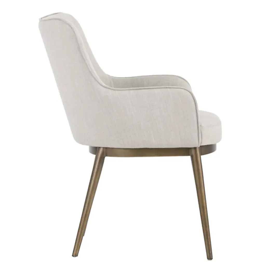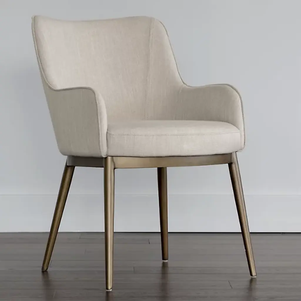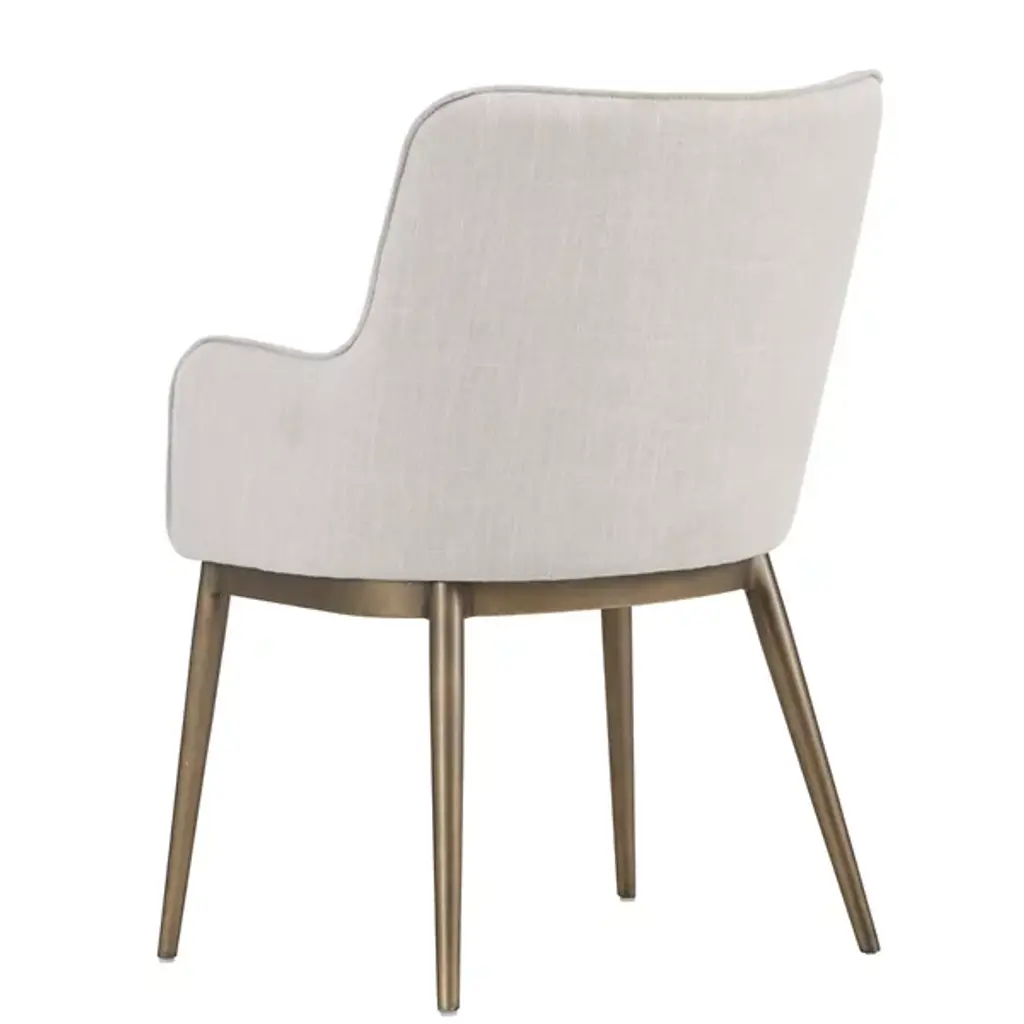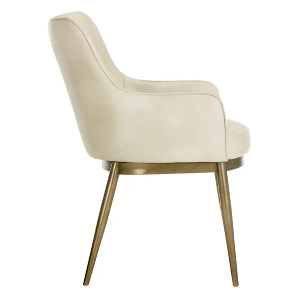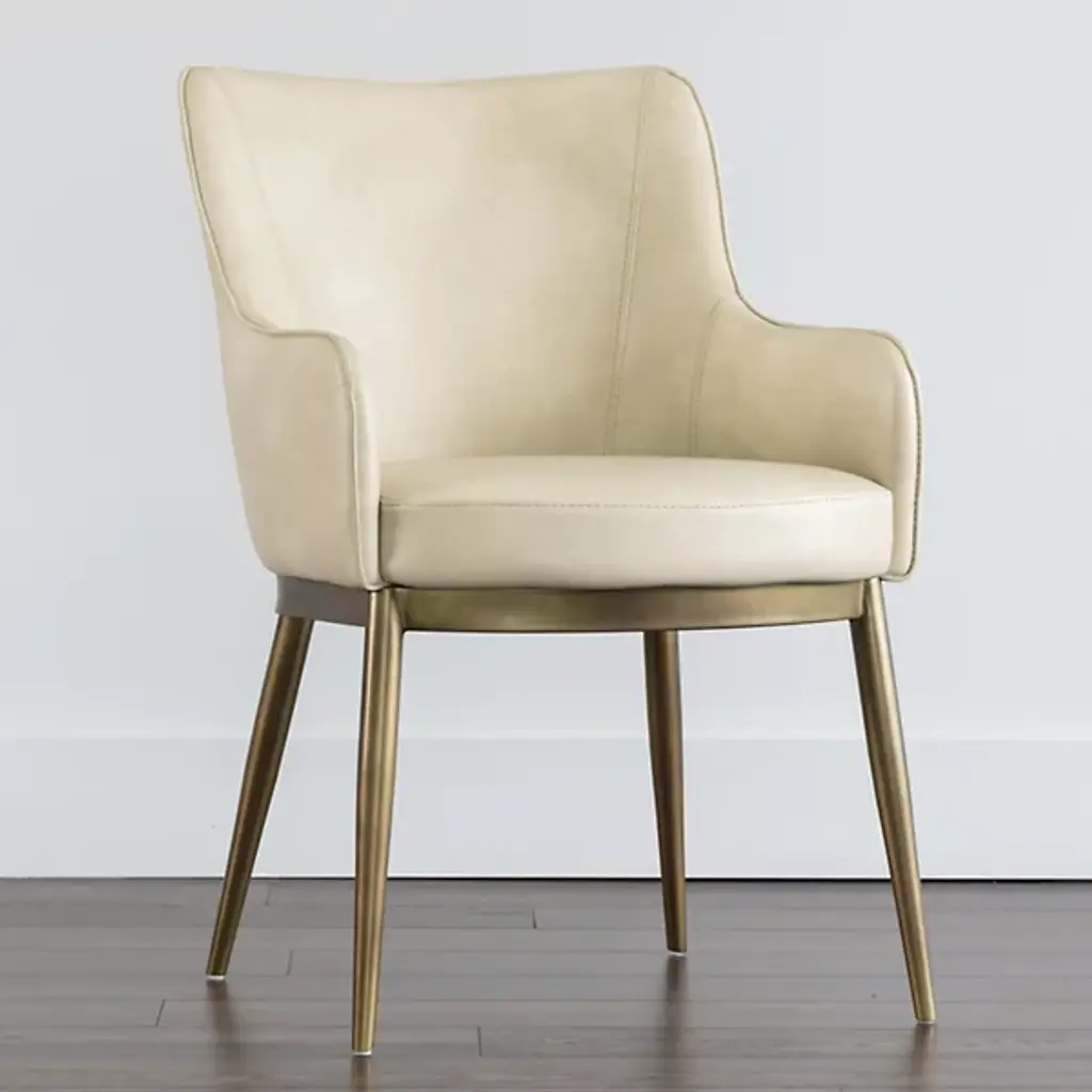 Presented by Sunpan, the Franklin Dining Armchair is an elegant and compact seating option. The chair showcases a compact barrel back design, providing both support and a streamlined aesthetic. The faux leather upholstery, adorned with artisan-applied touches, replicates the look of genuine leather, with subtle variations that give each piece a unique charm. The steel legs gracefully sit at a slightly tapered angle, while foam filling in the seating area ensures a comfortable and enjoyable dining experience.