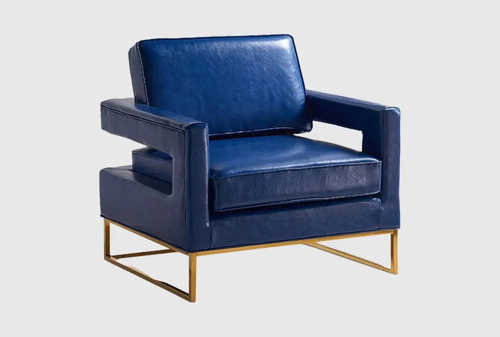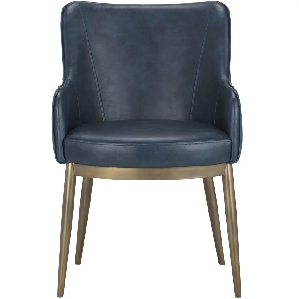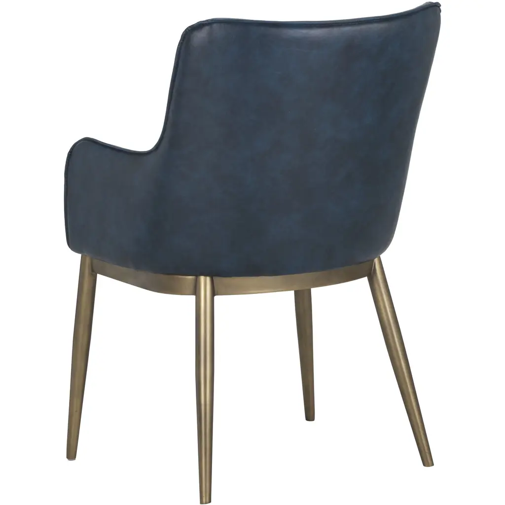 This compact barrel back armchair will add rustic and mid-century modern styling to dining and living spaces. Stocked in our vintage blue faux leather with antique brass steel frame and legs. Handle With Care: This design has been crafted with faux leather. Faux leather is manufactured to reflect the natural characteristics of leather as such, colour variations, markings, wrinkles, grooves, and light scratches are appreciated characteristics. No two pieces will be alike. Visit our Product Care page for more information on how to ensure the lasting beauty of this piece.
