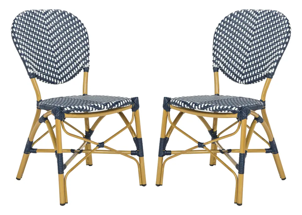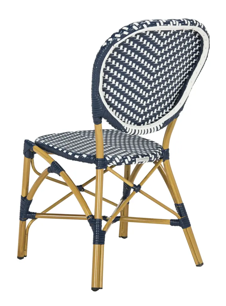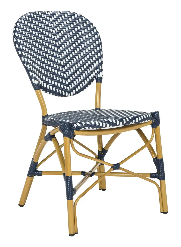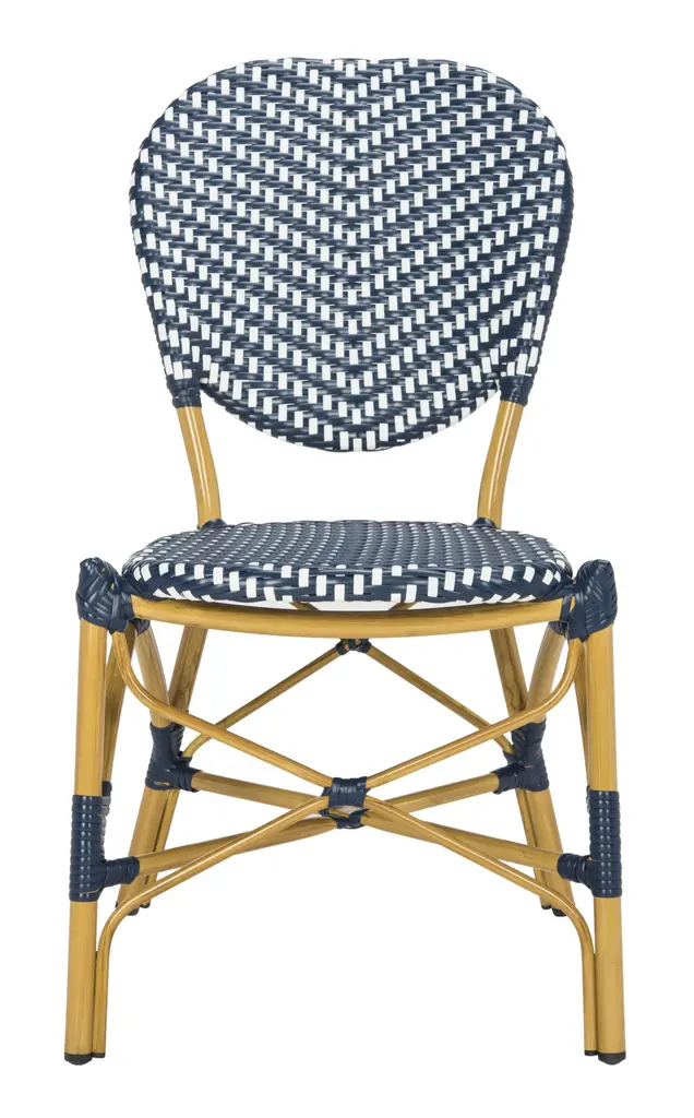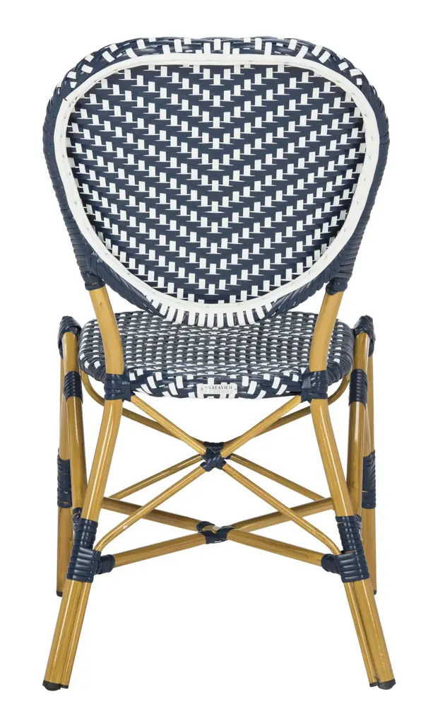 Escape to your favorite Parisian café with this French bistro stacking side chair. it's navy and white pattern is ideal for the kitchen, porch or dining room. Designers love it's authentic wicker style that adds just the right touch of je ne sais quoi. Store outdoor furniture indoors or cover well when not in use. Remove wooden furniture from standing water. Dust regularly with small brush or vacuum. Spills should be taken care of immediately before they harden or stain with a slightly dampened sponge. Do not use bleach solutions.