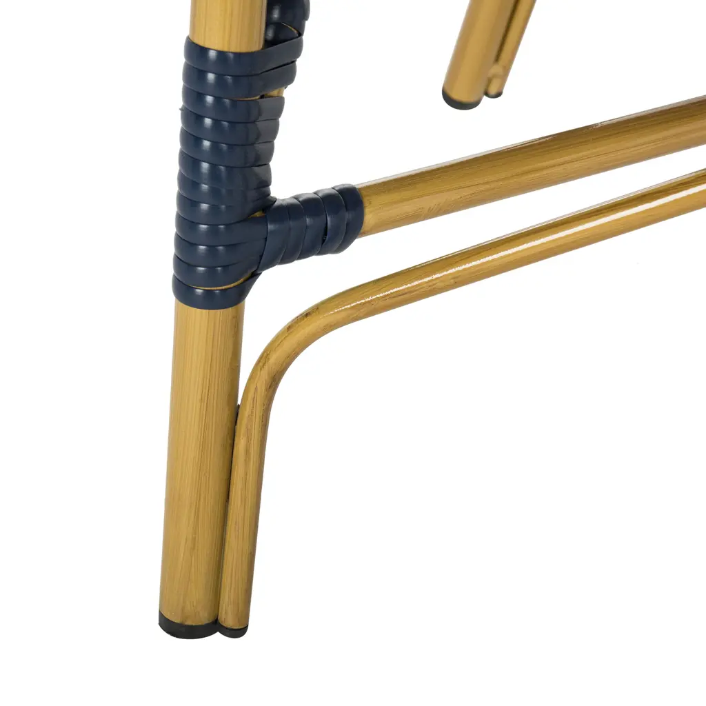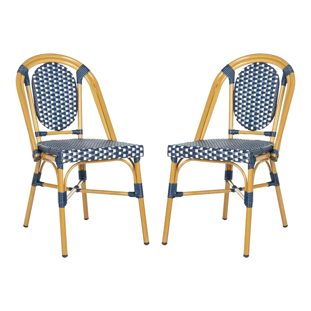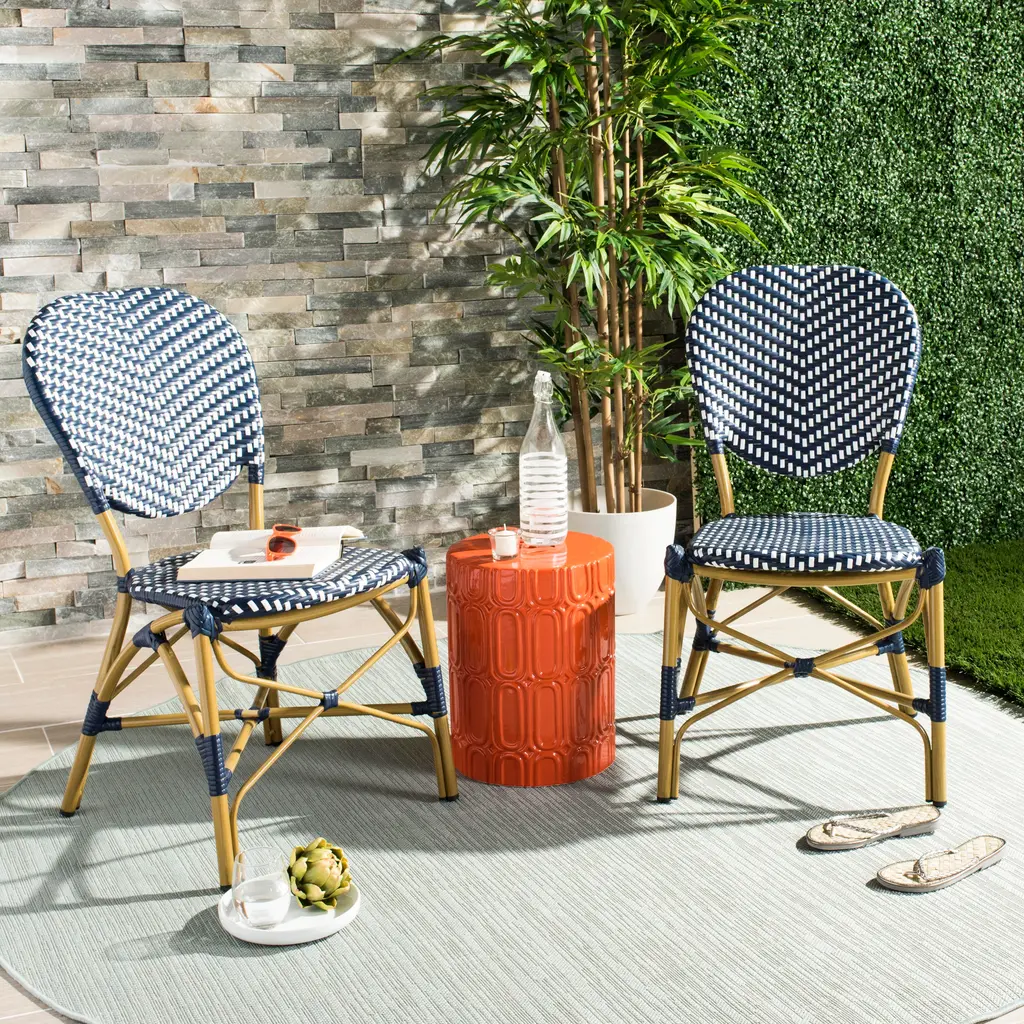 Escape to your favorite Parisian café with this French bistro stacking side chair. it's navy and white pattern is ideal for the kitchen, porch or dining room. Designers love it's authentic wicker style that adds just the right touch of je ne sais quoi. Store outdoor furniture indoors or cover well when not in use. Remove wooden furniture from standing water. Dust regularly with small brush or vacuum. Spills should be taken care of immediately before they harden or stain with a slightly dampened sponge. Do not use bleach solutions.