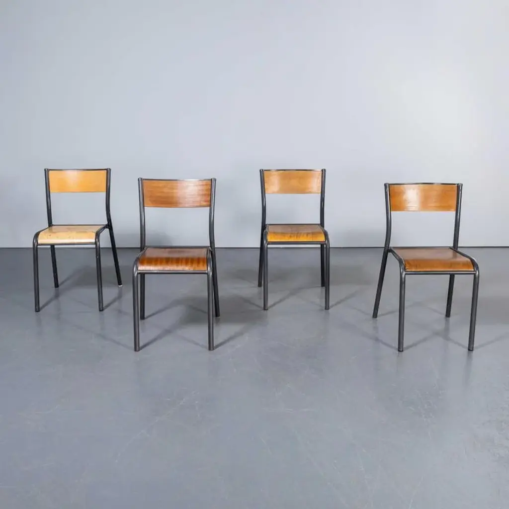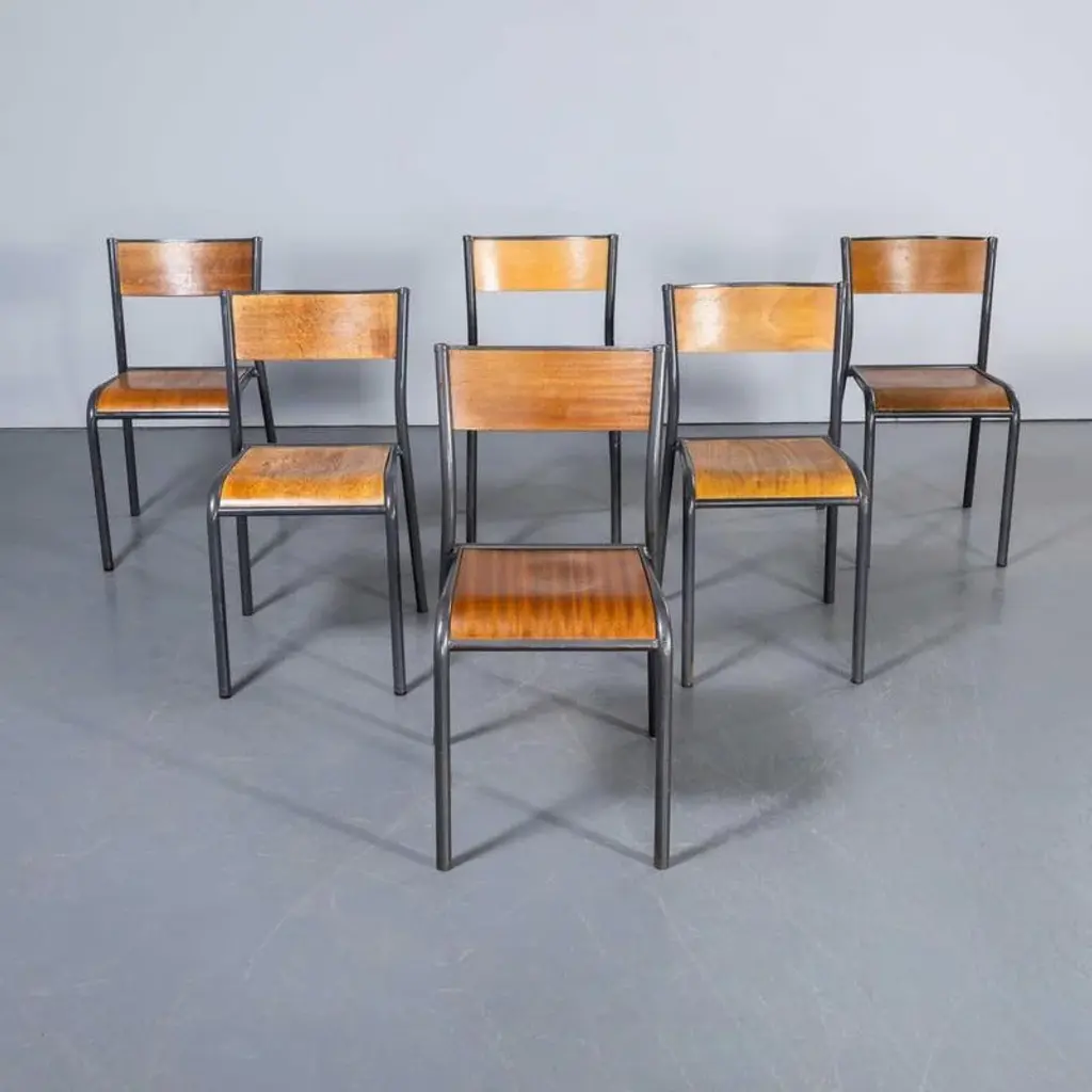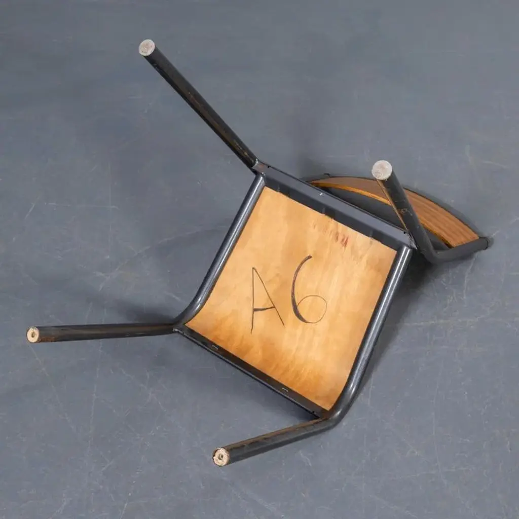 1960’S French Graphite Grey Mullca Stacking Dining Chairs - Good Quantity Available. One of our most favourite chairs, in 1947 Robert Muller and Gaston Cavaillon created the company that went on to develop arguably the most famous French school chair. Sadly the company no longer exists but vintage chairs can still be found, beautifully made with a strong tubular frame with birch seats and back inserts. Ours date from the 1960's and we love the design with the straight leg at the back and the unusual figured sapele seats and backs. Please note the listing is for one chair and they are sold as randomly selected variations in colour for the seats and backs as shown. We service and rejuvenate all our chairs individually before they leave our workshop. Seat Height 45cm. Workshop Report: Our workshop team inspect every product and carry out any needed repairs to ensure that everything leaves us serviced and maintained ready for many more years of life. All of our vintage products show the rich beauty and history of their life with the knocks and bumps of many years of use and we try to minimise restoration to keep every piece as original as possible. Date:1960's Maker:Mullca – France Dimensions:41cm(w) x 41cm(l) x 79cm(h) This piece is attributed to the mentioned designer/maker. It has no attribution mark and no official proof of authenticity, however it is well documented in design history. I take full responsibility for any authenticity issues arising from misattribution