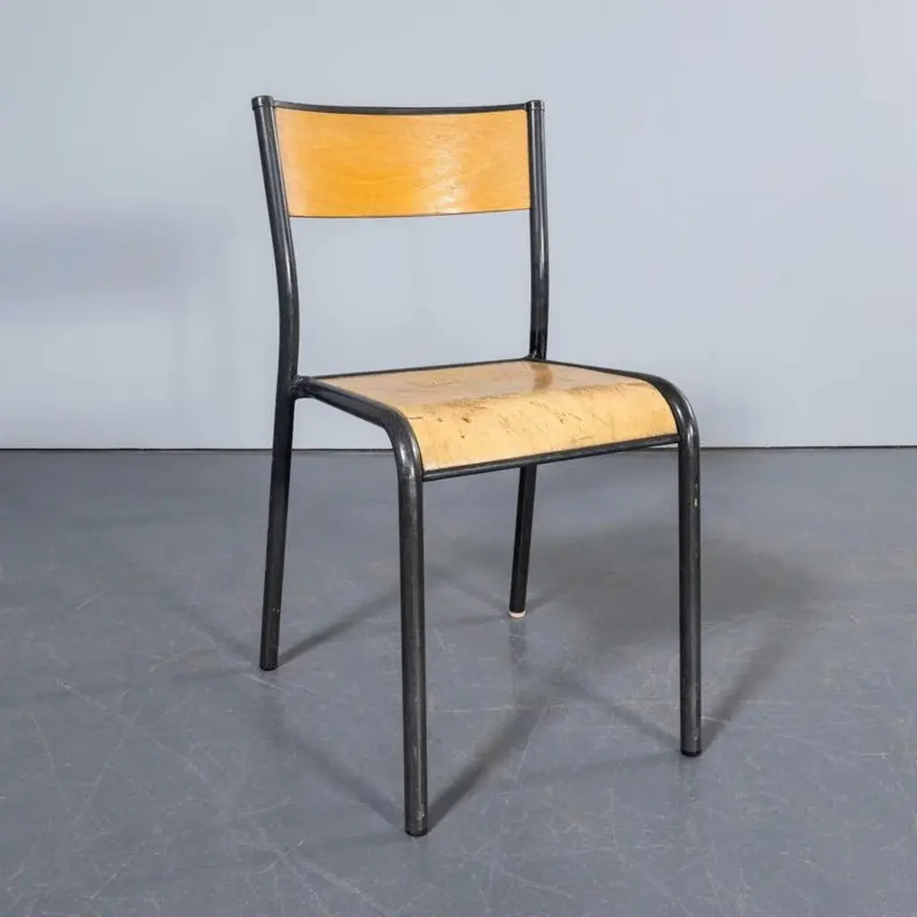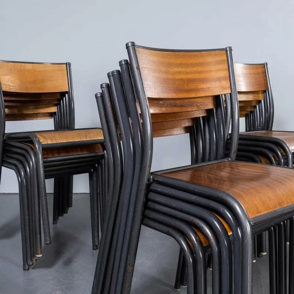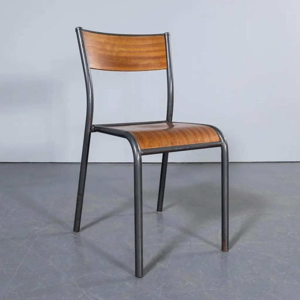 1960’S French Graphite Grey Mullca Stacking Dining Chairs - Good Quantity Available. One of our most favourite chairs, in 1947 Robert Muller and Gaston Cavaillon created the company that went on to develop arguably the most famous French school chair. Sadly the company no longer exists but vintage chairs can still be found, beautifully made with a strong tubular frame with birch seats and back inserts. Ours date from the 1960's and we love the design with the straight leg at the back and the unusual figured sapele seats and backs. Please note the listing is for one chair and they are sold as randomly selected variations in colour for the seats and backs as shown. We service and rejuvenate all our chairs individually before they leave our workshop. Seat Height 45cm. Workshop Report: Our workshop team inspect every product and carry out any needed repairs to ensure that everything leaves us serviced and maintained ready for many more years of life. All of our vintage products show the rich beauty and history of their life with the knocks and bumps of many years of use and we try to minimise restoration to keep every piece as original as possible. Date:1960's Maker:Mullca – France Dimensions:41cm(w) x 41cm(l) x 79cm(h) This piece is attributed to the mentioned designer/maker. It has no attribution mark and no official proof of authenticity, however it is well documented in design history. I take full responsibility for any authenticity issues arising from misattribution