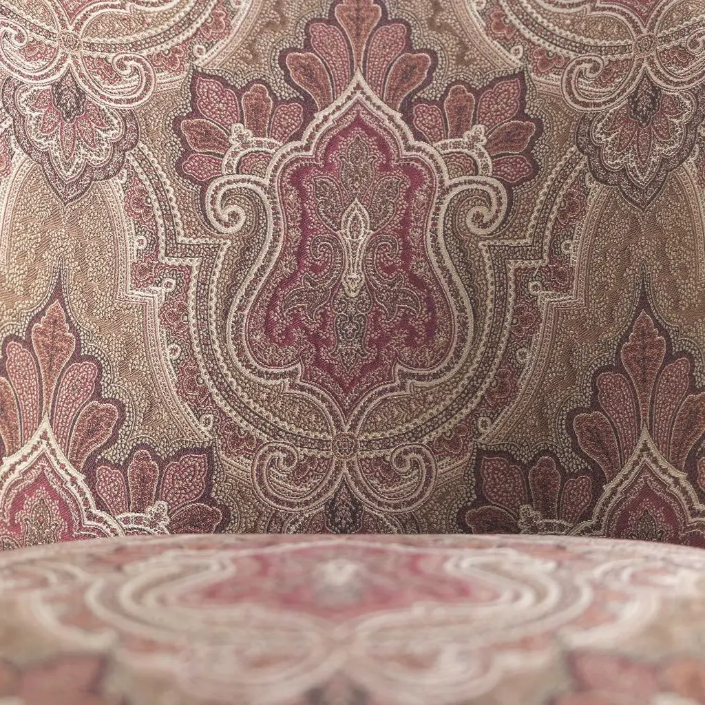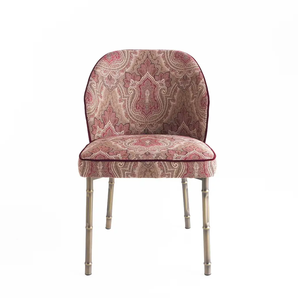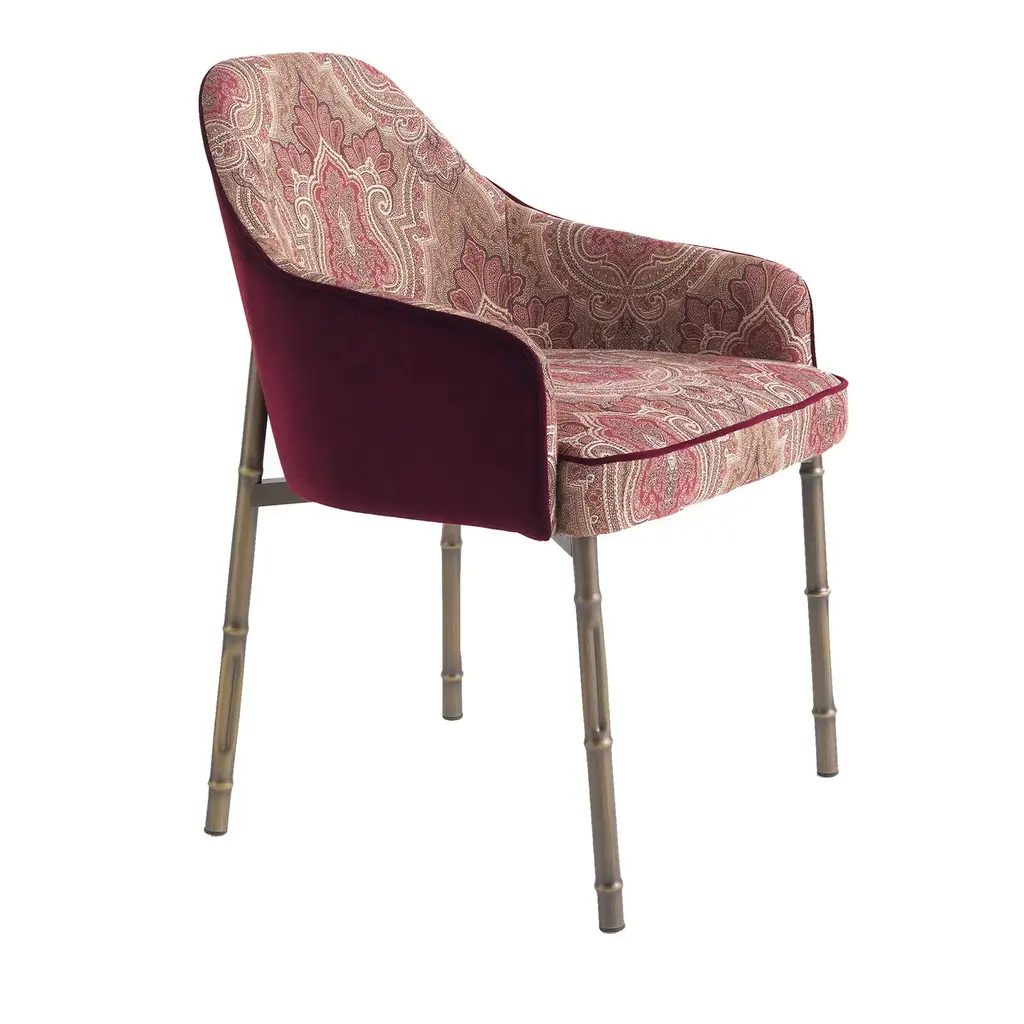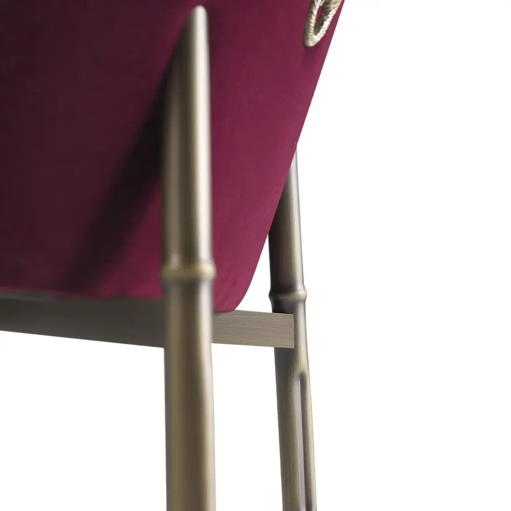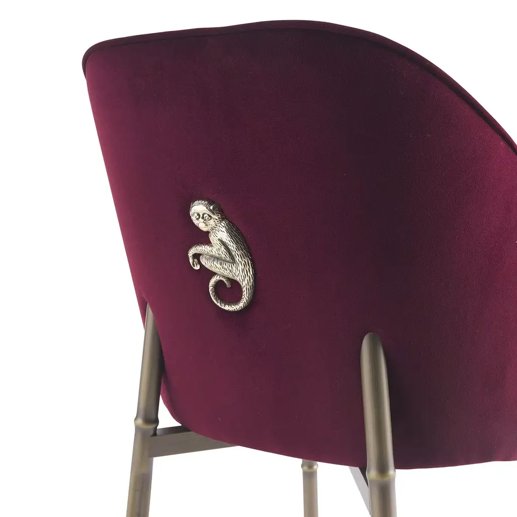 The rich Deosai cashmere of the seat, enhanced by the burgundy velvet piping that also features the back, meets the suggestions of the Asian nature, evoked by the bronzed finish legs with bamboo shape and by the precious monkey applied to the back, an exotic decorative element that characterizes Maison's collections. Structure in patinated bronze metal. Back and seat in wood and foam. Seat and inner back upholstery in fabric cat. A Deosai col. 1 Paradox. Rear back and piping in velvet cat. A Firenze col. 1 Raisin. Decorative elements in polished brass. Please ask the Concierge for available variants.