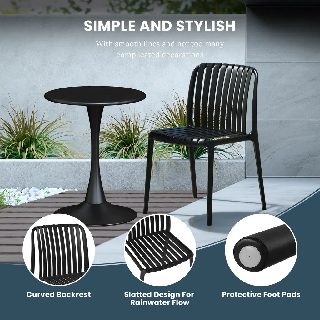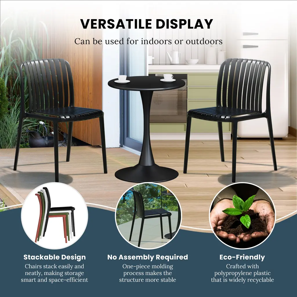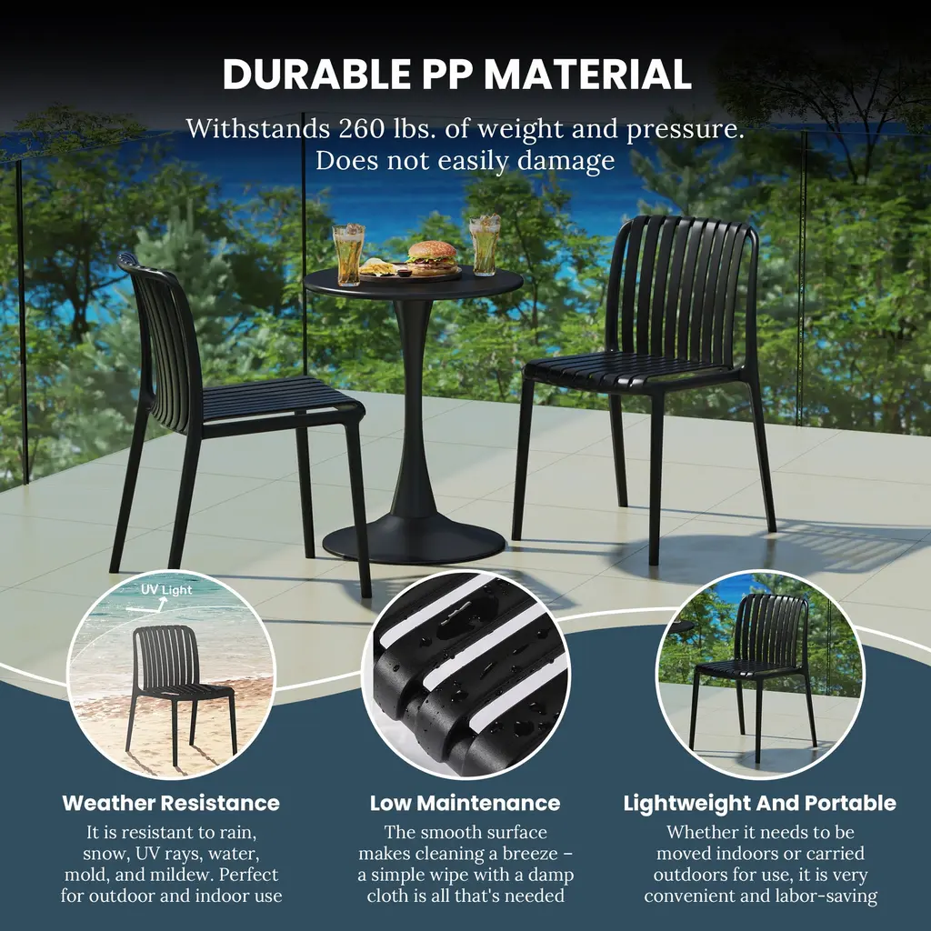 Appealing and modern style that is sure to give your balcony or outdoor terrace some added charm with this set of two modern outdoor dining chairs. Crafted from durable, all-weather PP resin, prepared to withstand the elements while retaining their vibrant color year-round thanks to their UV and fade-resistant properties. Lightweight and simple to move, they are perfect for creating a flexible dining area on even the smallest balconies or patios. Designed with comfort in mind, a ventilated backrest keeps you cool on warm summer evenings. And when not in use, they stack neatly for easy storage.While we strive to accurately represent product colors, please be aware that actual colors may vary slightly due to individual screen settings and lighting conditions. FeaturesDetails:Dining Chair