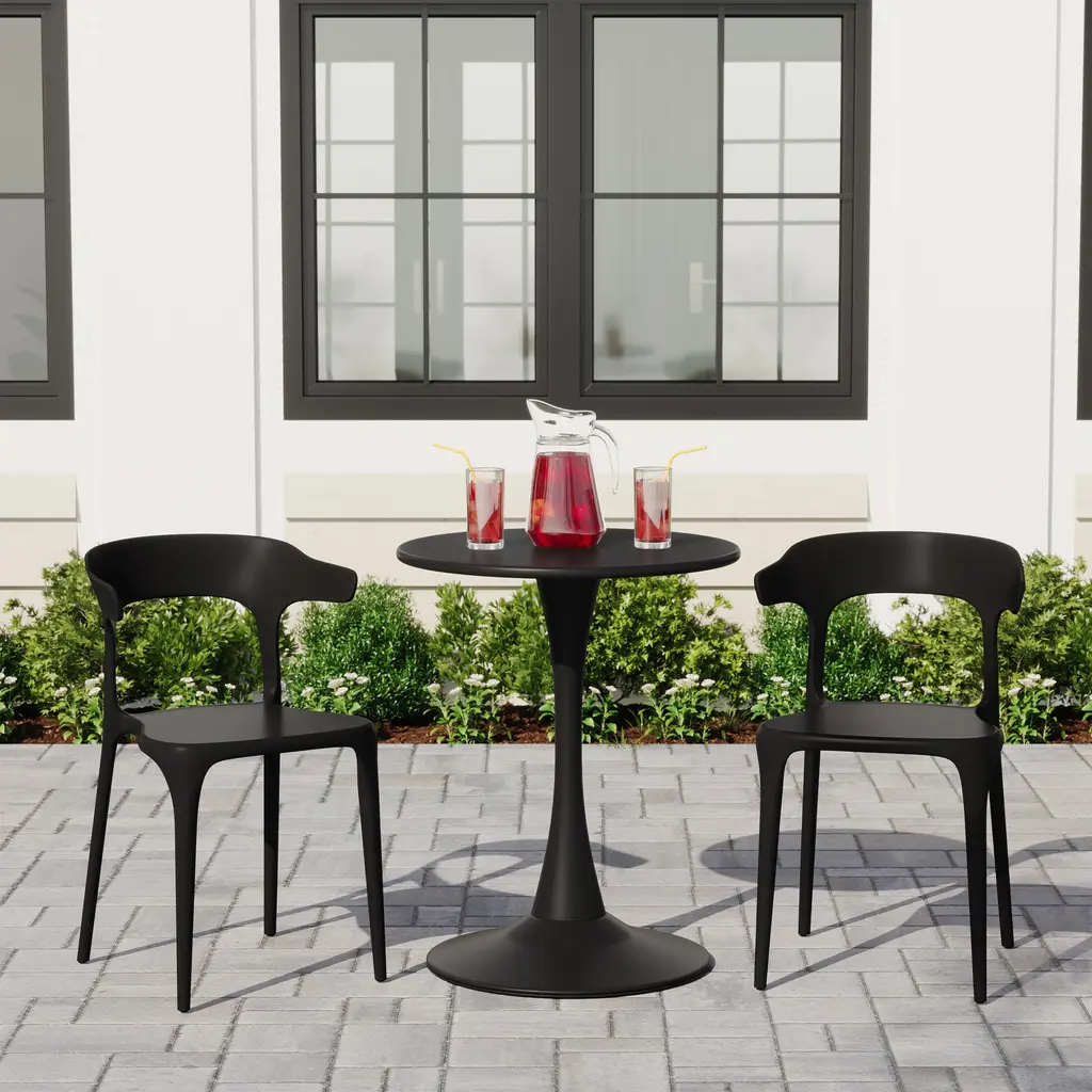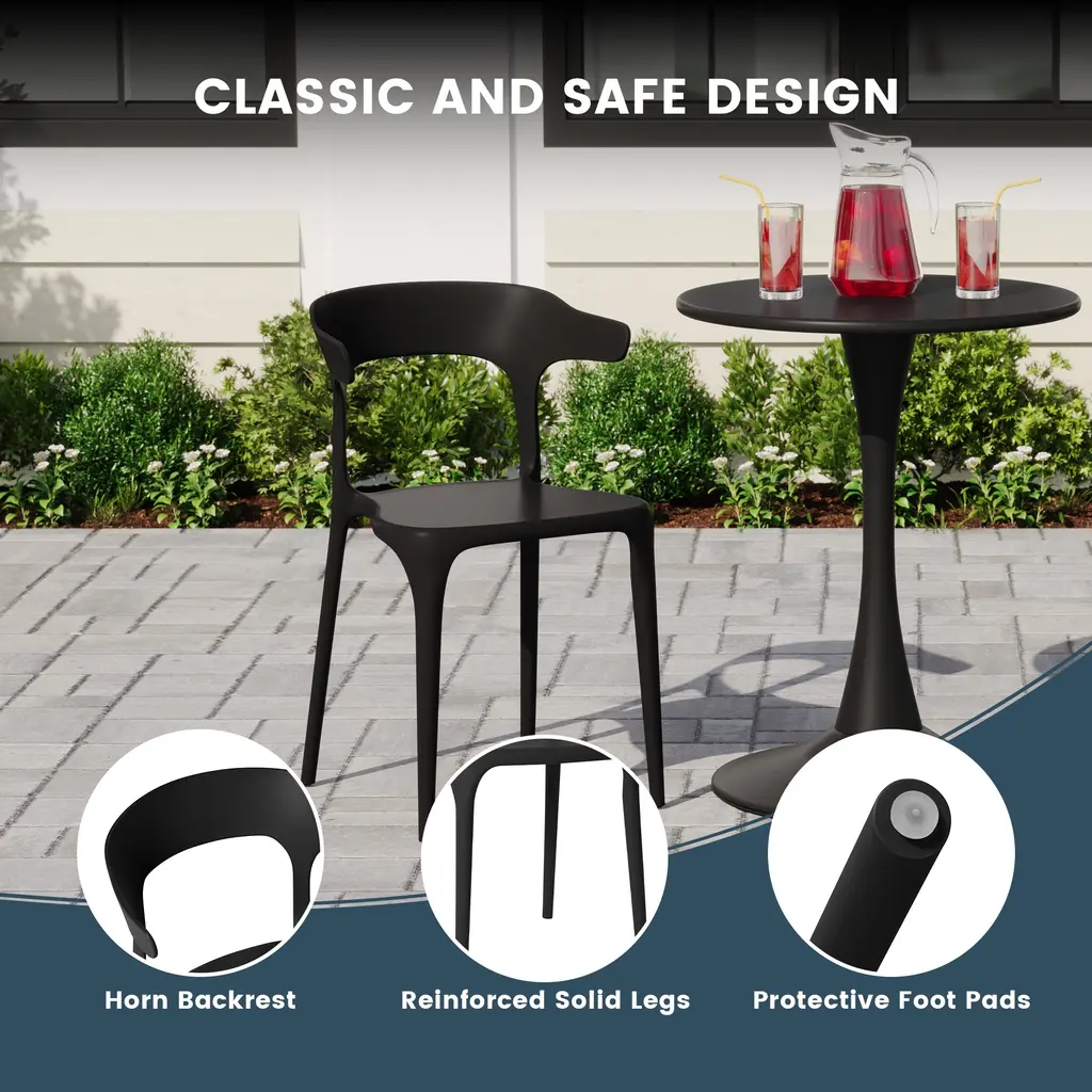 This set of two outdoor chairs features a contoured and curved silhouette, lending an artful appearance. Designed to be stackable and easily portable, adding extra dining seats to your outdoor gatherings is effortless. The generously curved, horn-shaped backrest evokes a nature feel. Crafted from 100% polypropylene resin, these chairs require minimal maintenance and arrive fully assembled making it perfect for pulling out the box and sitting down. The open backrest helps provide fresh airflow and help keep you cool during those warmer days.While we strive to accurately represent product colors, please be aware that actual colors may vary slightly due to individual screen settings and lighting conditions. FeaturesDetails:Dining Chair