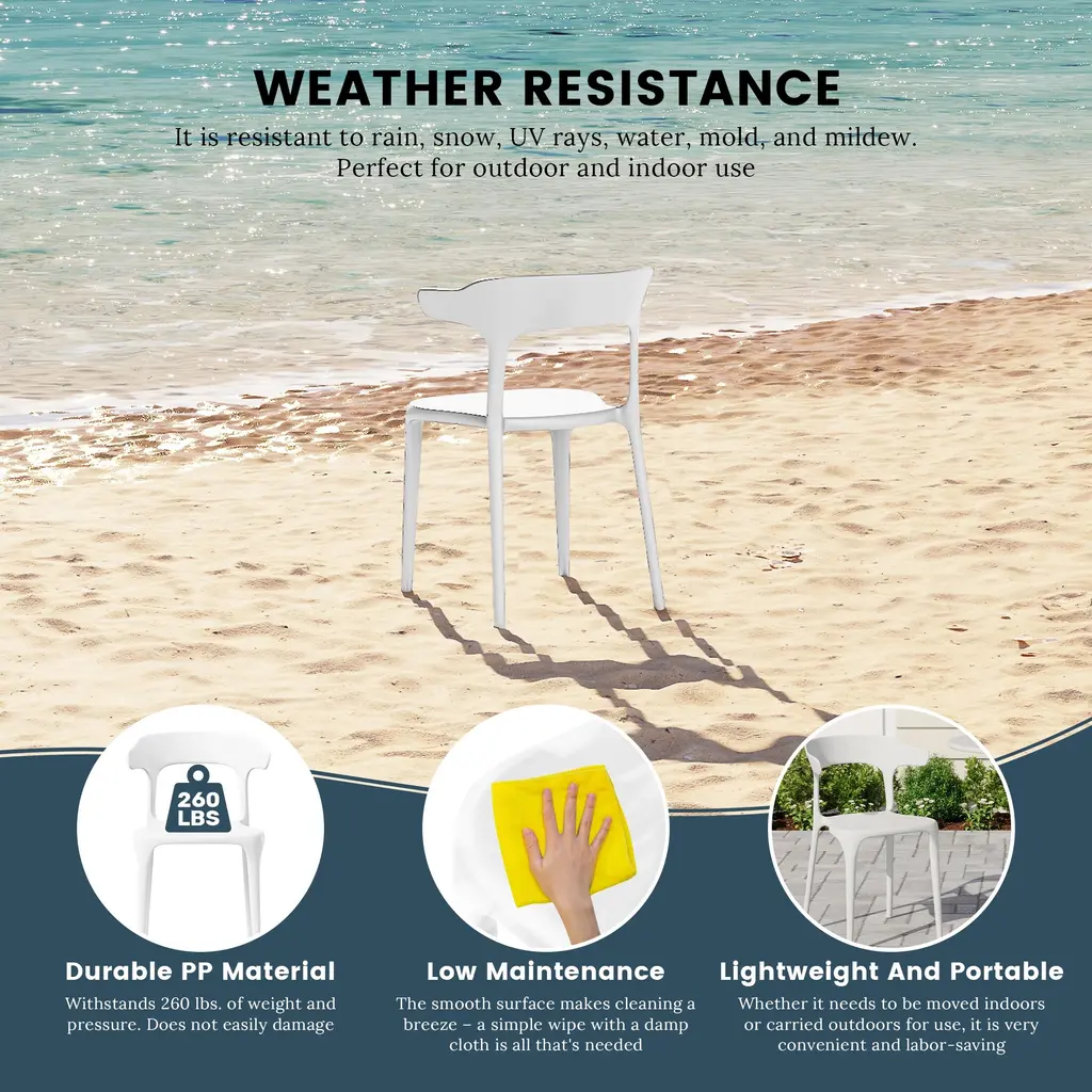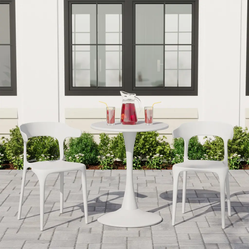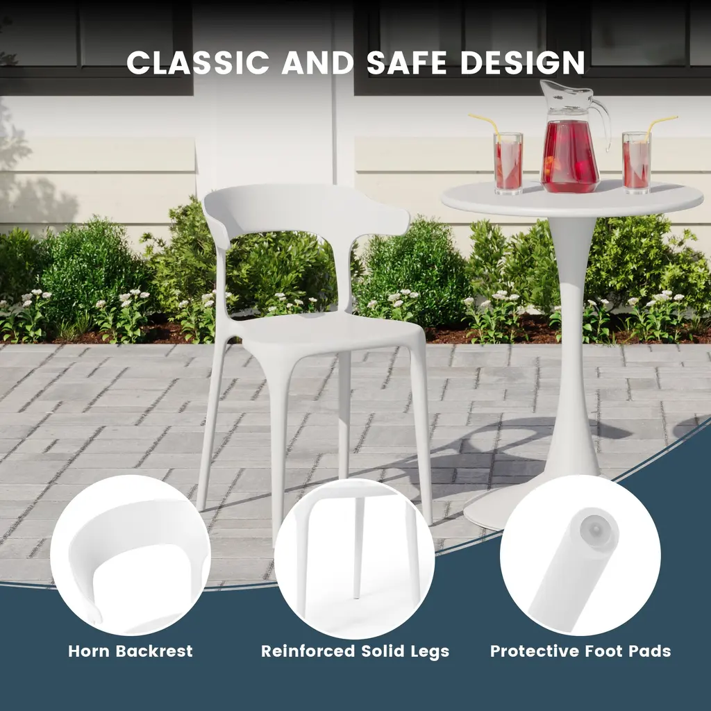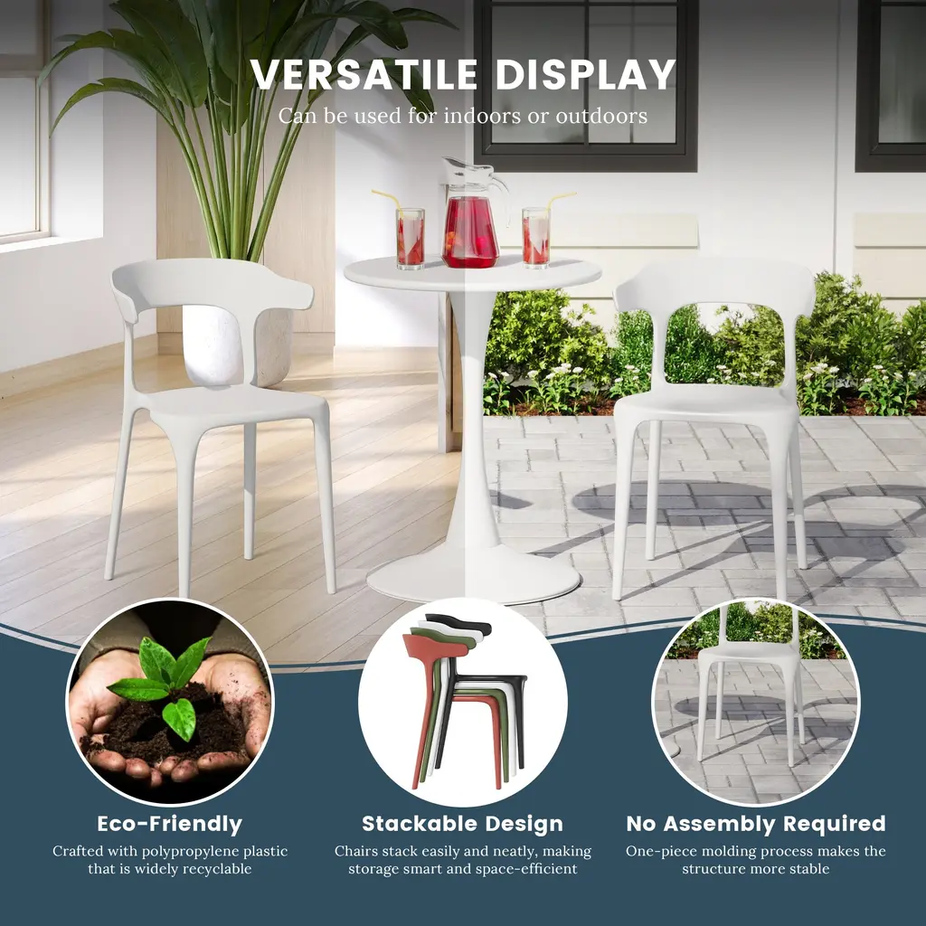 This set of two outdoor chairs features a contoured and curved silhouette, lending an artful appearance. Designed to be stackable and easily portable, adding extra dining seats to your outdoor gatherings is effortless. The generously curved, horn-shaped backrest evokes a nature feel. Crafted from 100% polypropylene resin, these chairs require minimal maintenance and arrive fully assembled making it perfect for pulling out the box and sitting down. The open backrest helps provide fresh airflow and help keep you cool during those warmer days.While we strive to accurately represent product colors, please be aware that actual colors may vary slightly due to individual screen settings and lighting conditions. FeaturesDetails:Dining Chair