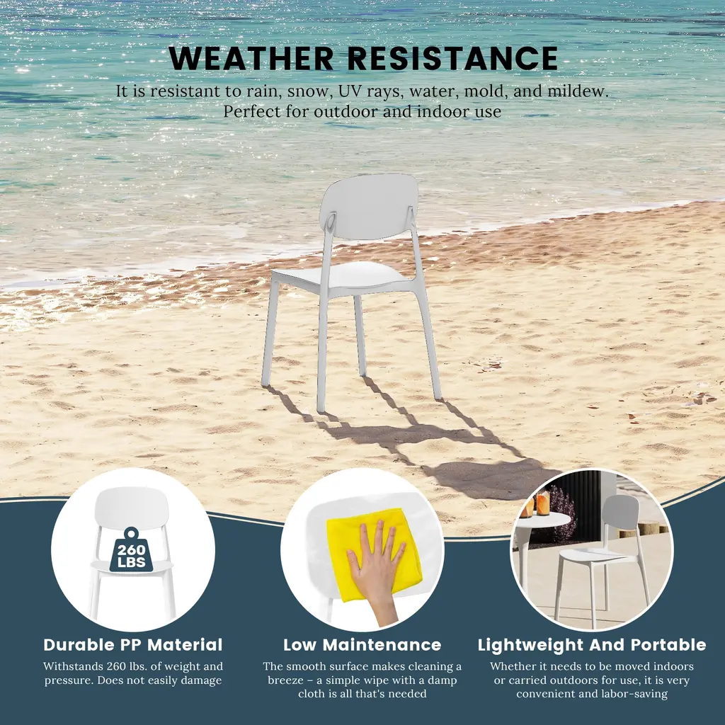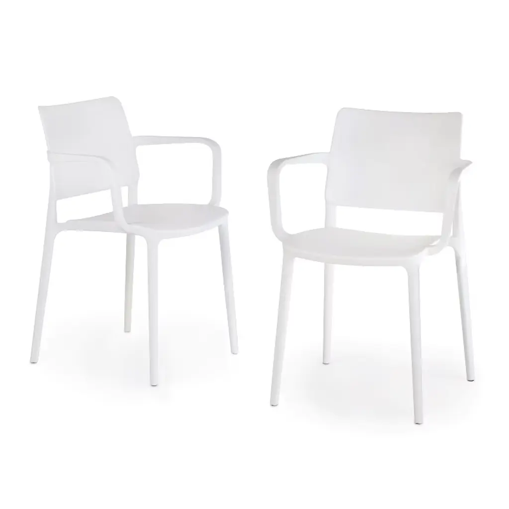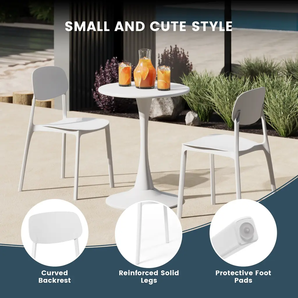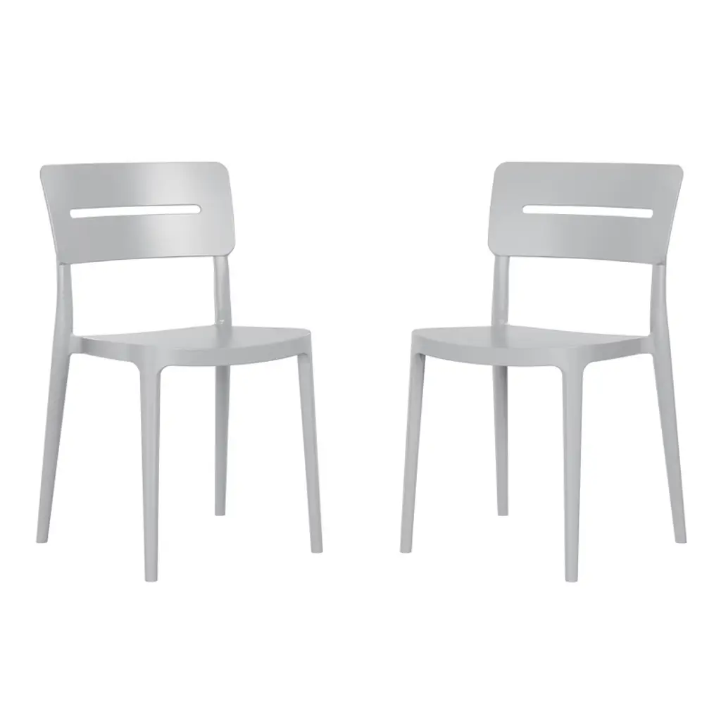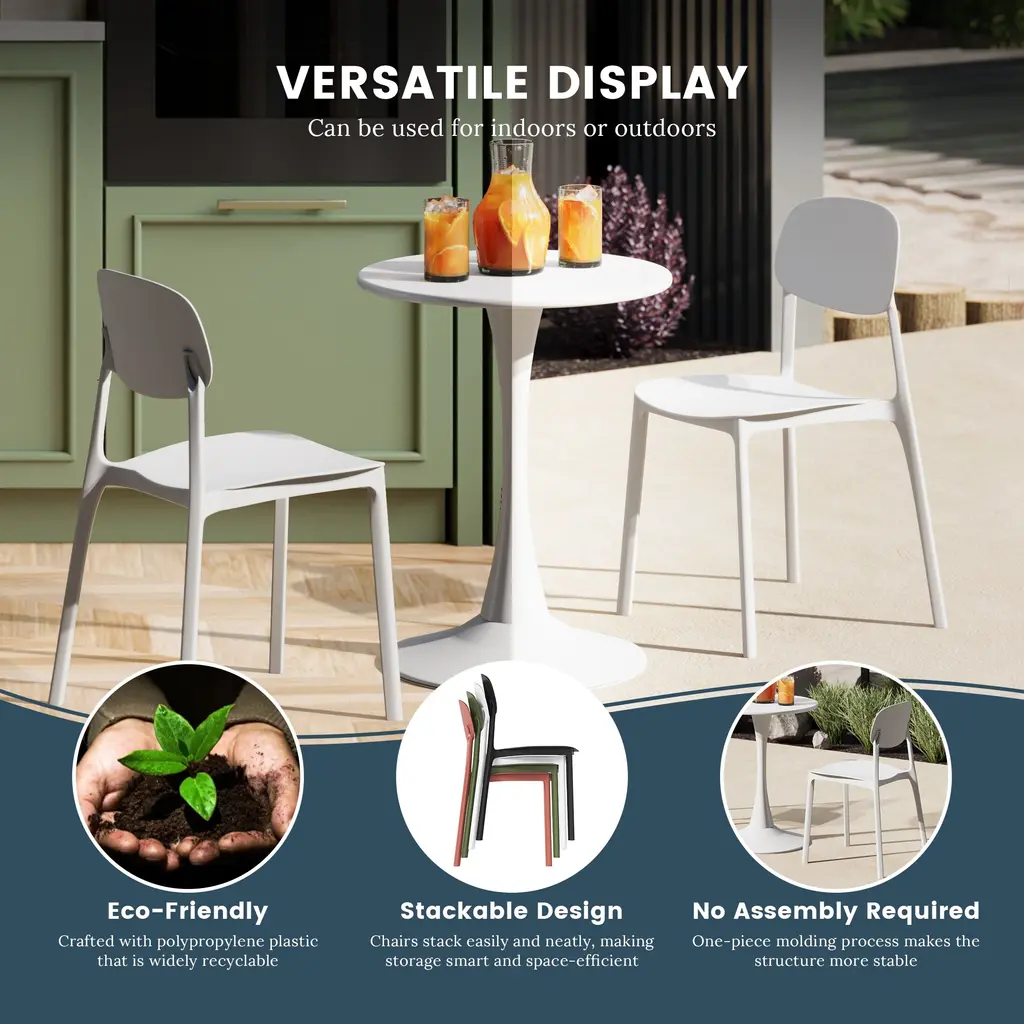 Appealing and modern style that is sure to give your balcony or outdoor terrace some added charm with this set of two modern outdoor dining chairs. Crafted from durable, all-weather PP resin, prepared to withstand the elements while retaining their vibrant color year-round thanks to their UV and fade-resistant properties. Lightweight and simple to move, they are perfect for creating a flexible dining area on even the smallest balconies or patios. Designed with comfort in mind, an backrest keeps you cool on warm summer evenings. And when not in use, they stack neatly for easy storage.While we strive to accurately represent product colors, please be aware that actual colors may vary slightly due to individual screen settings and lighting conditions. FeaturesDetails:Dining Chair