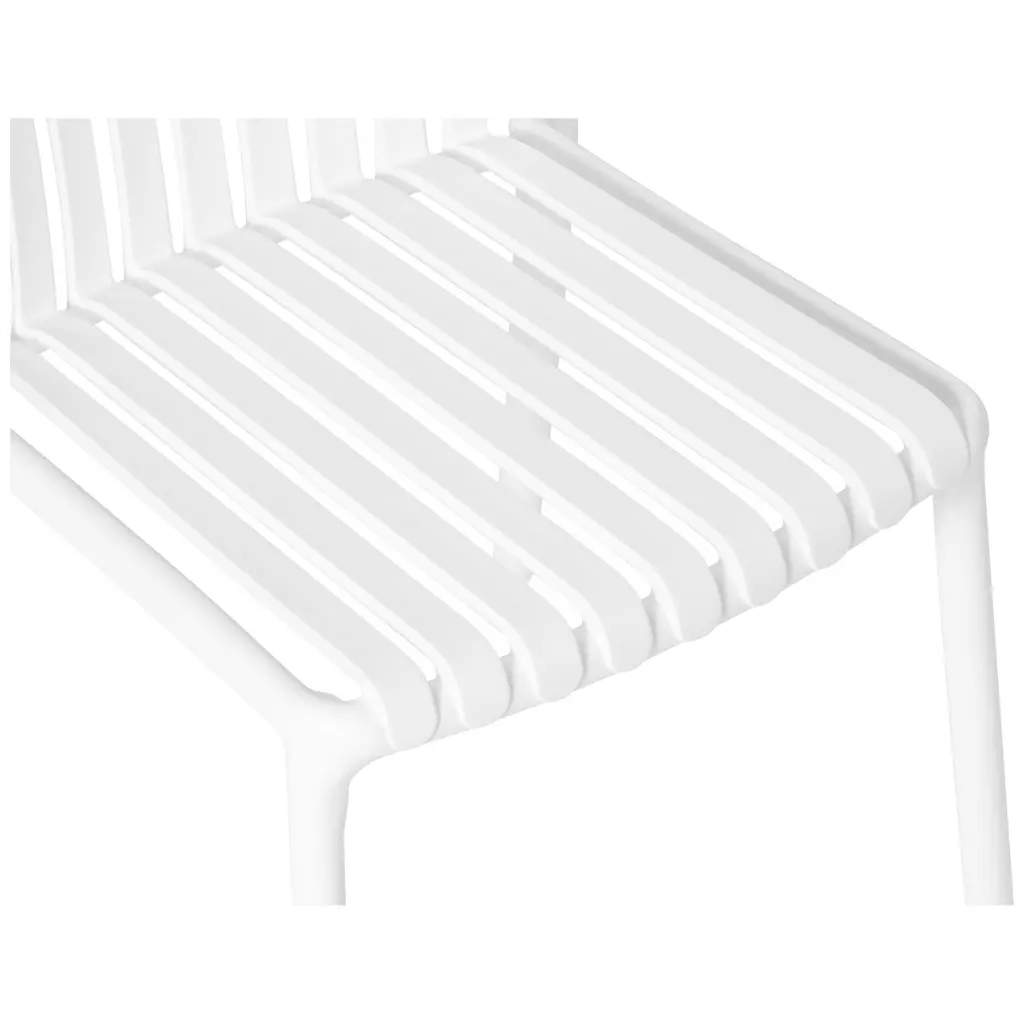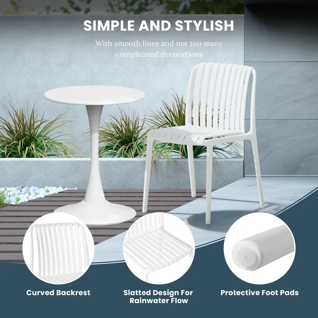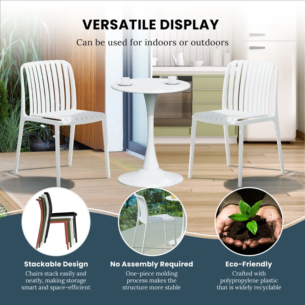 Appealing and modern style that is sure to give your balcony or outdoor terrace some added charm with this set of two modern outdoor dining chairs. Crafted from durable, all-weather PP resin, prepared to withstand the elements while retaining their vibrant color year-round thanks to their UV and fade-resistant properties. Lightweight and simple to move, they are perfect for creating a flexible dining area on even the smallest balconies or patios. Designed with comfort in mind, a ventilated backrest keeps you cool on warm summer evenings. And when not in use, they stack neatly for easy storage.While we strive to accurately represent product colors, please be aware that actual colors may vary slightly due to individual screen settings and lighting conditions. FeaturesDetails:Dining Chair